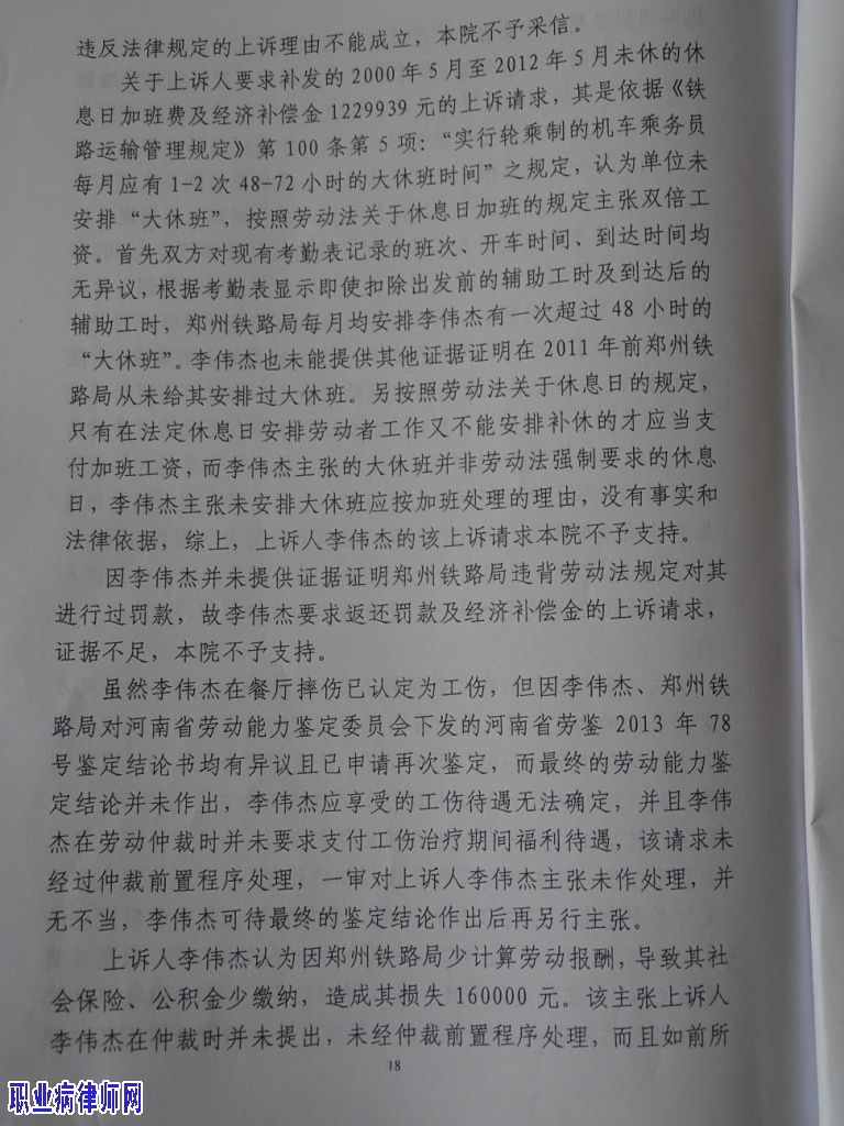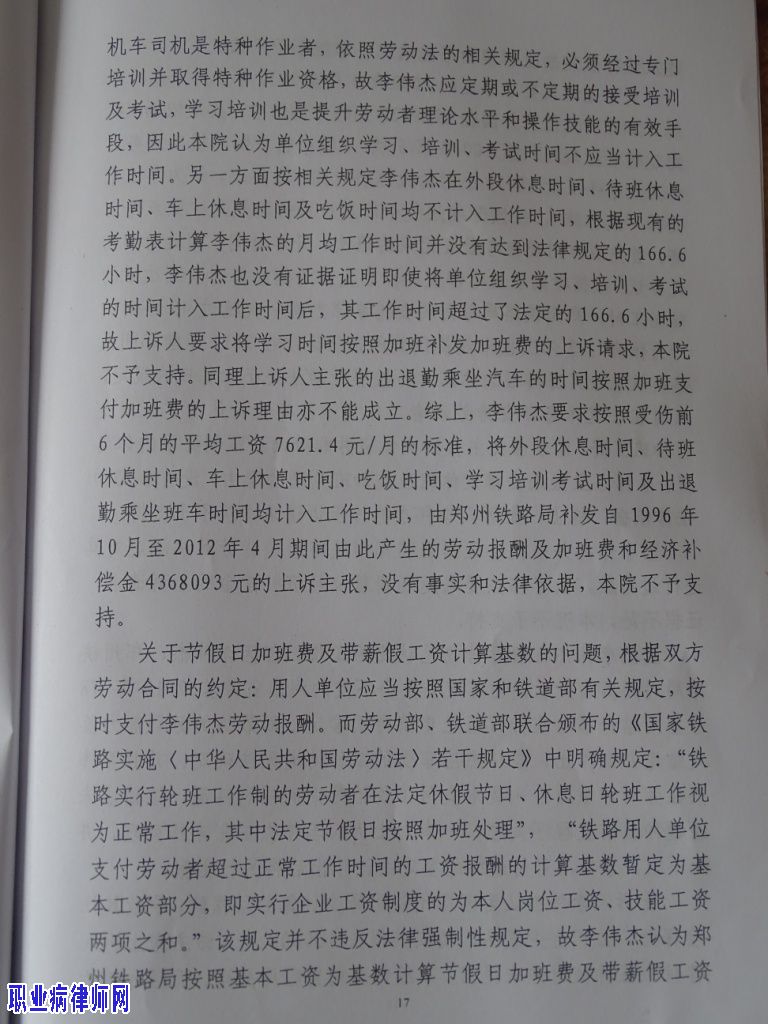 看了这样的判决,只能无语。你可以说未经仲裁前置的不支持,也可以说超过多少多少年的主张因证据不足而不支持,但你总不能完全不顾一名铁路司机一年中超过6成的时间都在外面的事实,然后拿着一份根本未经劳动者签字的考勤表,说双方确认了,而你最不应该说的就是,对铁路司机的所有培训都是为了提升司机的技能:究竟提升了什么技能呢?新车构造?故障排修?机车操作?——貌视这些大车司机是上了火车才从ABC开始培训的,或者他们的全部特种作业证书都是工作二十年后才通过在岗培训取得的,那之前上万公里铁路上亿运行时间的安全都怎么保证来的?无证上岗的?可能吗?!如果二审法院只是为了再次重复一审判决才推出终审判决,而对于上诉人的全部申辩置若罔闻不屑回应,那判决的公正,就让公众和历史来评价吧。