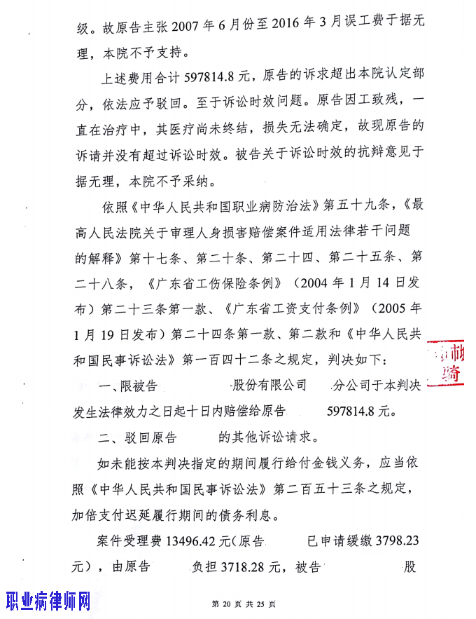 下午收到团队尹晶律师发来的某地职业性白血病(三级)诉求民事赔偿一审判决书。历时一年有余,绝大部分获得支持。当然,是暂时的。估计用人单位某大型央企会跳起来,二审是多半会有了。