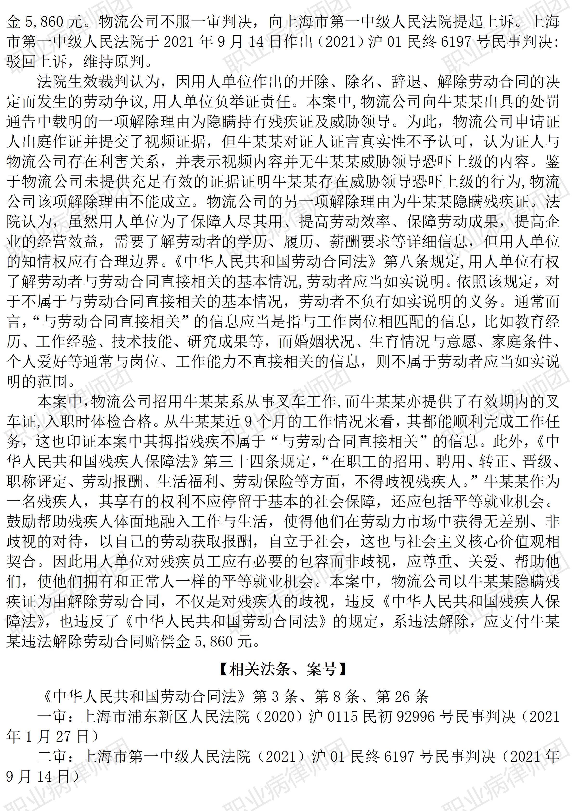 (高铁外的广西) 以案说法286|职业病相关公报入库案例29:用人单位的知情权应有合理边界 本案案号:(2021)沪01民终6197号 入库编号:2023-07-2-186-008 案例编号:5.1.29 OCA29 【基本案情】 【律师说法】 本案是一宗涉及用人单位知情权的违法解除案件。单凭用人单位以劳动者隐瞒残疾而解除而论,本案似乎很难算得上典型案件。但本案生效裁判对用人单位知情权的合理限制之认定非常精彩,这或许是本案得以成为最高人民法院案例库入库案例重要理由。 而本案的典型之处还在于,劳动者强调的用人单位解除理由与用人单位主张的解除理由完全不对应,而且反差过大,劳动者认为用人单位在为领导泄私愤报私仇,用人单位则指责劳动者隐瞒残疾且入职后索取不正当待遇未果后辱骂领导。而结合用人单位的举证,似乎劳动者所持报复说更能成立,而用人单位即使努力罗织证据却根本达不到合法解除的效果。 但笔者还是为要本案主审法官细致严谨明察秋毫而点赞。理由很简单,类似的纠纷,劳动者的违法解除赔偿金诉求太容易被否掉。虽然《劳动争议调解仲裁法》及相关司法解释都明确规定用人单位对单方终结劳动关系负有举证义务,但本案中用人单位毕竟所述部分属实,即劳动者确有较大残疾,又有同事出庭指证其辱骂、威胁领导,一宗毫不起眼的劳动争议,用人单位举证如此,仲裁、法院要维持其解除决定,相对还是比较容易的。反观本案劳动者,除了独自陈述,且所述内容“过于”主观印象,又并无相应证据佐证,此时要想支持其诉求,不容易。如果审理者不去仔细辨识双方证据特别是证人证言,细节中的魔鬼很容易就会溜走。而现实中类似用人单位滥行用工自主权终结劳动关系、而劳动者往往只能委屈接受被“依法”辞退的苦果。 此外,本案生效裁判并未直接从情理上为劳动者站台,也根本没有去评价劳动者所陈述的报复事实,而集中围绕用人单位的知情权作文章,将“与劳动合同直接相关”的信息界定标准作出具体描述分析,从根本上否定了用人单位指责劳动者隐瞒左手残疾的主张,进而认定其辞退行为违法。但饶是如此,劳动者主张的报复说依然是不言自明。 本案确实值得后续类案处理以为借鉴。(2025/8/29 15:29) 更多原创文章 《GBZ188-2025 职业健康监护技术规范》新旧对照简析 以案说法285|最高法入库案例:挂靠经营:可以认定工伤,但不确认劳动关系 以案说法271|职业病相关公报入库案例15:最高法裁定:劳动者未配合离岗体检,视为弃权 职业病问答65|用人单位注销后,职业病病人还能被认定工伤吗? 【收官】“职业病法律”公众号全部推文汇总(501-1000) |