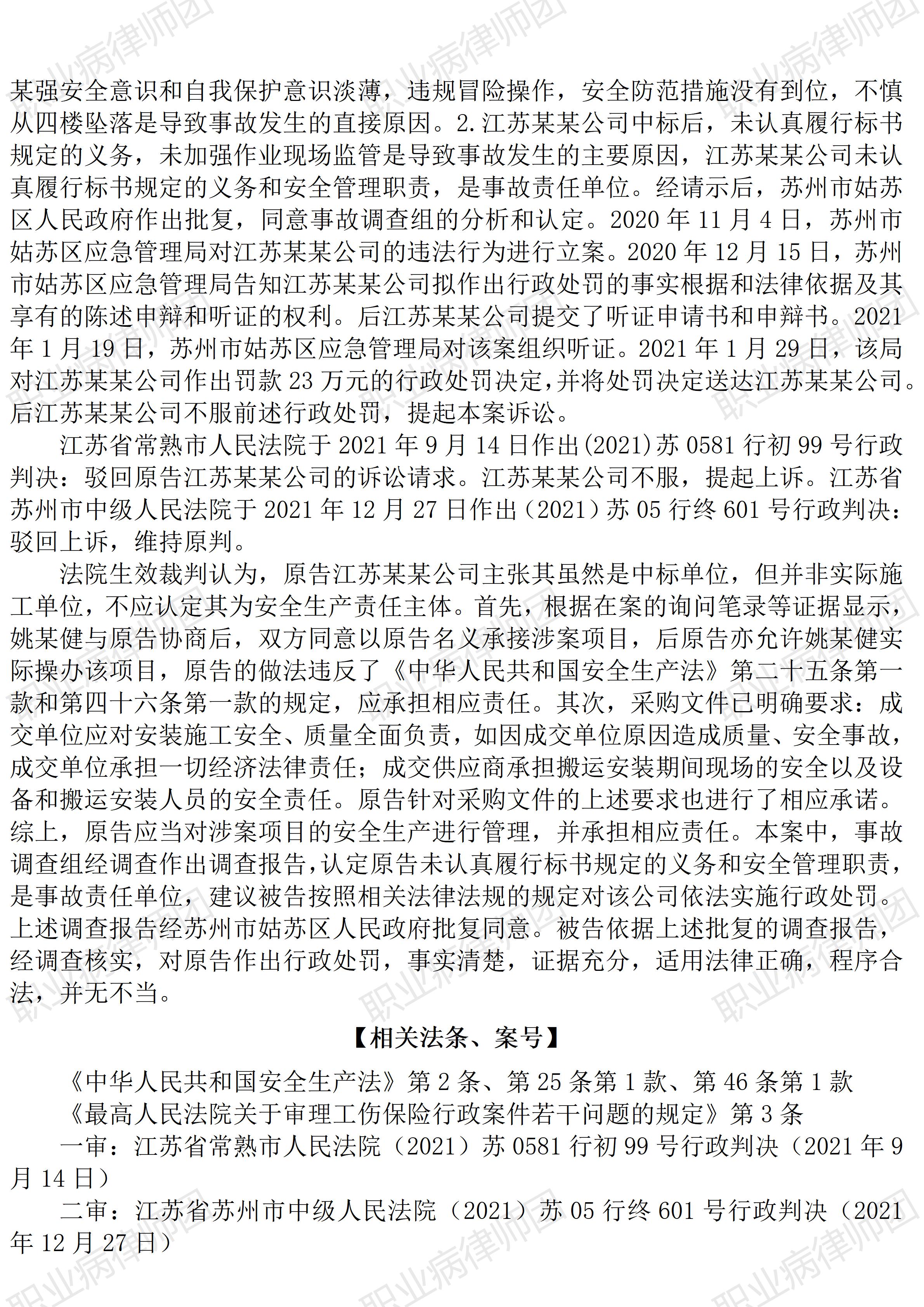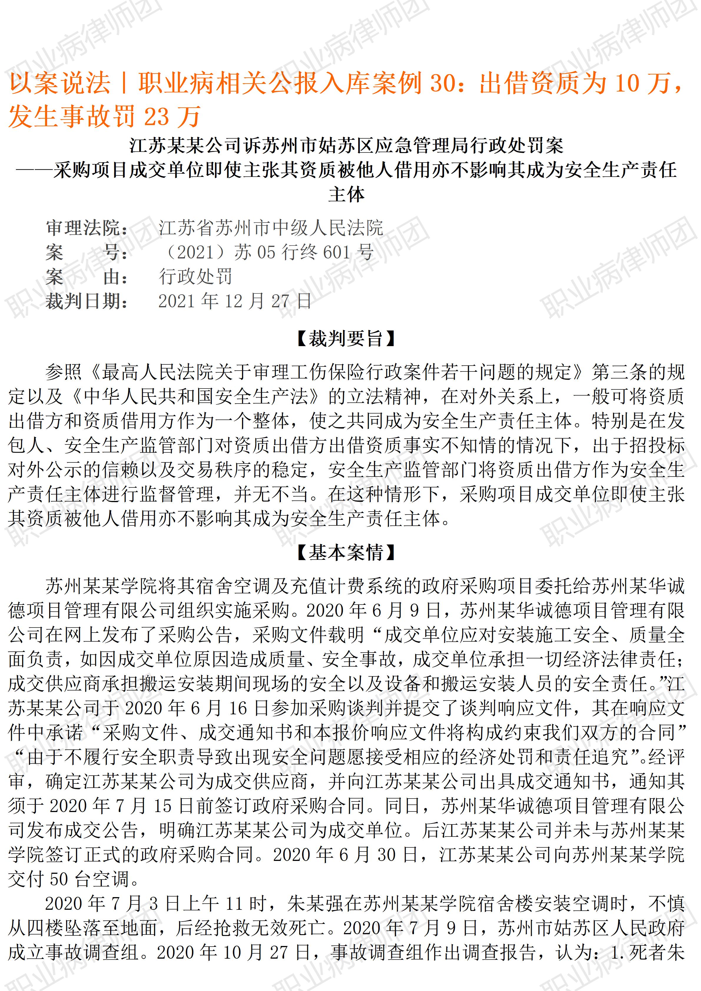 以案说法287|最高法入库案例:出借资质赚10万,发生事故罚23万以案说法287|职业病相关公报入库案例30:出借资质赚10万,发生事故罚23万 本案案号:(2021)苏05行终601号 入库编号: 2023-12-3-001-021 案例编号:5.1.30 OCA30 【基本案情】 【律师说法】 本案是一宗涉及出借资质成功中标后发生安全生产事故引发的安全生产行政处罚案件。类似出借资质参与投标甚至围标的事例,现实中较为常见,更常见的则是,中标单位并不实际参与项目运营,自以为只是借用资质,出了安全事故,实际运营单位自然会担责。 本案生效裁判认定,原告单位明知实际施工人无相应资质而予出借,显然违法,同时,原告在相关招投标文件中亦有就安全生产管理作出承诺,因此,无论是行政监管要求,还是民事合同约定,其均应履行安全生产义务,否则,当然应承担相应法律责任。 值得注意的是,从相关公开的裁判文书来看,这家中标公司出借资质,所收费用其实极为有限,虽然有陈述转账10万,但案涉项目仅为购买、安装50台空调,扣除成本及必要利润,其出借资质所能获取的利益应该非常有限。但在相关安全生产监管高压之下,无论生产经营单位获益多少,发生重大安全生产事故的,行政处罚起点即为20万,本案实际处罚23万,相比该公司出借资质所能获取的利益,可谓悬殊,损失惨重。 但惟有如此,高昂的违法成本重压之下,类似这种出借资质、违法转移生产业务的行为,才有望从源头得到遏制。而严监管换来的,则是劳动者生命健康与企业财产的共同安全。从这个意义上看,安全生产确实应当从严监管。 安全生产如此,职业病防治其实也一样。可惜,在这方面,职业卫生监督的力度远不如安全生产监管。(2025/8/29 16:41) 更多原创文章 《GBZ188-2025 职业健康监护技术规范》新旧对照简析 以案说法286|最高法入库案例:用人单位的知情权应有合理边界 以案说法271|职业病相关公报入库案例15:最高法裁定:劳动者未配合离岗体检,视为弃权 职业病问答65|用人单位注销后,职业病病人还能被认定工伤吗? 【收官】“职业病法律”公众号全部推文汇总(501-1000) |
