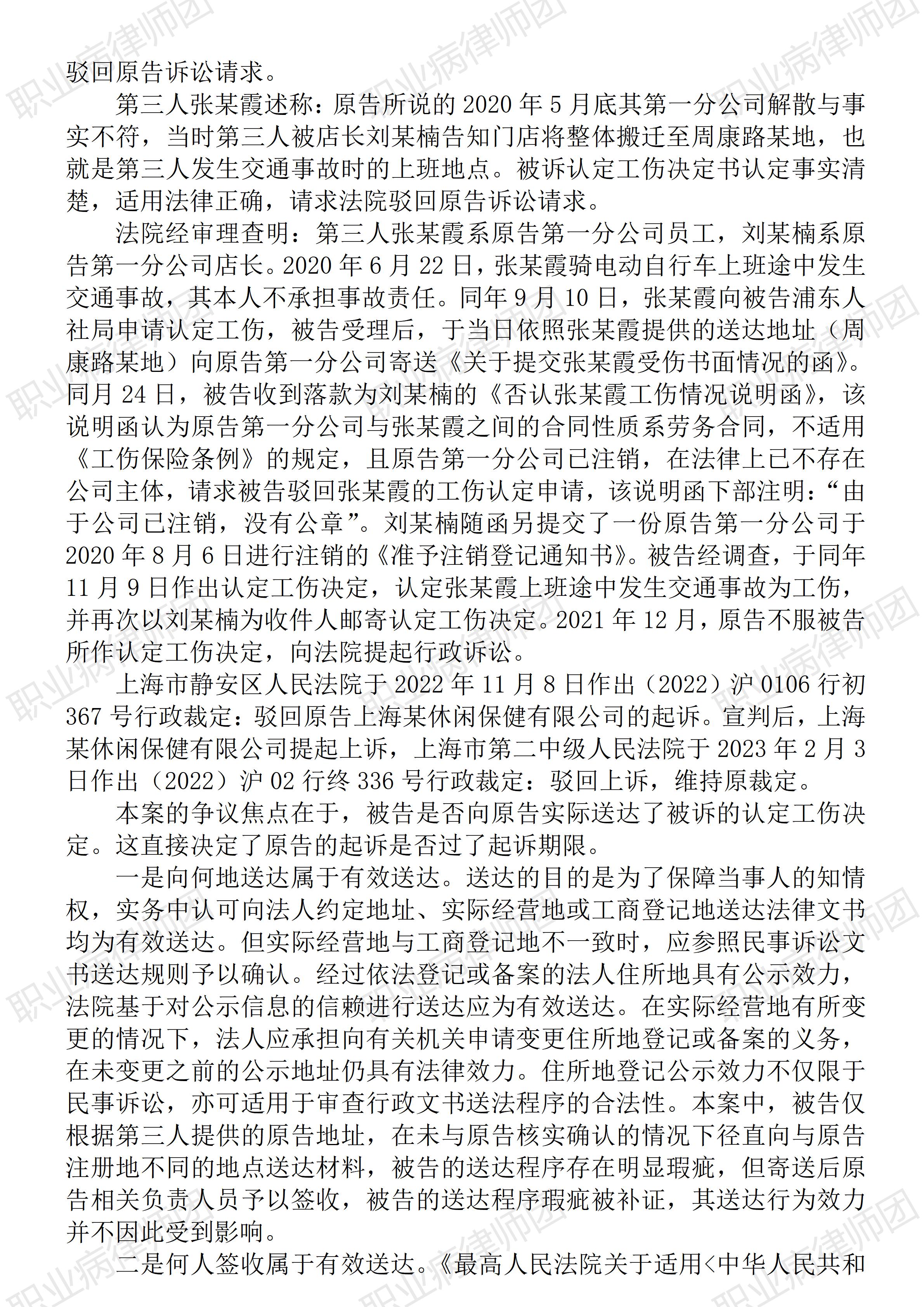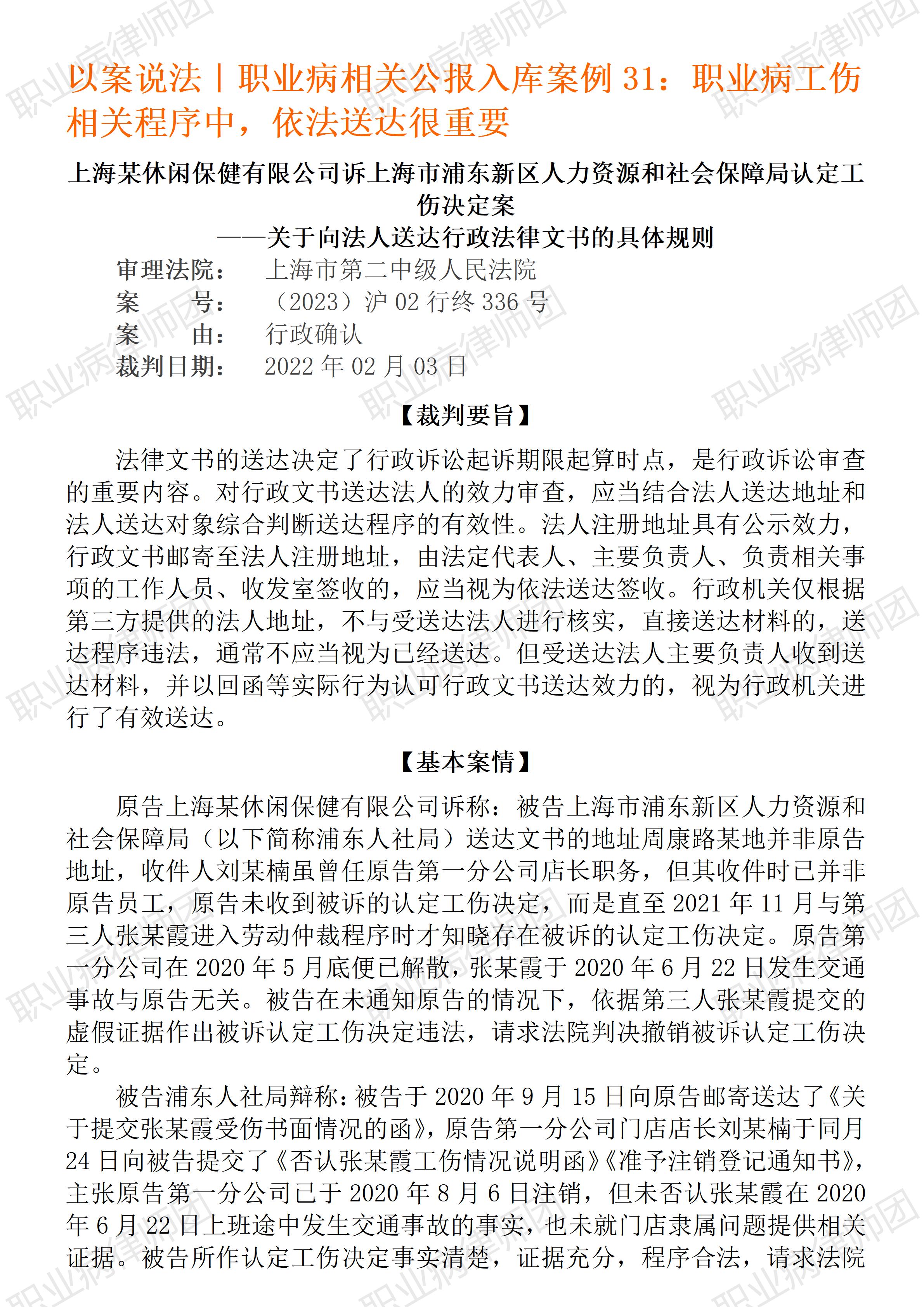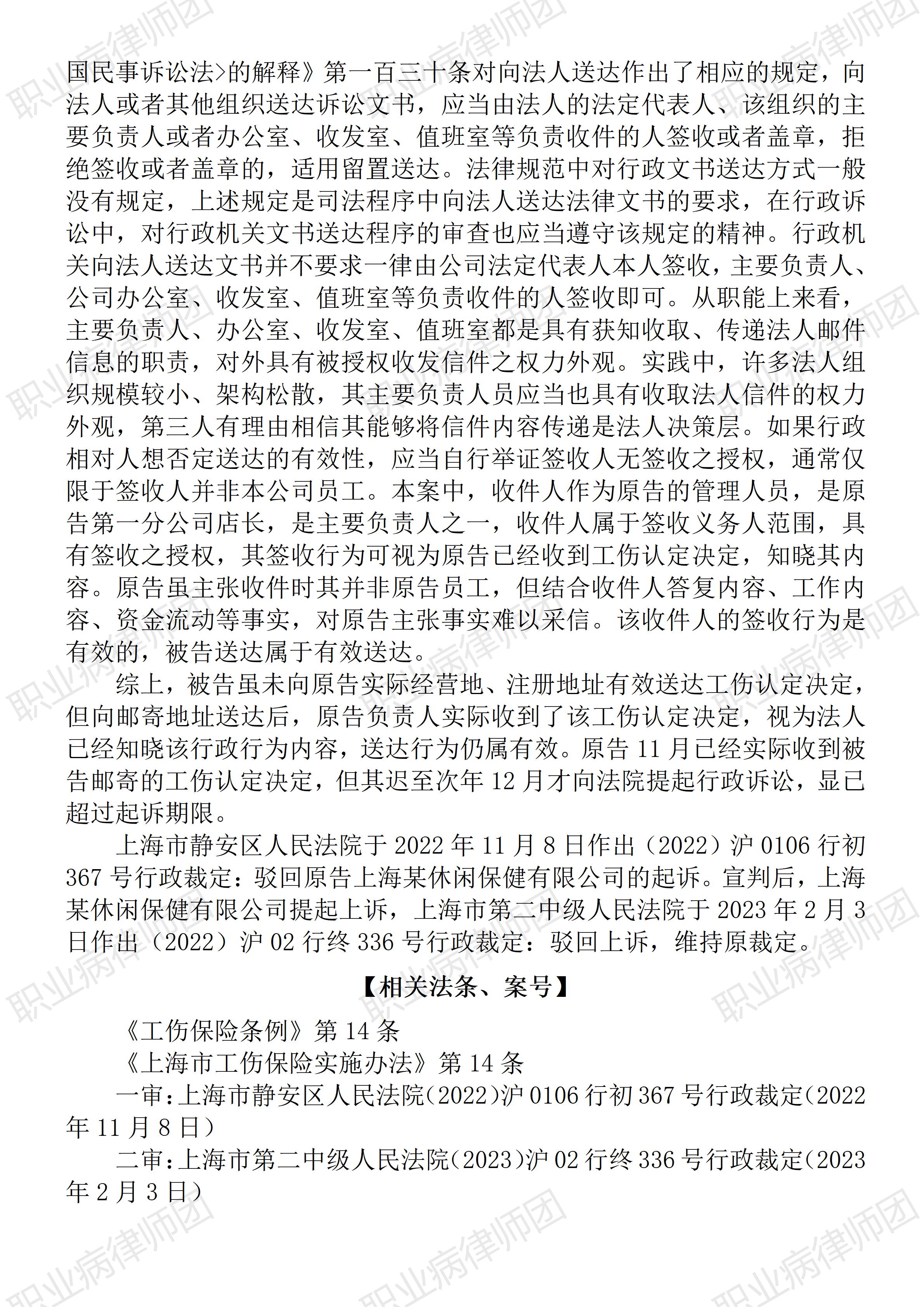 (青海西宁 日月山) 以案说法288|职业病相关公报入库案例31:职业病工伤相关程序中,依法送达很重要 本案案号:(2023)沪02行终336号 入库编号: 2024-12-3-007-016 案例编号:5.1.31 OCA31 【基本案情】 【律师说法】 本案是一宗涉及工伤认定文书送达的典型案件。最高人民法院将此案定为入库案例,也应该是希望为类案处理提供可资借鉴的标杆。毕竟,实务中因文书送达引发的纠纷不在少数,并且常常会因此影响到相关文书的效力稳定。 事实上,不止是工伤认定程序,职业病诊断鉴定程序、甚至职业健康检查等程序中也存在相关文书送达问题,一些医疗卫生机构受限于法律专业知识,常常困惑于文书送达。 有关文书送达问题,《民事诉讼法》及最高人民法院相关司法文件有相应规定,而按照《行政诉讼法》第一百零一条规定:“人民法院审理行政案件,关于期间、送达、财产保全、开庭审理、调解、中止诉讼、终结诉讼、简易程序、执行等,以及人民检察院对行政案件受理、审理、裁判、执行的监督,本法没有规定的,适用《中华人民共和国民事诉讼法》的相关规定。” 至于工伤认定中的文书送达,笔者认为,工伤认定文书(《认定工伤决定书》或《不予认定工伤决定书》)的送达需遵守主体法定、时限明确、方式规范、程序穷尽的要求,具体依据《工伤认定办法》《工伤保险条例》及民事送达的相关规定执行,核心规则包括:送达主体为社会保险行政部门;送达时限为工伤认定决定作出之日起20日内;送达对象为受伤害职工(或其近亲属)、用人单位及社会保险经办机构;送达方式需优先采用直接送达、邮寄送达等方式,穷尽后可适用公告送达;送达程序需保障当事人知情权(如地址一致性、拒收后的见证程序等)。 对此,《工伤认定办法》(人力资源和社会保障部令第8号)第二十二条规定:“社会保险行政部门应当自工伤认定决定作出之日起20日内,将《认定工伤决定书》或者《不予认定工伤决定书》送达受伤害职工(或者其近亲属)和用人单位,并抄送社会保险经办机构。《认定工伤决定书》和《不予认定工伤决定书》的送达参照民事法律有关送达的规定执行。” 至于职业病诊断鉴定中的文书送达,《职业病诊断与鉴定管理办法》(国家卫生健康委员会令第6号)第四十八条规定:“职业病鉴定办事机构出具职业病诊断鉴定书后,应当于出具之日起十日内送达当事人,并在出具职业病诊断鉴定书后的十日内将职业病诊断鉴定书等有关信息告知原职业病诊断机构或者首次职业病鉴定办事机构,并通过职业病及健康危害因素监测信息系统报告职业病鉴定相关信息。”此处对送达的具体操作细节并未明确,但考虑到《民事诉讼法》作为法律,其有关送达的程序性要求从效力位阶上来看足够权威,职业病诊断鉴定文书参照该法要求完成送达工作,一般即可有效避免送达风险。(2025/8/29 17:54) 更多原创文章 《GBZ188-2025 职业健康监护技术规范》新旧对照简析 以案说法287|最高法入库案例:出借资质赚10万,发生事故罚23万 以案说法271|职业病相关公报入库案例15:最高法裁定:劳动者未配合离岗体检,视为弃权 职业病问答65|用人单位注销后,职业病病人还能被认定工伤吗? 【收官】“职业病法律”公众号全部推文汇总(501-1000) |