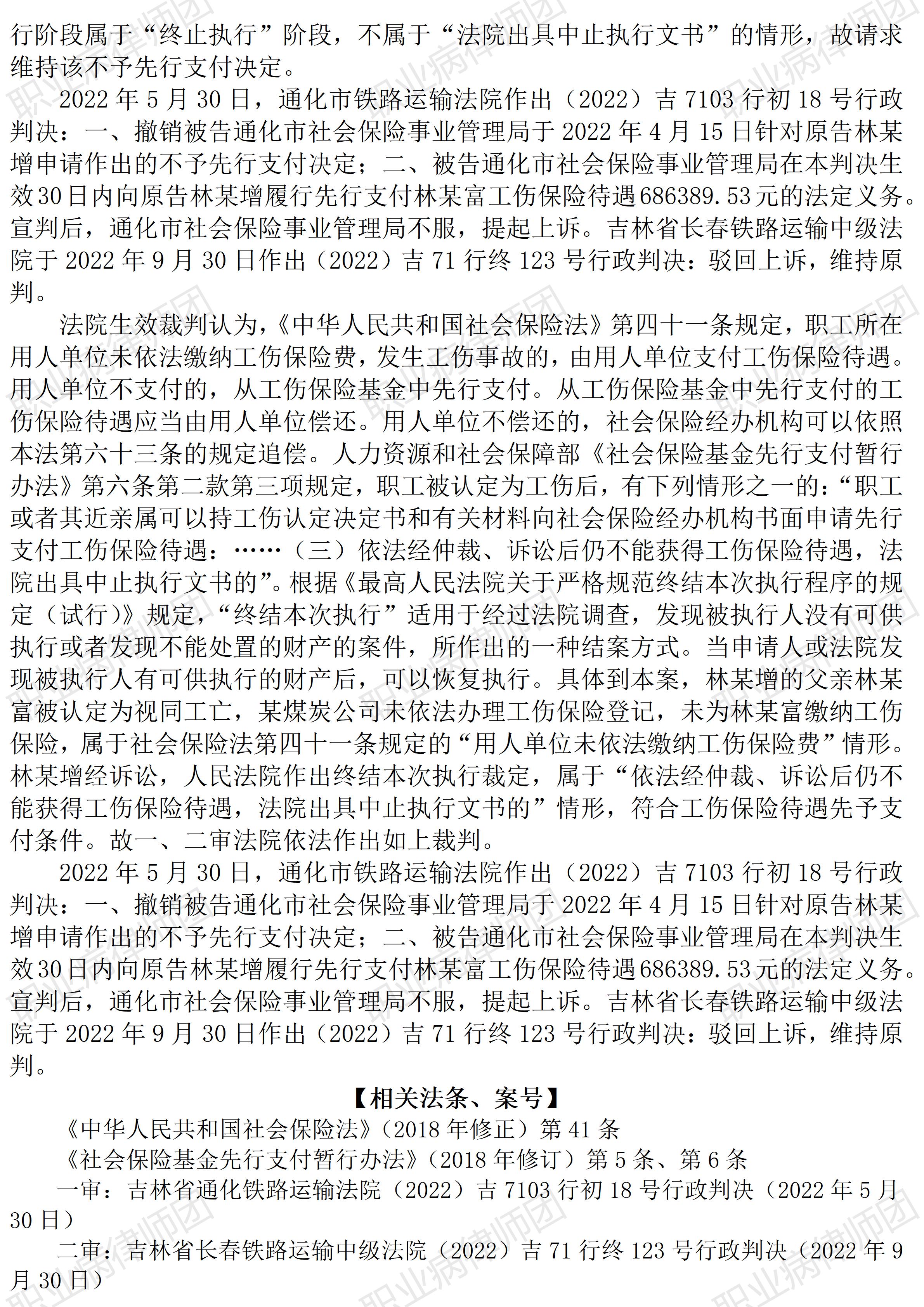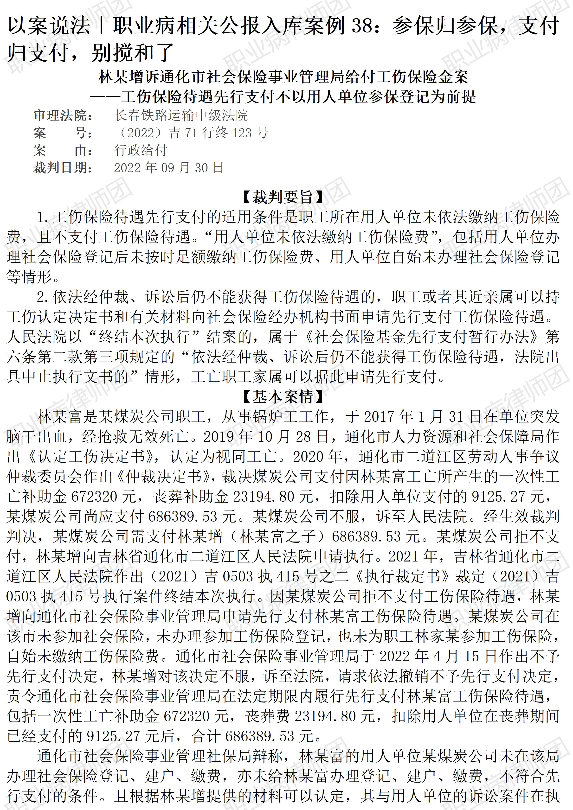 (青海湖) 以案说法295|职业病相关公报入库案例38:参保归参保,支付归支付,别搅和了 本案案号:(2022)吉71行终123号 入库编号:2024-12-3-008-003 案例编号:5.1.38 OCA38 【基本案情】 【律师说法】 本案是一宗涉及工伤保险先行支付的典型案例。 简而言之,本案案情很简单,问题很典型,影响很重大。 用人单位未依法缴费参保在实务中比较常见,即使在相关工伤保险法律法规多如牛毛的今天,一些用人单位仍然会有意无意地回避缴费参保。大多数情况下,劳资双方相安无事,毕竟发生工伤事故是小概率的事。或许正因如此,无论是用人单位还是劳动者,甚至监管部门也都是睁一只眼闭一只眼,你不投诉我也不监督。但一旦真发生了工伤事故,各方都手忙脚乱,能够事后补缴参保固然还能有所补益,但如果补不了呢?事故发生了,损害已造成,补偿待遇谁承担?从规范用工、维护基金安全角度,用人单位违法不缴费参保,自然由用人单位承担;但如果用人单位给付不了呢,社会保险先行支付制度于是应运而生。 《中华人民共和国社会保险法(2018修正)》第四十一条规定: 第四十一条职工所在用人单位未依法缴纳工伤保险费,发生工伤事故的,由用人单位支付工伤保险待遇。用人单位不支付的,从工伤保险基金中先行支付。 从工伤保险基金中先行支付的工伤保险待遇应当由用人单位偿还。用人单位不偿还的,社会保险经办机构可以依照本法第六十三条的规定追偿。 《社会保险基金先行支付暂行办法》(人力资源和社会保障部令第15号)第六条规定: 第六条职工所在用人单位未依法缴纳工伤保险费,发生工伤事故的,用人单位应当采取措施及时救治,并按照规定的工伤保险待遇项目和标准支付费用。 职工被认定为工伤后,有下列情形之一的,职工或者其近亲属可以持工伤认定决定书和有关材料向社会保险经办机构书面申请先行支付工伤保险待遇:(一)用人单位被依法吊销营业执照或者撤销登记、备案的;(二)用人单位拒绝支付全部或者部分费用的;(三)依法经仲裁、诉讼后仍不能获得工伤保险待遇,法院出具中止执行文书的;(四)职工认为用人单位不支付的其他情形。 从上述规定不难看出,工伤保险先行支付制度,本就是针对用人单位未依法缴费参保情形下为倾斜保障工伤职工合法权益而建立的,用人单位未依法缴费参保不仅不应当成为拒绝先行支付的借口,反而恰恰是应予先行支付的必要前提。至于社保部门所担心的垫付后的追偿,相关法律法规早已给出明确途径。所以,除了相关法律法规明确规定的条件之外,社保部门对于先行支付申请的审核,不应再额外增加任何限制性条件,以免给先行支付带来额外负担。 但对比来看,本案相关社保部门居然会以用人单位未依法缴费参保而拒绝先行支付,公然背离法定基本要求,显然违法。(2025/9/17 16:30) 更多原创文章 团队案例|确诊职业病前倒下的叁期尘肺患者,二审终判赔偿家属50余万 《GBZ188-2025 职业健康监护技术规范》新旧对照简析 以案说法294|最高法入库案例37:看不懂了,冒用身份也成立劳动关系? 以案说法271|职业病相关公报入库案例15:最高法裁定:劳动者未配合离岗体检,视为弃权 职业病问答65|用人单位注销后,职业病病人还能被认定工伤吗? 【收官】“职业病法律”公众号全部推文汇总(501-1000) |