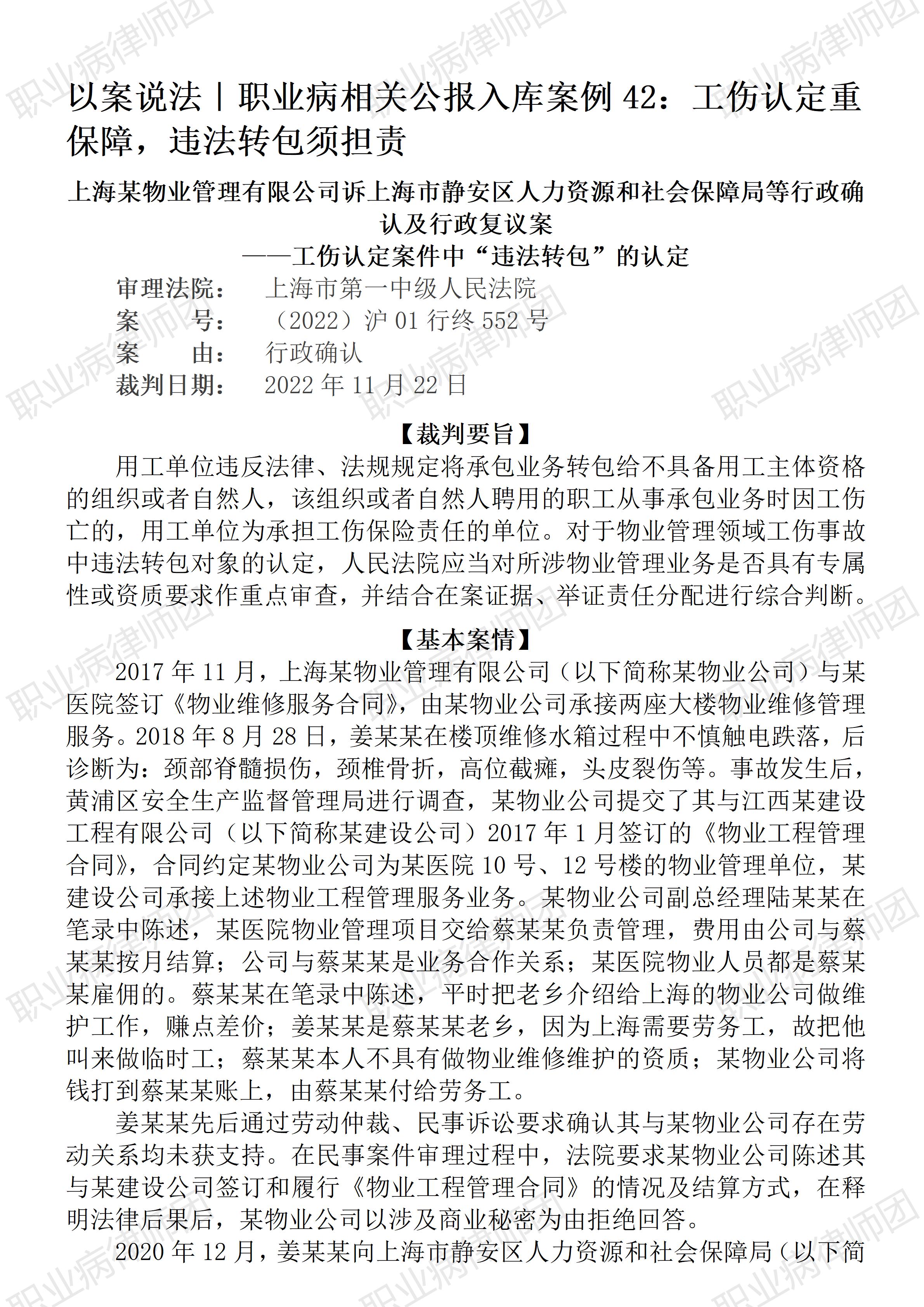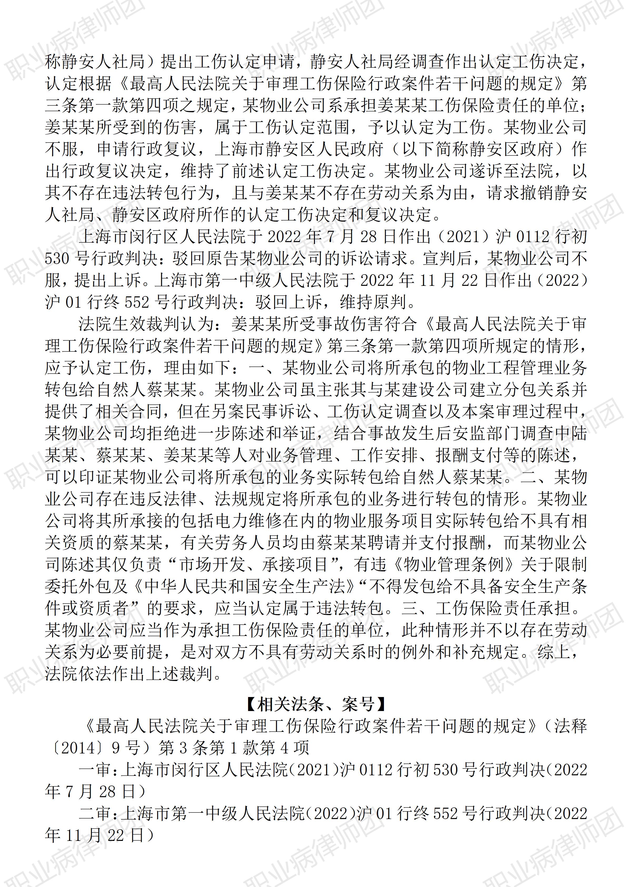 (青海西宁 日月山) 以案说法299|职业病相关公报入库案例42:工伤认定重保障,违法转包须担责 本案案号:(2022)沪01行终552号 入库编号:2024-12-3-007-009 案例编号:5.1.42 OCA42 【基本案情】 【律师说法】 本案是一宗涉及违法转包的工伤认定行政诉讼典型案例。 本案的典型意义表现在,类似这种将业务转包给第三方的情形,在实务中很常见,特别是在专业技术含量要求不高的一般劳务服务中,包括建筑施工、物业服务等。此等转包,不发生意外事故,你好我好大家都好,然而恰恰是这种习以为常的违法转包中,所隐藏的用工风险主要是安全生产风险却常常“暴雷”,其根源在于,通过转包,真正的生产经营单位减少了用工成本,却不合理地暂时卸托了安全生产义务及所需成本,导致实际的用工缺乏必要的安全保护,因而事故是迟早的事,也只是概率大小而已。 值得注意的是,本案法院引用的《最高人民法院关于审理工伤保险行政案件若干问题的规定》第三条第一款第四项中,“不具备用工主体资格”是一个相对较小的概念,特别是其中“用工主体资格”的理解,实务中往往局限于相关用工主体是否经过了工商登记。虽然未经过工商登记的主体显然是不具备用工主体资格的,但经过工商登记的主体是否就一定具备了相应的“用工主体资格”呢?恐怕还需要结合具体个案案情来理解。 类似本案中,法院对案涉事故及工伤认定的把握,除了上述最高人民法院相关司法解释之外,实际上还适用了《物业管理条例》特别是《安全生产法》的相关规定,而《安全生产法》有关用工主体资格的要求显然不限于工商登记这一形式要件,更强调相关安全生产的专业技术资质。 安全生产如此,职业卫生、职业病防治又何尝不是如此? 但一旦涉及职业病,问题恐怕又要回到劳动关系的前置确认上来。本案中患者直接诉求确认劳动关系,案经仲裁、一审、二审,均未获支持,但这并不影响其所受伤害最终被认定为工伤。而如果是职业病呢?恐怕首先连启动职业病诊断的门槛都难以跨过去。 但并不表示本案所揭示的绕过劳动关系直接认定工伤的逻辑在职业病情形下就绝对不能适用。值得关注和争取。(2025/9/23 10:57) 更多原创文章 团队案例|确诊职业病前倒下的叁期尘肺患者,二审终判赔偿家属50余万 《GBZ188-2025 职业健康监护技术规范》新旧对照简析 以案说法298|最高法入库案例41:社保部门核发待遇不应法外增设限制性条件 以案说法271|职业病相关公报入库案例15:最高法裁定:劳动者未配合离岗体检,视为弃权 职业病问答65|用人单位注销后,职业病病人还能被认定工伤吗? 【收官】“职业病法律”公众号全部推文汇总(501-1000) |