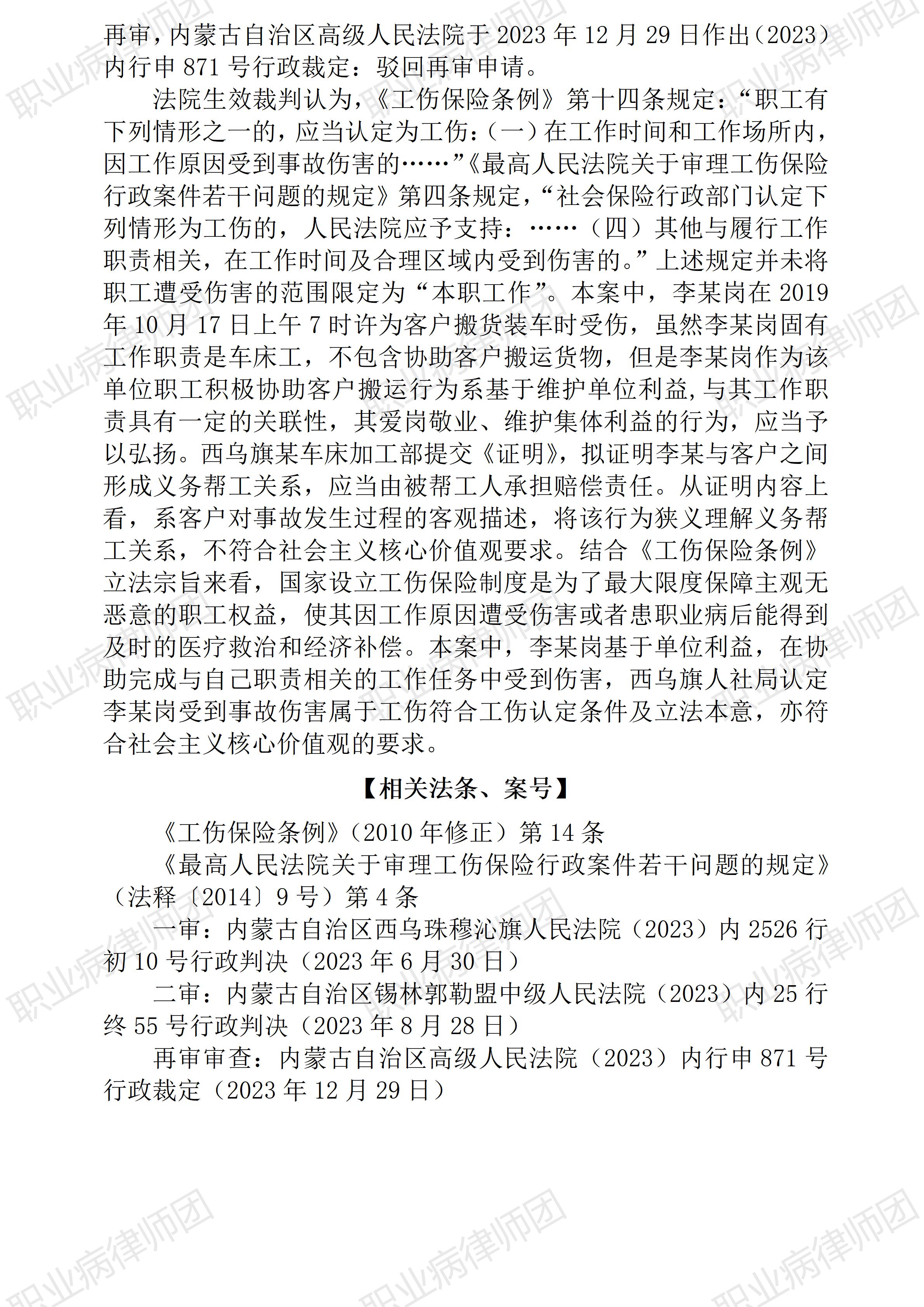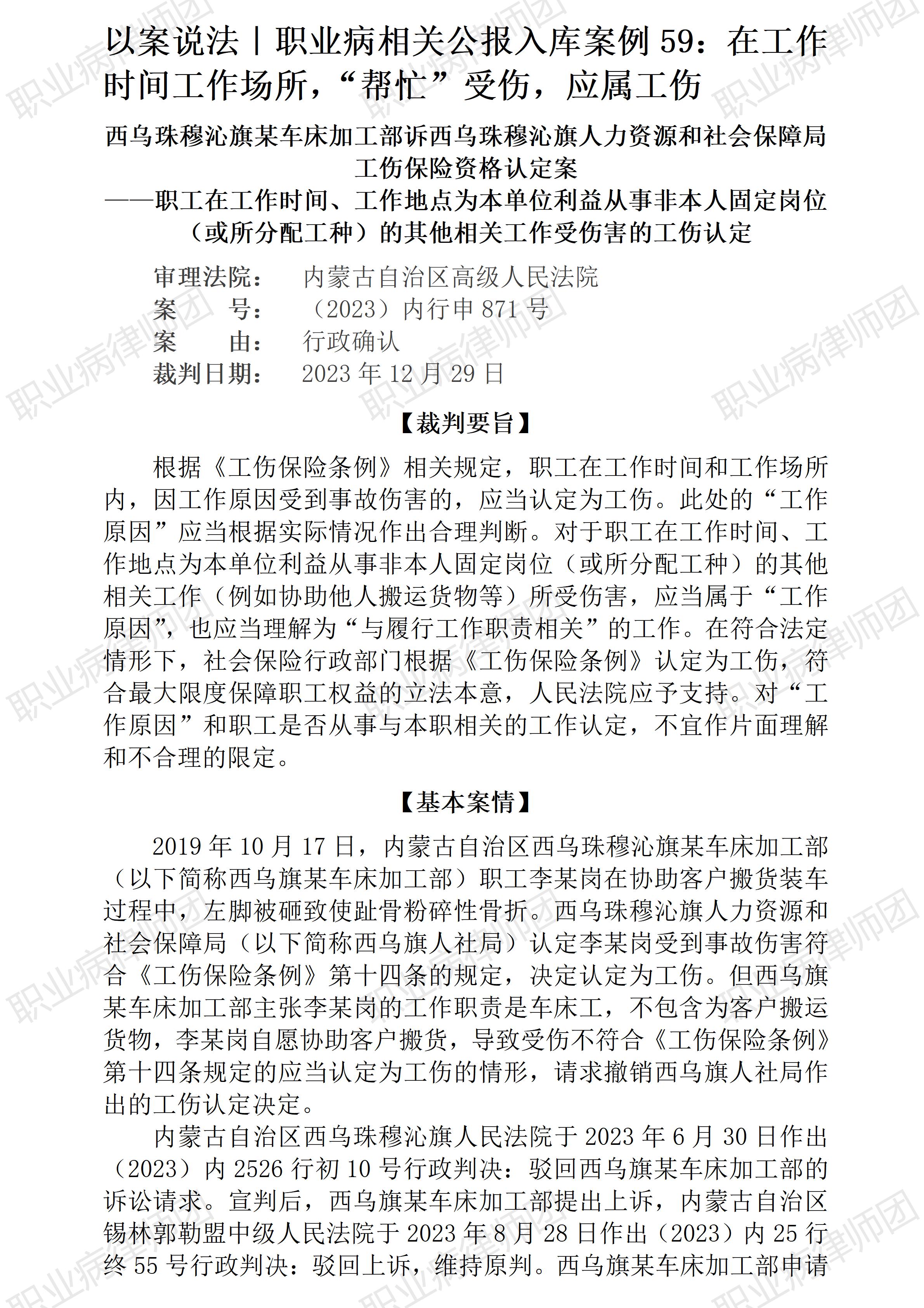 以案说法316|职业病相关公报入库案例59:在工作时间工作场所,“帮忙”受伤,应属工伤 本案案号:(2023)内行申871号 入库编号:2024-12-3-007-008 案例编号:5.1.59 OCA59 【基本案情】 【律师说法】 本案是一宗因在工作时间工作场所帮助用人单位客户受伤引发的工伤认定典型案例。类似的案例,职业病律师团此前已推送过类似案例,如5.1.35 OCA35《以案说法292|最高法公报入库案例:“串岗”“帮忙”受伤,应予认定工伤》,该案中,当事患者串岗帮助同事导致受伤,最终被认定为工伤。 本案中,当事患者为了帮助用人单位客户装卸货物导致受伤,虽然其工作岗位是车床工,本职工作中并无明确规定此项内容,但正常人均不难看出,为客户提供力所能及的帮助显然对用人单位有利,助人为乐也是中华传统美德,应予肯定,因此,当事患者帮助客户装卸货的行为并不违法也不违反公司规章制度的明确禁止性规定,同时又有益于用人单位,虽非本职工作,因此而受伤,其行为终究符合应予认定工伤的“三工”因素要求:工作时间、工作场所、为本单位利益,故应予认定工伤。如果这种情形不予认定工伤,劳动者因此遭受损害就只能自行承担损失,如此,显然有悖善良风俗及企业社会责任,对用人单位的社会美誉度也是一种贬损。 |