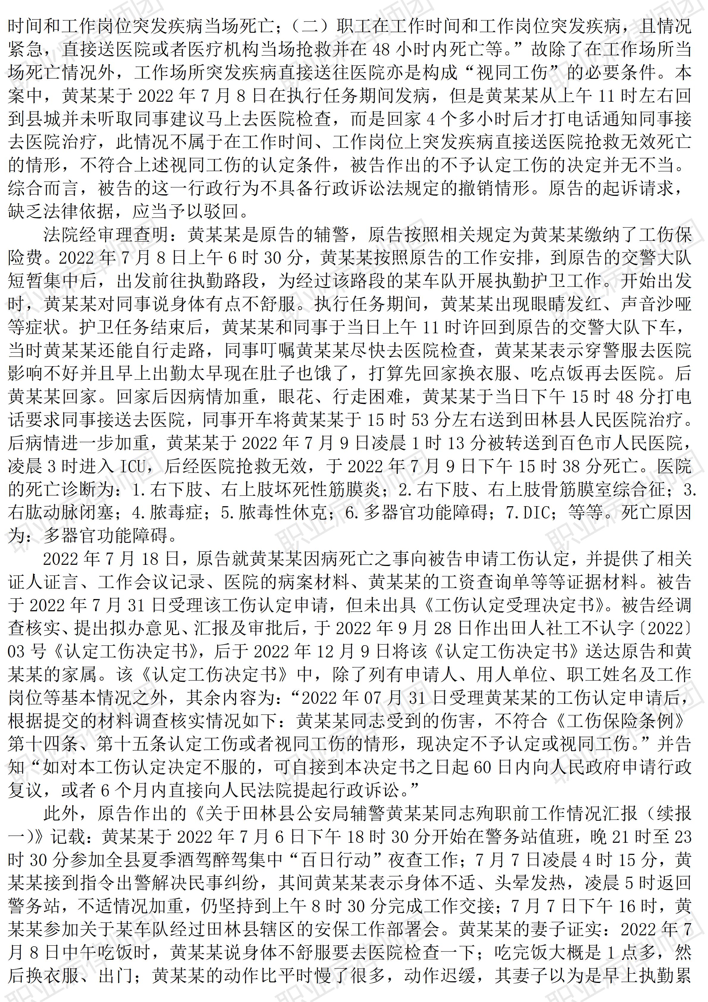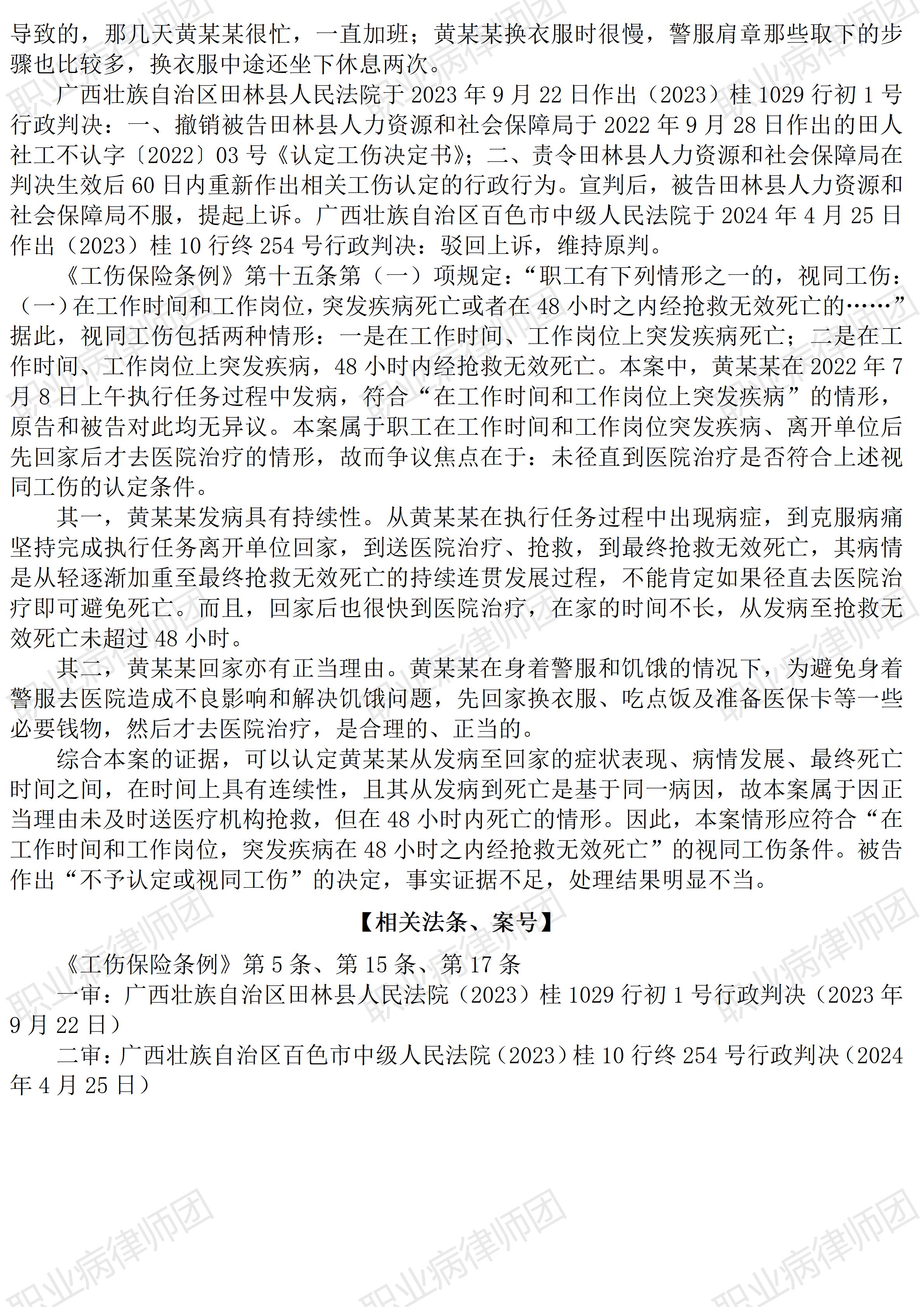 (青海湖) 以案说法317|职业病相关公报入库案例60:认定“48小时”视同工亡,要充分考虑病情发展的连贯性 本案案号:(2023)桂10行终254号 入库编号:2025-12-3-007-001 案例编号:5.1.60 OCA60 【基本案情】 【律师说法】 本案是一宗工作时间发病后48小时内死亡引发的工伤认定纠纷案。 本案的特殊之处在于:一是死者身份系公安机关的辅警人员,且系执行指派公务过程中发病;二是死者发病后并未直接就医,而是先回家中短暂停留后再被同事送医救治。 案涉人社部门不予认定死者为工伤,主要原因就是死者发病后未能直接就医。 但是否直接就医能成为“48小时”视同工亡的绝对决定性要求吗?恐怕未必。本案现有证据确能证明死者系工作时间发病,病历记载其病情发展也一以贯之,符合过度劳累诱发的病毒性筋膜炎等致死性疾病症状,从发病到最终死亡不超过48小时,过程中又可排除其他非工作因素致死,因此,至少本案中死者符合视同工亡的情形。 值得注意的是,本案死者身份及公务因素,以及所在单位公安机关的努力争取,令本案最终认定工亡具有了与一般案件相比较明显的特殊性。因此,本案最终能不能产生普适性效应,坦率地说,并不容易。毕竟,人社部门对“48小时”视同工亡,以及其他视同工伤情形的从严掌握,是人社部门依法履职所必需,国家人社部对“发病后直接就医”的要求又是人社部门认定工伤过程中内部掌握的标准,因此,除非其他类似案件都经过诉讼程序,并且都碰上持有相同理念的审理人员,否则,能不能顺利认定工亡,恐怕还需要看具体个案。 而在本案成为最高人民法院入库案例之后,经由本案法院所确定的裁判要旨,自此就成为后续同类案件审理所必须参考的案例样本。值得肯定和期许。(2025/9/29 15:52) 更多原创文章 管仕武|关于《职业病诊断与鉴定管理办法》与《职业病防治法》冲突的审查建议 以案说法316|最高法入库案例59:在工作时间工作场所,“帮忙”受伤,应属工伤 以案说法271|职业病相关公报入库案例15:最高法裁定:劳动者未配合离岗体检,视为弃权 职业病问答65|用人单位注销后,职业病病人还能被认定工伤吗? 【收官】“职业病法律”公众号全部推文汇总(501-1000) |