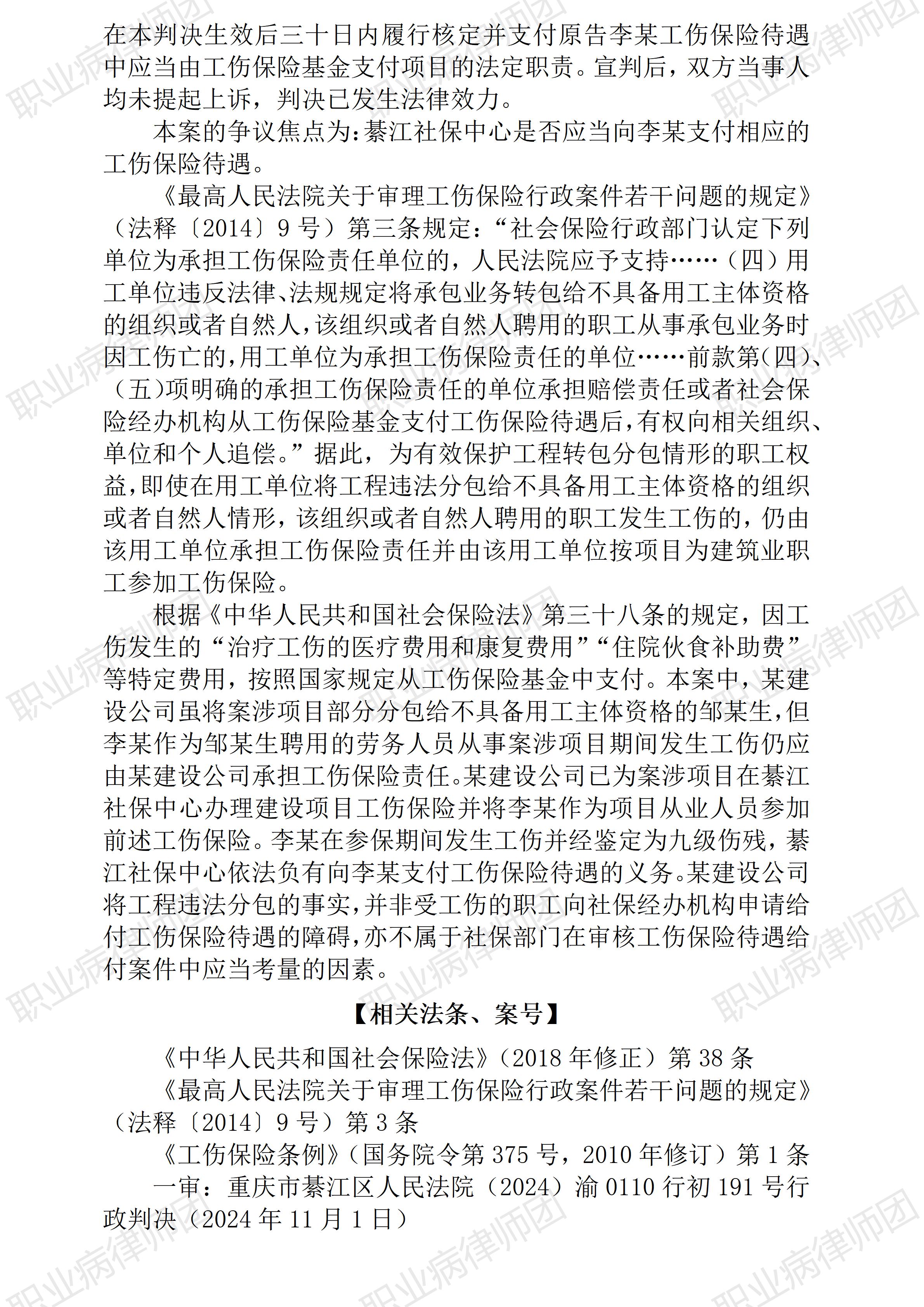 (青海西宁 倒淌河景区) 以案说法325|职业病相关公报入库案例68:违法分包不是社保拒绝核发工伤待遇的法定情形 本案案号:(2024)渝0110行初191号 入库编号:2024-12-3-008-006 案例编号:5.1.68 OCA68 【基本案情】 【律师说法】 本案是一宗涉及违法分包建筑工程引发工伤待遇核发纠纷的典型案例。 有关社保部门核发工伤待遇不得自行设置法外限定条件,本号此前已多有推介此类入库案例,如5.1.41 OCA41《以案说法298|最高法入库案例41:社保部门核发待遇不应法外增设限制性条件》、5.1.52 OCA52《以案说法309|最高法入库案例52:登记备案并非社保部门核发建筑项目参保工人工伤保险待遇的法定条件》、5.1.55 OCA55《以案说法312|最高法入库案例55:报备从来不是核发工伤待遇的法定条件》、5.1.64 OCA64《以案说法321|最高法入库案例64:冒用他人身份实际务工后发生工伤的,社保部门应予核发工伤待遇》等。 比较起来,本案相关人社部门拒绝核发工伤待遇的理由,是用工单位存在违法分包行为,因而认为相关工伤待遇理应由用工单位承担。从维护社保基金安全角度分析,案涉人社部门的抗辩并非完全无理,但相比工伤患者的待遇诉求,倾斜保护宗旨下的基金安全要求尚需让位于工作患者的合法诉求,至于违法分包当事方的责任追究,尚可由人社部门另行处理。 更多原创文章 管仕武|关于《职业病诊断与鉴定管理办法》与《职业病防治法》冲突的审查建议 以案说法324|最高法入库案例67:劳动者超龄但未退休且持续参保,发生工伤事故的应享工伤待遇 以案说法271|职业病相关公报入库案例15:最高法裁定:劳动者未配合离岗体检,视为弃权 职业病问答65|用人单位注销后,职业病病人还能被认定工伤吗? 【收官】“职业病法律”公众号全部推文汇总(501-1000) |