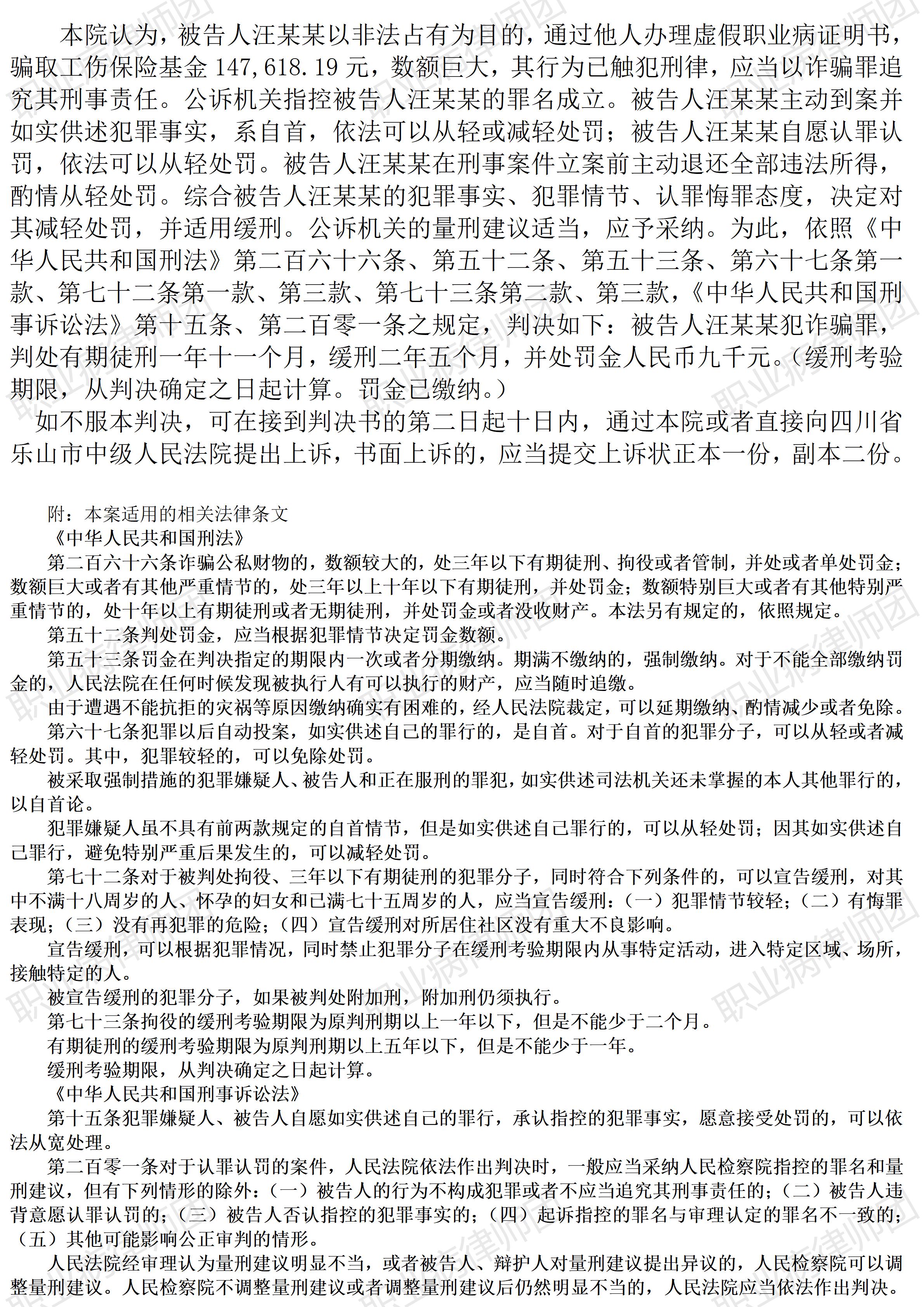 (江西明月山) 以案说法331|职业病涉刑事诉讼6:托人办假职业病证明花16万,获工伤待遇14万,全部退还后被判缓刑 【基本案情】 【律师说法】 本案是一宗涉及诈骗社会工伤保险基金的典型案例。案涉劳动者为了获得工伤保险待遇,不惜重金委托他人办理假职业病证明,结果最终不但工伤待遇分文未获,还因此被定罪判刑。其遭遇实在令人唏嘘。 受公开的裁判文书信息所限,无法确知案涉劳动者具体的健康状况。但从判决所提供的煤矿工作史来看,很可能案涉劳动者曾经有过相当时间的煤尘职业接触史,也不排除肺部出现了一定症状,但依据现有职业病诊断标准尚无法确诊为职业病,为了获得相应工伤待遇,案涉劳动者于是花钱请人办理了虚假的职业病诊断证明书。 本案无法不让人关注的案情细节包括:一是当事劳动者居然能花费16万元请人作假,如此重金对普通劳动者来说可谓巨资;二是相关人员居然能办到“职业性煤工尘肺二期”的假证明;三是当事劳动者实际获得工伤待遇14万余元,甚至不够支付给办假证明的“委托”费用;四是在全部退还所获工伤补偿款后当事劳动者最终被判缓刑。 本案一审判决后,被告人并未上诉,既表明当事人服判息讼,同时也能反映一审判决的结果经得起推敲。法院最终判处缓刑,应该是考虑到本案的诸多具体情形,包括全部退赔等,而案涉职业病工伤应该也是本案值得考量的特殊情形。并且,本案还获评四川省乐观市中级人民法院2024年度十大典型案例,足见本案的代表性与典型意义值得关注。 但本案背后也可能关联到职业病保障的另一方面社会现实:很多劳动者确实遭受了职业病损害,但由于诸多原因无法确诊职业病,这其中,既有职业史、职业接触史的确证存在障碍,也有职业病诊断标准的设计、适用方面的障碍。很多时候,劳动者只能选择放弃,少数患者会坚持依法维权。因此,如果相关职业病保障制度相对更完善,让遭受职业病损害的劳动者便捷获得相应保障,自然也就不存在现实中不时闪现的极端维权。但无论如何,类似本案当事劳动者采取的这种方式显然不合适,就算偶尔、暂时侥幸获益,终究因为根本违法,而难以安稳,正所谓“法网恢恢,疏而不漏”,遭受职业损害争取相应保障,本来是在理也合法的事,但因为违法而丧失保障,甚至被定罪判刑,实在得不偿失。(2025/10/13 15:50) 更多原创文章 以案说法|职业病涉刑事诉讼5:服刑劳改期间患职业病,诉求国家赔偿未获支持 以案说法|职业病相关行政诉讼9:劳鉴委以患者已离职拒绝受理复查鉴定申请,不合法! 以案说法|职业病相关纠纷14:岗位调整有边界,用工自主须合法 【收官】“职业病法律”公众号全部推文汇总(501-1000) 职业病问答65|用人单位注销后,职业病病人还能被认定工伤吗? 管仕武|关于《职业病诊断与鉴定管理办法》与《职业病防治法》冲突的审查建议 |