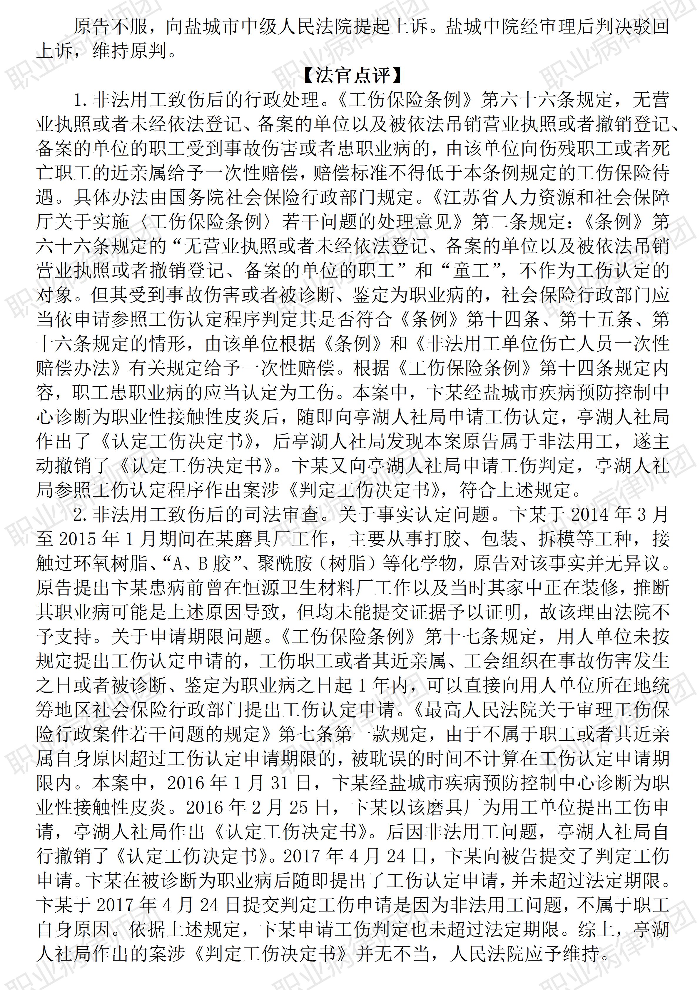 (平安金融中心俯瞰深港) 以案说法|职业病涉工伤认定行政诉讼74:非法用工致损,同样可以确诊职业病并被认定工伤 【基本案情】 【律师说法】 本案是一宗非法用工导致劳动者罹患职业病引发的工伤认定行政诉讼。此类争议在实务中比较常见。 一般来讲,劳动关系与工伤认定、职业病诊断鉴定关系密切,因此,无论是申请职业病诊断还是工伤认定,相关部门单位往往会要求申请人提供劳动关系相关证据材料,比如劳动合同、工作证明等等。如此处理,在一般普通的劳动关系存续期间或者终结后但能够提供相应材料的,劳动者自然会积极提供。但问题在于,劳动者往往在提供劳动关系的证明材料时存在种种困难,甚至根本无法提供,包括用人单位从未向劳动者提供相关证据材料,也包括劳动者未能妥善保管好相关证据材料,甚至,就算劳动者提供了相应材料而用人单位矢口否认双方存在劳动关系的,此时,职业病诊断机构往往会要求劳动者就其与特定用人单位存在劳动关系申请劳动仲裁。如果相关劳动用工事实确实存在或者曾经存在过,或者更进一步,如果相关用工主体是具有合同劳动用工主体资格的,那还好说,但如果这个用工主体是一个并未依法登记注册、或者虽曾登记注册但后来在雇佣劳动者期间其登记资格因故丧失了,此时,双方形成的并非合法用工事实,而是非法用工,但此种情形下非法用工的“非法”,指的是用工主体的未经依法登记,与劳动者合法与否完全没有关系。当然,劳动与社会保障法意义上的“非法用工”也包含了劳动者主体不适格,比如童工、雇佣限制或者无民事行为能力人(比如黑砖窑中的智障者)、外国人未经登记打黑工等等。诸如此类“非法用工”,都必然导致双方无法构成劳动关系。 但“非法用工”能否申请职业病诊断或者工伤认定?换言之,不存在劳动关系但确实存在接触职业病危害因素的用工事实并因此导致提供劳动者身体健康受损,此时,能否确诊职业病诊断?虽然这个问题从法律上看从来就不能成立,属于典型的伪命题,但实务中却纠纷不断,成为阻挠劳动者寻求职业病诊断鉴定的重要障碍。一些关注职业病的专业人士虽然也强调劳动关系不能成为职业病诊断鉴定的法律障碍,但强调合法性是一回事,实务中的纷争、障碍广泛存在却是另一回事,无法假装视而不见。 为什么说劳动关系并非确诊职业病的绝对必要条件,或者换言之,不存在劳动关系并不必然导致无法确诊职业病?因为《职业病防治法》《职业病诊断与鉴定管理办法》相关规定只是正面规定劳动者申请职业病应当提供劳动关系等相关证据材料,甚至也只是单向度地规定如果用人单位对相应劳动关系提出异议的、劳动者需要去通过劳动仲裁、诉讼确认双方存在劳动关系,但即便如此,也并不能简单得出结论:确诊职业病,必需先确认存在劳动关系,或者,没有劳动关系就绝对不能申请职业病诊断甚或确诊职业病。 因为,在认定工伤方面,非劳动关系发生事故伤害并被认定为工伤的情形,实务中比比皆是,最高人民法院的入库案例中也多有此类案例,比如超龄人员、新业态从业人员、挂靠人员雇佣司机等人员遭受事故伤害而仍被认定为工伤。相关入库案例的裁判指引也明确排除确认劳动关系成为认定工伤的前提。 但在职业病诊断鉴定方面,一些职业病诊断机构上来就强调患者必须提供劳动关系证明材料,否则就得去“打官司”先确认劳动关系。但如上所述,非法用工情形下,双方劳动关系本来就并不存在,而只是存在相关接触职业病危害的用工事实,此时,如果患者诉求确认与特定用工主体存在劳动关系,这官司无论怎么打必输无疑,还没开打就输了。而仲裁、法院司法文书一旦否认双方劳动关系,患者再要去申请职业病诊断,结果可想而知。当然,同样需要指出的是,前述诉求确认劳动关系的仲裁、诉讼未获支持,倒并非决定患者由此便无法申请甚至无法确诊职业病了。 受公开的裁判文书信息所限,尚不清楚本案确诊职业病的结论如何作出,但大概率应该是用工单位并未对相关用工事实甚至“劳动关系”提出异议,而诊断机构也就顺利作出了确诊职业病的结论。否则,但凡用人单位就双方劳动关系提出异议,则案涉职业病诊断鉴定何时能启动都是个问号。 事实上,相关法律依据早就明确,劳动关系并非确诊职业病的必要条件。比如《职业病防治法》第八十六条、《工伤保险条例》第六十六条等。只不过要注意的是,劳动关系可以不成立或者不确认,但接触职业病危害的用工事实以及因此遭受职业病损害的事实却仍然必须存在且确证。 此外,本案存在的特殊性还表现在,因系非法用工,无法认定工伤,但却被人社部门判定为工伤;而且,由于用工单位的原因导致患者逾期申报工伤,相关工伤申请时效被认定为并未逾期。(2025/11/3 16:48) 更多原创文章 管仕武|关于《职业病诊断与鉴定管理办法》与《职业病防治法》冲突的审查建议 以案说法|职业病相关行政诉讼9:劳鉴委以患者已离职拒绝受理复查鉴定申请,不合法! 以案说法|职业病相关纠纷14:岗位调整有边界,用工自主须合法 职业病问答65|用人单位注销后,职业病病人还能被认定工伤吗? 【收官】“职业病法律”公众号全部推文汇总(501-1000) |