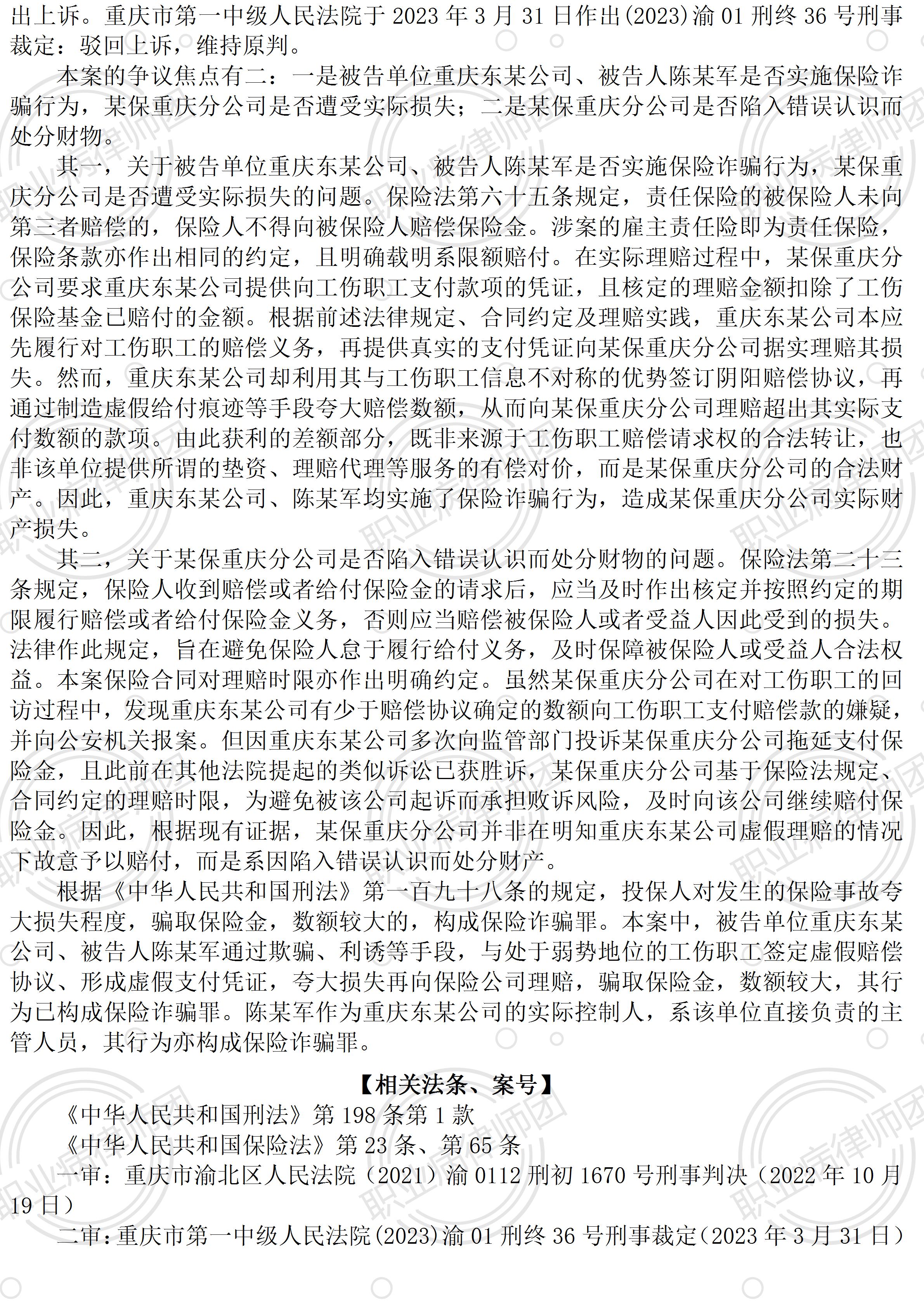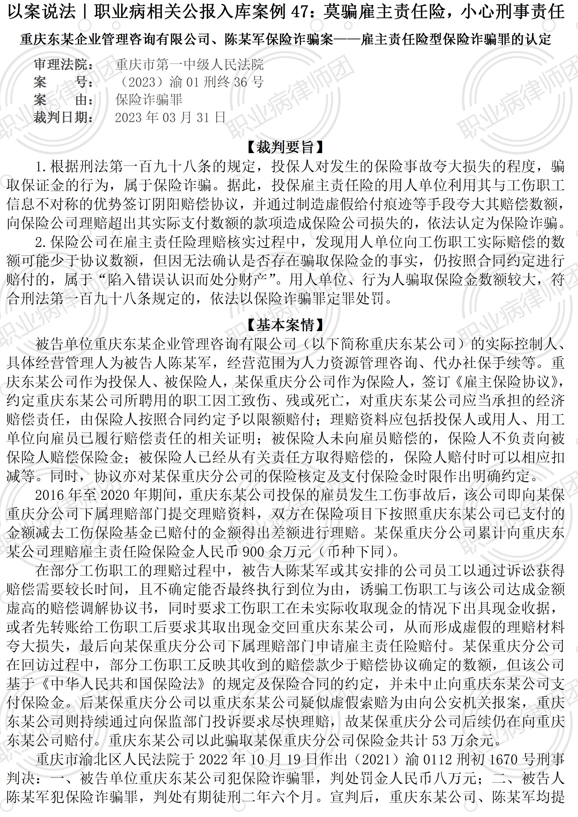以案说法|职业病相关公报入库案例47:莫骗雇主责任险,小心刑事责任 本案案号:(2023)渝01刑终36号 入库编号:2024-05-1-222-007 案例编号:5.1.47 OCA47 【基本案情】 【律师说法】 本案是一宗涉及用人单位及其负责人骗取雇主责任险的典型刑事案例。 单纯就涉案金额看,案涉用人单位及其负责人实际获利金额并不算特别大,在长达近5年的时间累计骗取50万余元的保险赔偿金。但从当事人采取的行为性质来看,实属恶劣。而且,类似的骗保行为相对较为隐蔽,如果不是保险公司注意回访并发现破绽,又通过刑事控告在公安机关侦查立案加持下固定证据,还不知道这样的行为将持续多久,而保险公司的损失势必继续扩大。 从刑事犯罪构成要件分析,当事单位及其负责人采取与工伤职工签订阴阳合同方式虚构赔偿金额,再通过保险合同约定加上保险监管投诉方式加速保险理赔,过程中其骗取保险金的主观意图明显,虚构工伤损失行为成立,扩大赔偿金额造成保险金核发高于工伤职工实际收到的赔偿事实确凿,而保险公司在非明知且受合同约定义务及在先诉讼成例约束下持续支付不实保险赔偿的事实也能查证,因此,认定案涉用人单位及其负责人构成保险诈骗罪,并依法判罚相应刑事责任,不冤。 本案给类似行为及有类似幻想的用工主体及相关责任人敲响了警钟:规范用工,依法申报工伤才是正途,雇主责任商业保险的价值在于分散真正的用工风险,对此奉劝莫存贪念,小心刑事责任。(2025/9/24 17:36) 更多原创文章 管仕武|关于《职业病诊断与鉴定管理办法》与《职业病防治法》冲突的审查建议 以案说法303|最高法入库案例46:签订内部承包协议不能改变既存劳动关系 以案说法271|职业病相关公报入库案例15:最高法裁定:劳动者未配合离岗体检,视为弃权 职业病问答65|用人单位注销后,职业病病人还能被认定工伤吗? 【收官】“职业病法律”公众号全部推文汇总(501-1000)  |