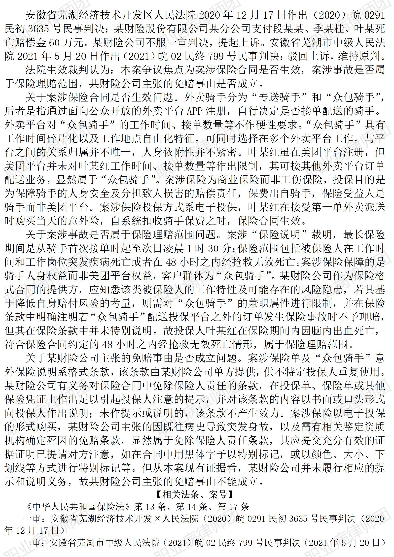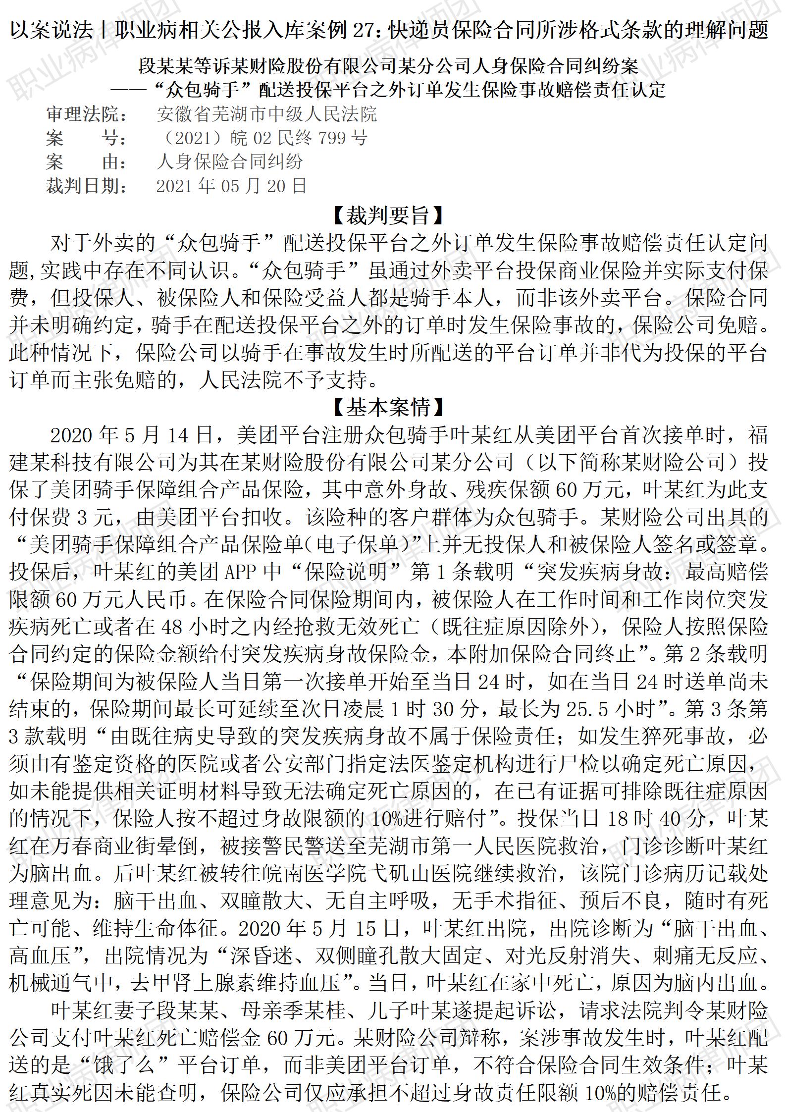 (高铁外的广西) 以案说法284|职业病相关公报入库案例27:快递员保险合同所涉格式条款的理解问题 本案案号:(2021)皖02民终799号 入库编号:2023-08-2-334-001 案例编号:5.1.27 OCA27 【基本案情】 【律师说法】 本案是一宗涉及外卖快递配送员人身保险合同的典型案件。经由最高人民法院案例库入选,本案对后续类案处理将作出有力提示: 1、“众包骑手”与外卖平台之间的关系归属并不唯一、人身依附性并不紧密,具有“兼职”属性。案涉保险为商业保险而非工伤保险,投保目的是为了保障骑手的人身安全及分担致人损害的赔偿责任,保险受益人为骑手而非外卖平台。 2、保险公司如需对众包骑手的兼职属性进行限制,应在保险条款中明确注明若众包骑手配送投保平台之外的订单时发生保险事故,保险公司不予理赔,并就该免责条款作出足以引起投保人注意的提示说明。 互联网+经济可谓当下热门,尤其在化解就业压力方面,快递、外卖配送、物流等吸引了为数众多的劳动力。与之相伴而生的,则是从业人员的人身保障问题。由于新业态发展迅猛,法制建设进度尚未跟上,从业人员与平台之间的法律关系并未统一明确,相关法律规定更是阙如,而不同的法律关系定性会直接影响各方当事人权利义务,即使平台扣费参保,相关保险合同中的格式条款也对从业人员不太有利。本案的生效裁判对相关问题作出了较为清晰的分析和认定,虽然只是个案,但背后所能代表的“众包骑手”群体基数却不小,尤其是对相关人身保险合同从格式条款着手分析论证,更是为从业人员的保障带来了福音,也为后续从业保障包括商业保险的进一步完善提供了积极指引,而本案成为入库案例,更强化了这一指引的力度。(2025/8/29 12:17) 更多原创文章 《GBZ188-2025 职业健康监护技术规范》新旧对照简析 以案说法283|最高法入库案例:恶意注销工商登记,仍需承担工伤责任 以案说法271|职业病相关公报入库案例15:最高法裁定:劳动者未配合离岗体检,视为弃权 职业病问答65|用人单位注销后,职业病病人还能被认定工伤吗? 【收官】“职业病法律”公众号全部推文汇总(501-1000) |
