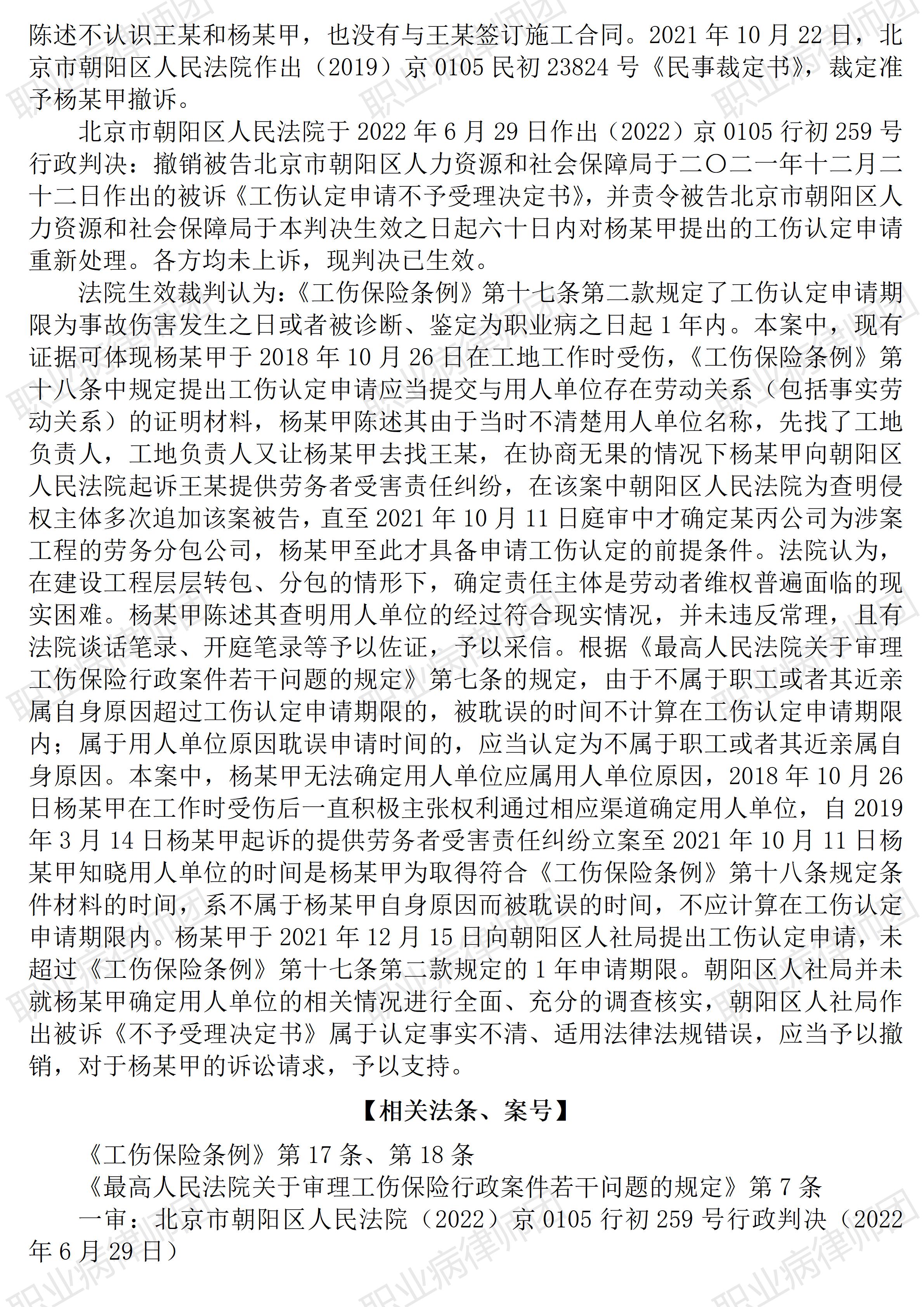 以案说法290|职业病相关公报入库案例33:为明确用工主体致超过一年申报工伤,不应视为逾期 【基本案情】 【律师说法】 本案是一宗涉及劳动者积极寻求救济但因客观原因导致超过一年才申报工伤而最终获得法院支持的典型案例。 在市场经济社会中资强劳弱的一般性用工环境下,劳动者遭受事故伤害或者罹患职业病,想要及时获得工伤认定及工伤保险待遇,往往存在种种障碍。特别是在那些并不规范的用工条件下,劳动者甚至只为明确与特定用工主体之间存在劳动关系首先就得花费相当长的时间和相当大的代价才可能实现。这种职业病工伤遭遇,在建筑、矿山领域相对更为常见,建筑行业的高密度资金、劳动力投入,和相对丰厚的利润回报刺激了劳务层层分包、转包,导致建筑工人顶多也就认识带其进入施工现场的包工头,再往上层级的负责人或者用工主体就很难有机会了解到。矿山行业也与此类似。 也因此,才有了《劳动和社会保障部关于确立劳动关系有关事项的通知》(劳社部发〔2005〕12号):“四、 建筑施工、矿山企业等用人单位将工程(业务)或经营权发包给不具备用工主体资格的组织或自然人,对该组织或自然人招用的劳动者,由具备用工主体资格的发包方承担用工主体责任。”以及后来最高人民法院在工伤行政相关司法解释中对此类用工过程中受伤发生工伤认定纠纷时进一步延伸为拟制劳动关系的规定。 但,遭遇劳动关系确认之困的,远不止建筑、矿山两大行业,尽管这两大行业中需要明确劳动关系确认规则的需求可能更庞大、更迫切。 比如家庭装修行业,同样存在层层转弯抹角地转接安排,特别是在互联网迅猛发展的当下,用工方一般通过微信联络、召集和管理,这其中粉尘、甲醛等有毒有害因素非常常见,但劳动者遭受职业病工伤后想要寻求劳动关系或者用工关系的确认,难度不是一点点。 还有物流行业、快递行业等等,新技术、人工智能加持下,劳动用工关系可以预见只会越来越灵活和难以固定确认,而职业伤害却并不会因人而异,发生职业病工伤事故后,劳动关系、用工关系如何确认?也在考验相关制度。 本案的最大价值在于,法院对一年时效的确认,并不简单只看时间值,更重要的是深入考察导致时间消耗的原因,责任是否在用工主体,劳动者有无积极维权自救。因此,本案提示广大劳动者:发生职业病工伤事故后,务必积极维权,无论最终结果如何,至少在程序上、形式上需要有相应的救济动作,否则,一味诉苦、抱怨而坐待救济降临,很可能会彻底丧失保障机会,当然过程中也需要固定、保留好相应证据。(2025/9/1 16:33) 更多原创文章 团队案例|确诊职业病前倒下的叁期尘肺患者,二审终判赔偿家属50余万 《GBZ188-2025 职业健康监护技术规范》新旧对照简析 以案说法289|最高法入库案例:对用人单位执行不能,社保部门应予先行支付工伤待遇 以案说法271|职业病相关公报入库案例15:最高法裁定:劳动者未配合离岗体检,视为弃权 职业病问答65|用人单位注销后,职业病病人还能被认定工伤吗? 【收官】“职业病法律”公众号全部推文汇总(501-1000) |