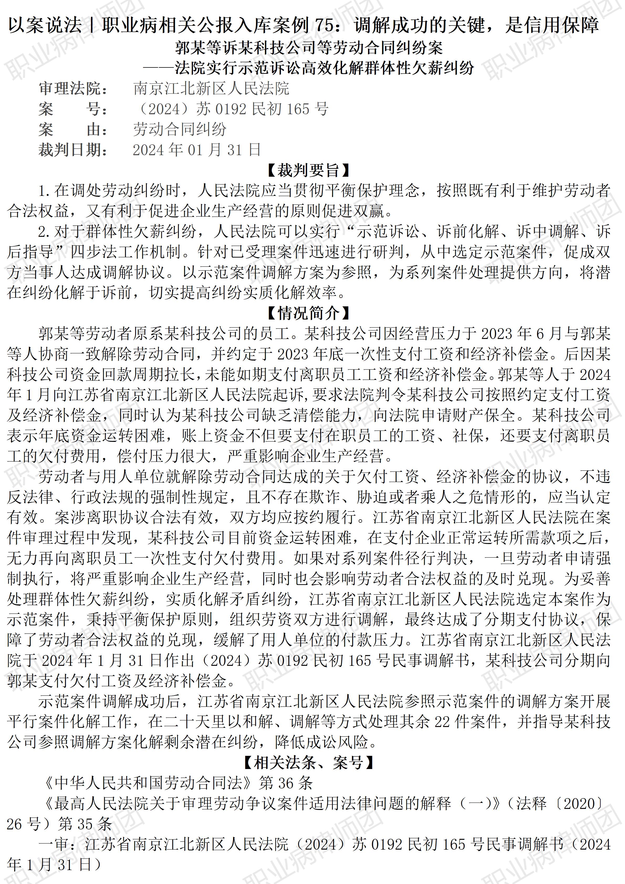 以案说法342|职业病相关公报入库案例75:调解成功的关键,是信用保障 本案案号:(2024)苏0192民初165号 入库编号:2024-07-6-186-001 案例编号:5.1.75 OCA75 【基本案情】 【律师说法】 本案是一宗涉及群体性纠纷而最终由人民法院成功调解结案的典型案件。调解结案而成为入库案例的,就目前笔者所见,在整个入库案例中都比较少见。唯其如此,本案的入库,就更显最高人民法院的纠纷解决倾向。 类似本案这样的劳资争议,实务中可谓常见。劳动争议从来都不简单,并非某些人以为的就是些工资啊工伤待遇啊这类纠纷,但即使只是孤立的个案,案中所涉争议普遍并不简单,尤其是争议事实,由于涉及过往用工事实,时间长,互动频繁且变化大,加上地方性特色明显,更增加了劳动争议的复杂性。更何况,劳动争议个案或许标的不大,却往往容易引发连锁反应和群体性纠纷,因此,劳动争议,尤其是群体性劳动争议的有效化解,非常考验仲裁、法院的智慧与经验。 本案的特殊之处在于,用人单位或许并不想赖账,而是确实因为资金周转压力大,导致无力一次性支付全部涉案劳动者的补偿金,而如果按正常流程走下去,用人单位的败诉基本是确定的,劳动者胜诉期望值高,但赢了官司能不能顺利拿到钱却是个大问题。极端情况下,用人单位资不抵债直接破产了,对劳资双方都不是好事。而从法院角度,即使能查清案情、准确适法,但因为一宗群体性纠纷导致一家企业垮掉,显然也难称案结事了。所以,调解才成为法院首选。 但当事双方或许对争议标的争议有限,主要的焦点在于如何履行、如何在确保双方利益的前提下妥善解纷。本案法院最终成功调结,过程中遇到的阻力和困难可想而知,其中最大的障碍,或许就在于如何争取到当事劳动者群体的信任:相信企业确实存在资金周转困难,更相信企业后续能够履行调解协议。套用电影中的台词,困难时期的信心价抵万金。而法院居中调解,所能建立的信任或许是本案调解成功的关键。 为本案法院的有效化解能力点赞,更为其示范性妥善化解群体性劳资纠纷的司法价值追求点赞。(2025/12/4 10:18) 【收官】“职业病法律”公众号全部推文汇总(501-1000) 职业病问答65|用人单位注销后,职业病病人还能被认定工伤吗? 管仕武|关于《职业病诊断与鉴定管理办法》与《职业病防治法》冲突的审查建议 |