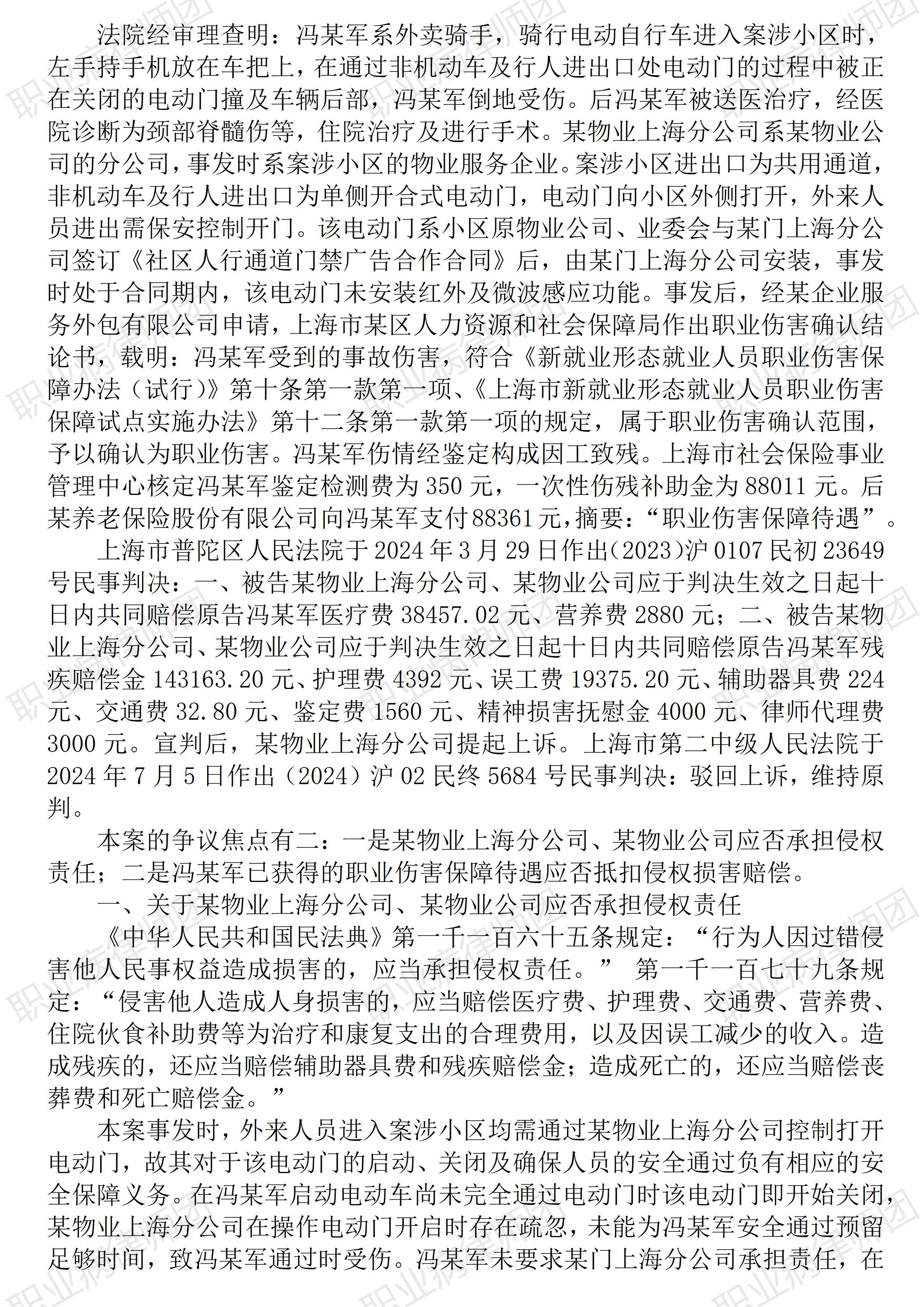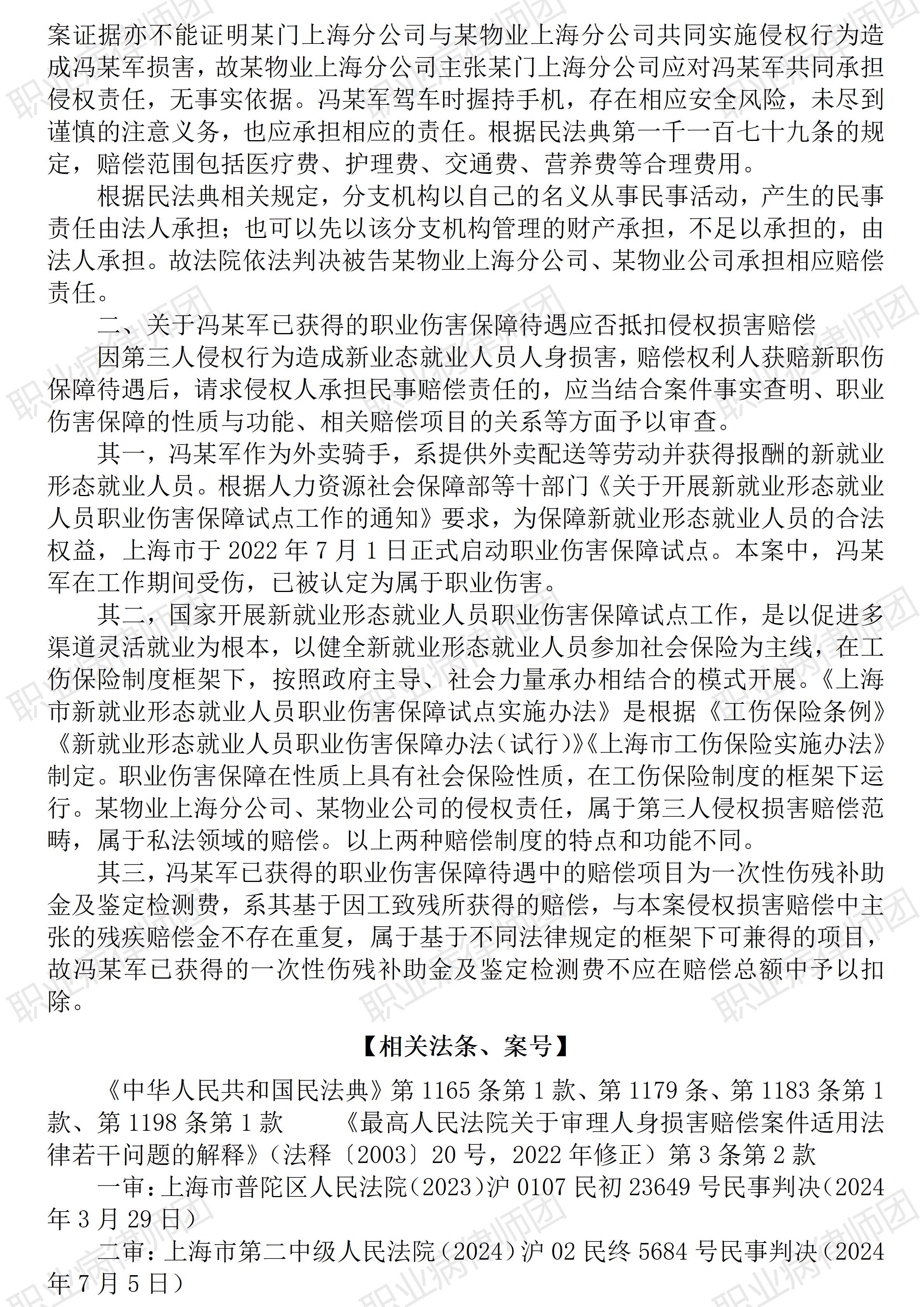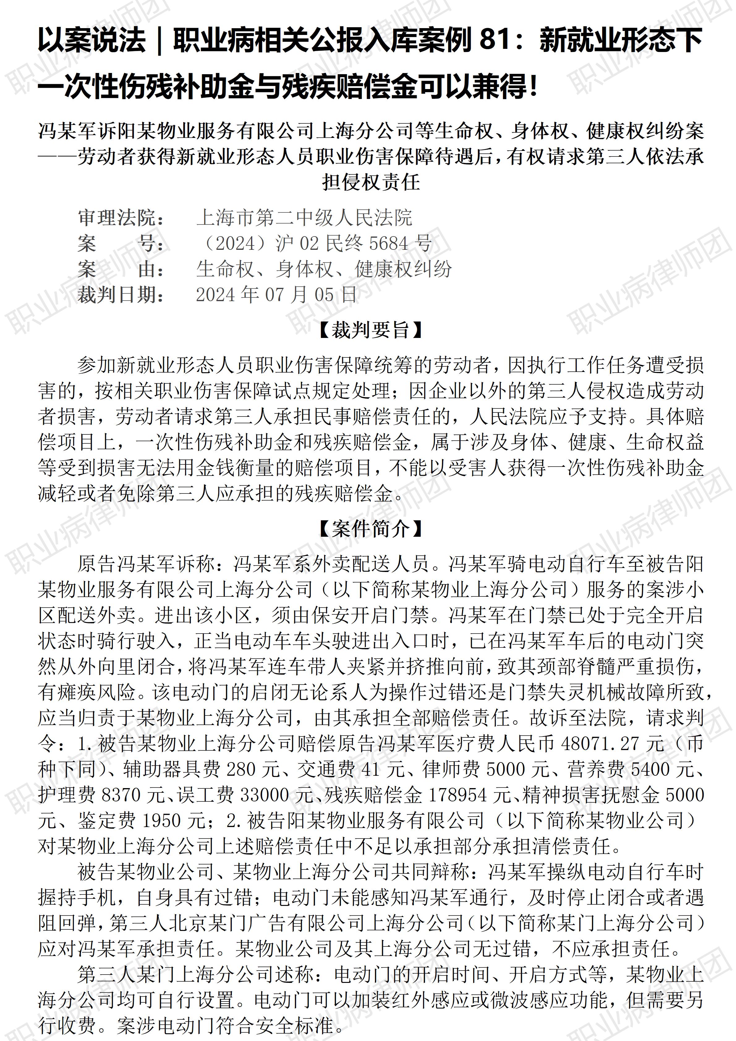 (冬月十七清晨的圆月) 以案说法348|职业病相关公报入库案例81:新就业形态下一次性伤残补助金与残疾赔偿金可以兼得! 本案案号: 入库编号:2025-07-2-001-002 案例编号:5.1.81 OCA81 【案件简介】 【律师说法】 本案是一宗涉及新就业形态下就业人员遭受第三人伤害所致损害补赔偿纠纷的典型案例。 新就业形态日益兴盛,新就业形态下外卖骑手的保障问题也日益凸显。本案系争焦点因涉及工伤保险待遇与侵权责任赔偿的竞合问题,因而极具参考价值。 新就业形态下就业人员因从业行为导致第三人伤害的,属于履行职务行为,除了相应商业保险公司应承担责任保险赔偿外,其就业单位及所属服务平台运维单位亦应承担补充赔偿责任,这一裁判标准在前一入库案例中得以明确,详见5.1.80 OCA80(下称前一入库案例)。 而与前一入库案例5.1.80 OCA80相比,本案则是新就业形态从业人员因从业行为导致自身遭受损害,同时,前一案涉交通事故发生在2018年,本案则发生于2022年,此时,《人力资源社会保障部等十部门关于开展新就业形态就业人员职业伤害保障试点工作的通知》(人社部发〔2021〕110号)已实施。因而,前一入库案例中只涉及商业性质的雇主责任保险,而本案则涉及新就业形态就业人员职业伤害保险,依据前引《人力资源社会保障部等十部门关于开展新就业形态就业人员职业伤害保障试点工作的通知》规定:新就业形态就业人员职业伤害保障制度应当遵守的原则包括:“坚持公平统一,发挥社会保险优势,在工伤保险制度框架下,解决职业伤害保障不平衡不充分问题。”因而同样属于社会工伤保险范畴。虽然商业责任险与职业伤害保障是两种法律性质不同的保险,但两案中法院裁判的底层逻辑是相通的:无论是商业保险,还是社会工伤保险,均不构成受伤人员同时诉求保险赔偿与侵权责任赔偿的当然限制。 但本案毕竟涉及社会工伤保险,因而有必要明确相关职业伤害保险与侵权责任赔偿的关系,而本案生效裁判则认定此二者系属不同法域,因而不能互相替代或者抵扣。 而本案尤为值得关注的,是生效裁判认定,一次性伤残补助金与残疾赔偿金“属于基于不同法律规定的框架下可兼得的项目”! 职业病病人诉求民事赔偿纠纷中,有关工伤保险待遇与民事赔偿的竞合问题亦是高发常见。虽然,笔者要特别指出本案系新就业形态就业人员,与一般职业病工伤劳动者存在很大不同,但仍然需要看到,新就业形态就业人员所享受的相关职业伤害保障,同样属于社会工伤保险范畴。(2026/1/5 11:26) 【收官】“职业病法律”公众号全部推文汇总(501-1000) 职业病问答65|用人单位注销后,职业病病人还能被认定工伤吗? 管仕武|关于《职业病诊断与鉴定管理办法》与《职业病防治法》冲突的审查建议 |