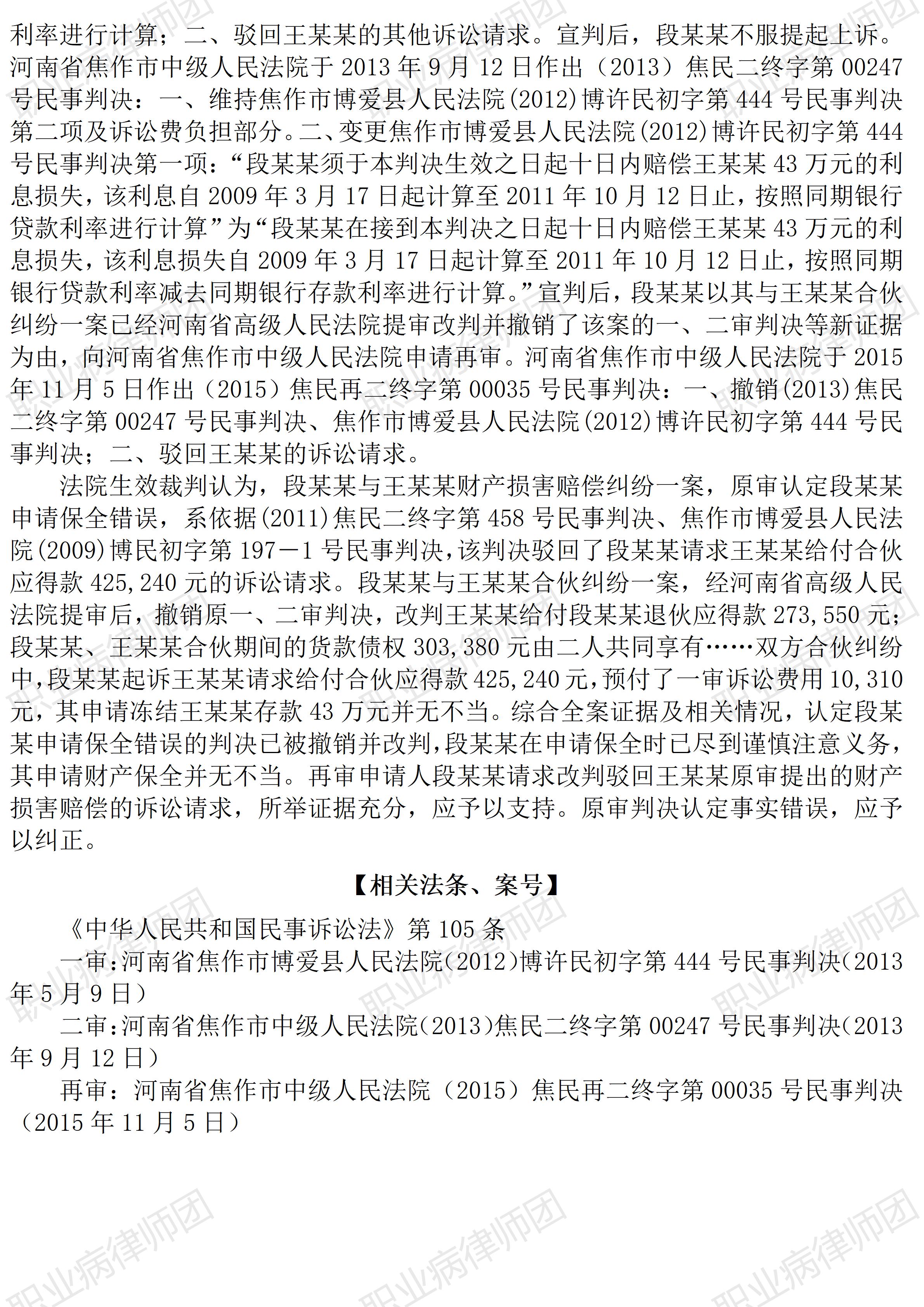 (深圳龙岗 大运中心) 以案说法352|职业病相关公报入库案例85:申请财产保全时尽到了合理注意义务的不应承担赔偿责任 本案案号:(2015)焦民再二终字第00035号 入库编号:2023-16-2-392-001 案例编号:5.1.85 OCA85 【基本案情】 【律师说法】 本案是一宗因财产保全措施引发的侵权责任纠纷。 申请财产保全是民事诉讼中常见的维权举措,劳动争议中劳动者为维护自身合法权益,也会视情形申请财产保全,并且,劳动者在劳动争议中申请财产保全更有特殊制度保障。 依据《民事诉讼法》第一百零四条第一款规定:“利害关系人因情况紧急,不立即申请保全将会使其合法权益受到难以弥补的损害的,可以在提起诉讼或者申请仲裁前向被保全财产所在地、被申请人住所地或者对案件有管辖权的人民法院申请采取保全措施。申请人应当提供担保,不提供担保的,裁定驳回申请。” 而依据《最高人民法院关于审理劳动争议案件适用法律问题的解释(一)》(法释〔2020〕26号)第四十九条规定:“在诉讼过程中,劳动者向人民法院申请采取财产保全措施,人民法院经审查认为申请人经济确有困难,或者有证据证明用人单位存在欠薪逃匿可能的,应当减轻或者免除劳动者提供担保的义务,及时采取保全措施。人民法院作出的财产保全裁定中,应当告知当事人在劳动争议仲裁机构的裁决书或者在人民法院的裁判文书生效后三个月内申请强制执行。逾期不申请的,人民法院应当裁定解除保全措施。” 因此,劳动者可以在启动劳动仲裁程序时申请诉前财产保全,还可根据自身经济状况申请减免担保义务。 但相关法律法规虽然规定如此,并非可以滥用财产保全制度。毕竟,《民事诉讼法》第一百零五条规定:“保全限于请求的范围,或者与本案有关的财物。”第一百零八条规定也明确:“申请有错误的,申请人应当赔偿被申请人因保全所遭受的损失。” 所以,任何人在申请财产保全时,首先要考虑自身诉求是否有相应的法律依据、事实基础,也要初步判断能够获得仲裁、法院支持的可能性,而不能漫无边际地随意申请财产保全,需要充分考量保全错误的风险。 当然,强调职业病病人申请财产保全需要谨慎,并非刻意限缩财产保全的范围与价值。作为一种重要的诉讼制度,同时也是权益受损害方重要的维权措施,职业病病人对财产保全措施还是需要根据案件需要来决定启用与否,以充分利用这一诉讼制度来维护自身合法权益。如果劳动者自身权益确实遭受损害,而用人单位又存在着生产经营不稳定迹象,后续胜诉后用人单位可能存在履行障碍的,还是应当及时申请财产保全。 毕竟,诚如本案生效裁判所示,认定财产保全错误的赔偿责任,需要综合考虑多种因素,尤其是申请人是否基于相应的事实和证据并尽到了合理注意义务,而并非单纯依据申请人的诉求最终是否获得法院生效裁判支持。(2026/1/9 11:05) 【收官】“职业病法律”公众号全部推文汇总(501-1000) 职业病问答65|用人单位注销后,职业病病人还能被认定工伤吗? 管仕武|关于《职业病诊断与鉴定管理办法》与《职业病防治法》冲突的审查建议 |