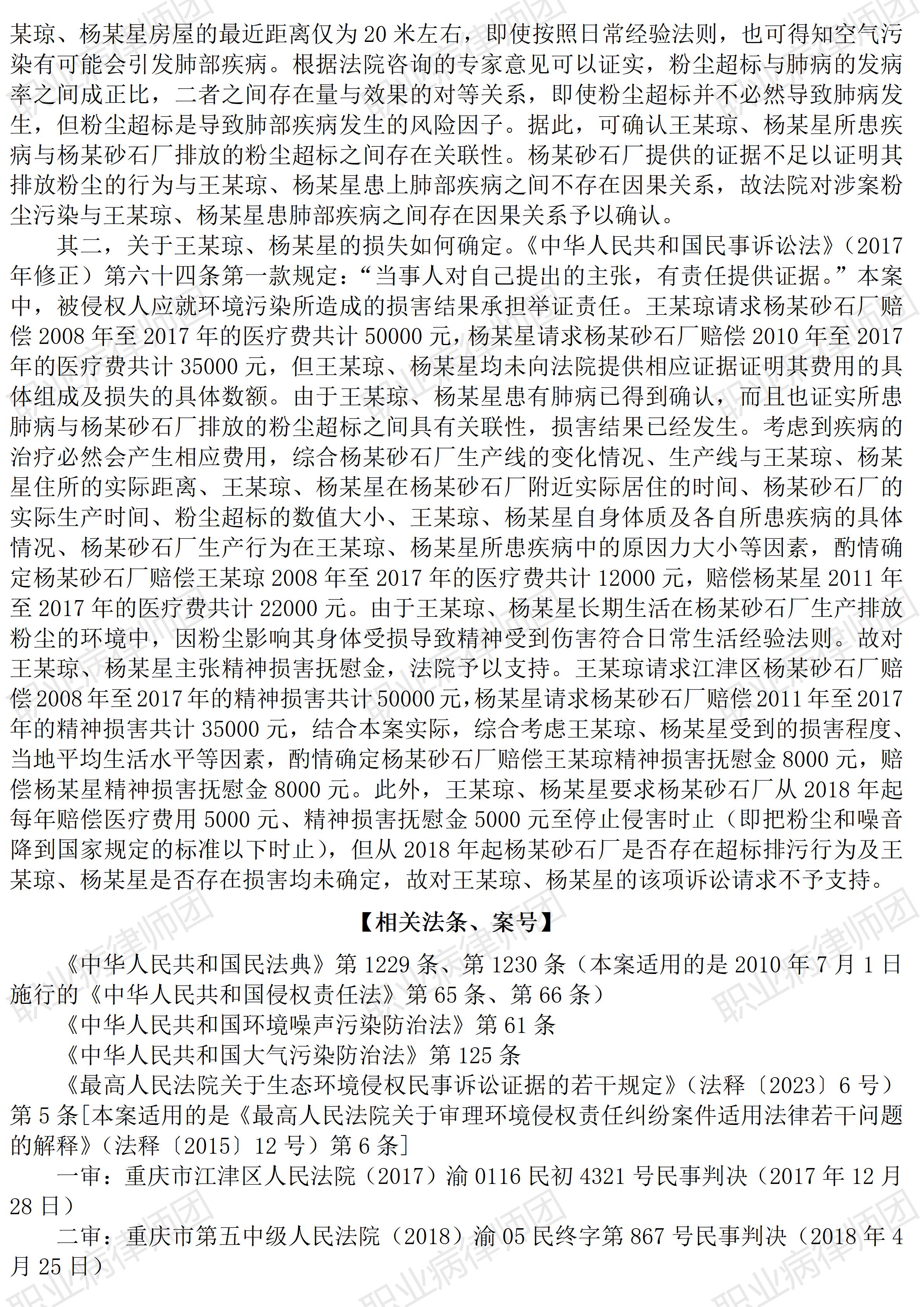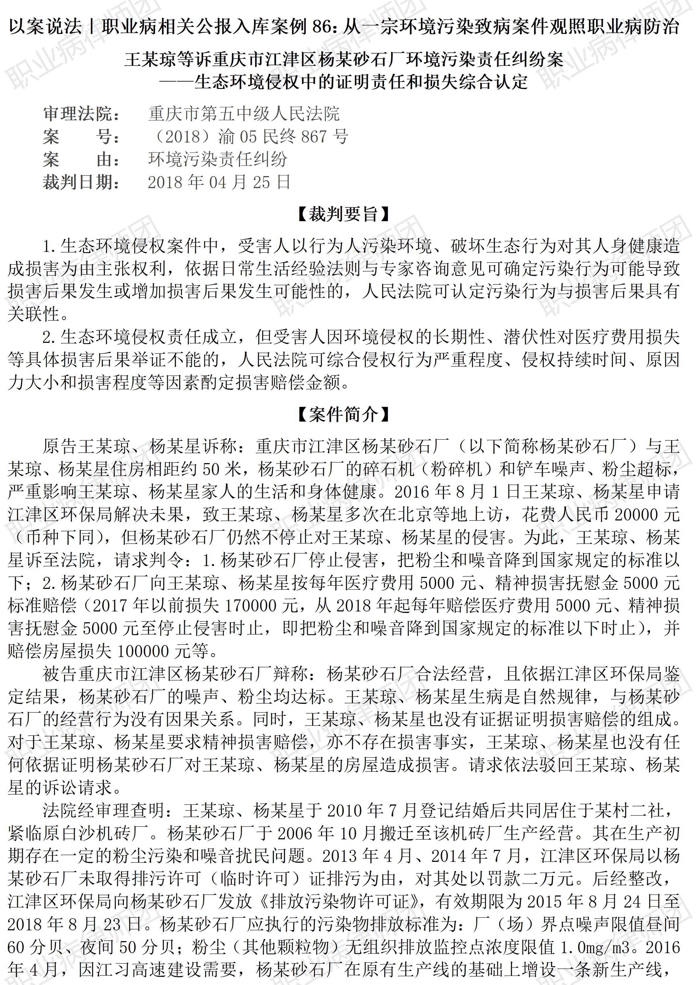 以案说法353|职业病相关公报入库案例86:从一宗环境污染致病案件观照职业病防治 本案案号:(2018)渝05民终867号 入库编号:2024-11-2-377-011 案例编号:5.1.86 OCA86 【案件简介】 【律师说法】 本案是一宗因环境污染引发的损害赔偿典型案件。 由于本案存在的特殊情形,污染者离受害者物理距离极近、污染时间很长、污染因子系生产性粉尘及噪声、受害者出现呼吸系统相应症状等,使得本案具有了与职业病特别是职业性尘肺极为相似的背景,分析本案生效裁判文书,会很自然地让人联想到职业病防治与保障问题。这也是笔者推介、评析本案的重要原因。 当然,本案患者并未被确诊为职业性尘肺病,甚至连非职业性的尘肺病也未见信息批露,因此,本文无法就病情相关直接评析。 但也正因此,本文对本案的评析有了更具价值的探讨。 尘肺病目前是我国职业病中占据绝对主要数量的职业病种类,由于尘肺病的特殊性,其需要长期接触相当数量的致病粉尘,因此,除了职业性环境,也就是在特定用人单位的生产经营环境,非职业性的生活环境、自然环境很难有导致尘肺病的条件:时间要足够长,含量要足够多,颗粒要足够小,这几样条件在非职业性环境中很难同时具备。但本案的出现,却令人无法忽视,极端特殊情形下,非职业性接触粉尘,也能致病。 因此,本案带来的思考,其中难以被非职业病相关人士所关注的问题是:类似本案所涉生活环境,能否导致尘肺病?如何确诊尘肺病? 由于公开的裁判文书信息所限,笔者无法得知本案患者是否患有尘肺病。笔者甚至斗胆猜测,本案缺失尘肺病相关信息的原因,不外有二: 一是患者确实没有尘肺病。但综合来看,此种情形大概率并不成立,毕竟近距离持续数年接触超标致病粉尘,又出现了肺部病变,而且并非孤例; 二是患者没有确诊尘肺病。但未能确诊的原因,又可分为三种: 患者没有去寻求尘肺病的确诊,或者 相关医疗机构并未进行尘肺病的检查与诊断,或者 相关医疗机构虽然发现了尘肺症状,但出于种种顾虑,未能给出尘肺结论,包括打问号的、考虑尘肺可能的待定判断。 进一步的问题是,如果本案患者与案涉砂石建立了劳动或者劳务关系,又当如何判定、处理?能确诊职业性尘肺病吗?——此问当然仅能假设。但假设并非毫无意义,毕竟,现实中居民就近务工的情形比较常见。 本案涉及的危害因子是粉尘,现实中还有众多的同样存在于职业性与非职业性环境中的危害因子,比如噪声、有毒有害物质(包括气体、烟尘、化学品等)、放射性危害等等。 更重要的是,污染者与受害者之间,因为特定的劳动或者劳务关系,进而导致同样一种疾病出现两种完全不同的界定和处理制度,我们可以理解各自制度背后的政策乃至政治考虑,但能否同样关注在制度人为的区分下,同样的污染致害,和同样的污染受害,对加害者的归责与对受害者的保护能否建立某种更为合理的制度勾连,避免出现不合理的权利失序?比如对因果关系的认定,可以考虑无论是职业性还是非职业性致害,均可明确适用过错推定、甚至无过错责任归责原则?比如相关举证责任,同样明确要求加害者承担主要举证责任,否则即承担举证不能的不利后果? 值得深思。(2026/1/9 12:22) 【收官】“职业病法律”公众号全部推文汇总(501-1000) 职业病问答65|用人单位注销后,职业病病人还能被认定工伤吗? 管仕武|关于《职业病诊断与鉴定管理办法》与《职业病防治法》冲突的审查建议 |