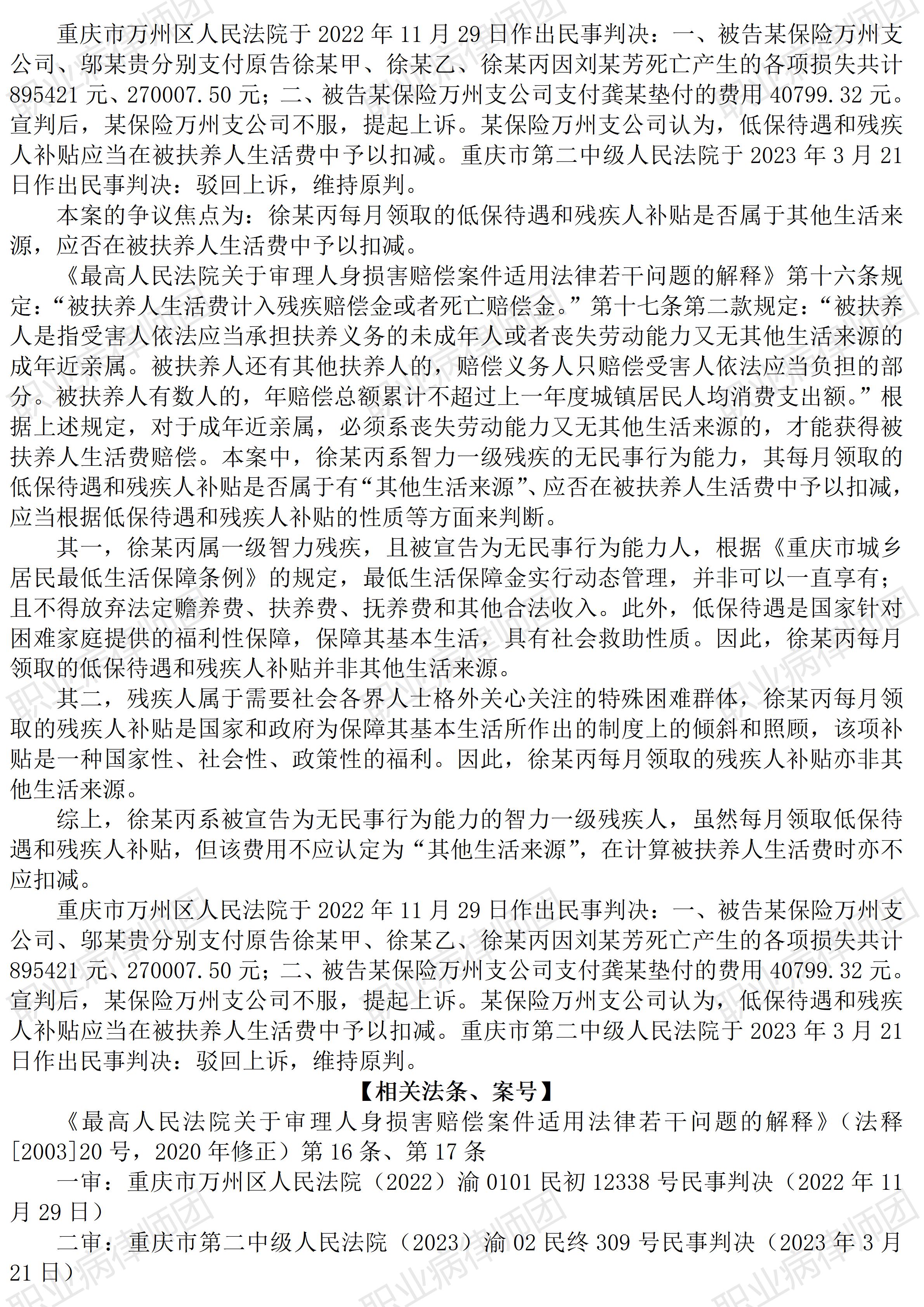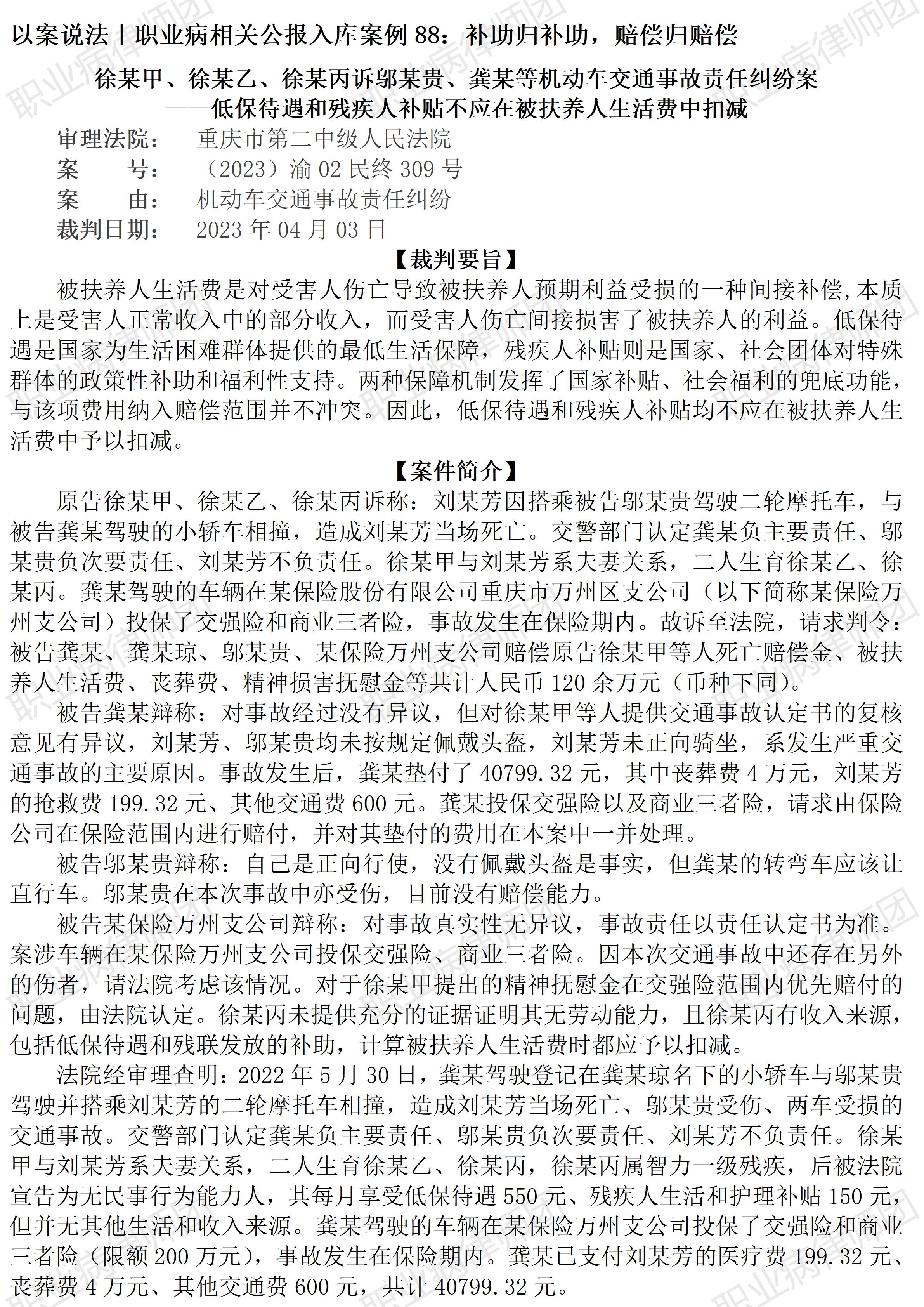 以案说法355|职业病相关公报入库案例88:补助归补助,赔偿归赔偿 本案案号:(2023)渝02民终309号 入库编号:2025-07-2-374-005 案例编号:5.1.88 OCA88 【案件简介】 【律师说法】 本案是一宗交通事故引发的损害赔偿纠纷。因案涉被扶养人生活费与低保待遇、残疾人补贴之间的界定,且类似争议在相关人身损害赔偿纠纷中很常见,因而,本案的入库,为类似案件提供了非常重要的参考价值。 本案中,赔偿义务人认为被扶养人生活费与低保待遇、残疾人补贴两项待遇性质相同、应予抵扣,但生效裁判则认定二者性质不同、不予抵扣。之所以有类似争议,主要在于二者同样针对被扶养人提供生活支持,如果仅从表面看来,似乎二者性质相同,因而应当抵扣,避免重复获益。 但实际上,无论是低保待遇,还是残疾人补贴,均属社会保障范畴,是国家和社会对特定人群的托底性质的保障与福利,与任何主观过错均无关联;而被扶养人生活费则是根据扶养义务人的扶养能力受损程度确定的赔偿,属于侵权责任范畴,其责任基础是侵权过错。因此,二者不能直接比较、抵扣。 职业病病人和特殊工伤患者诉求民事赔偿案件中,也普遍面临这种补、赔偿诉求的争议,支持者认为工伤补偿与民事赔偿不能混同,但反对者则认为二者性质相同,应予抵扣。这也是当下职业病民事赔偿审判结果千差万别的主要原因之一。(2026/1/9 16:41) 【收官】“职业病法律”公众号全部推文汇总(501-1000) 职业病问答65|用人单位注销后,职业病病人还能被认定工伤吗? 管仕武|关于《职业病诊断与鉴定管理办法》与《职业病防治法》冲突的审查建议 |
