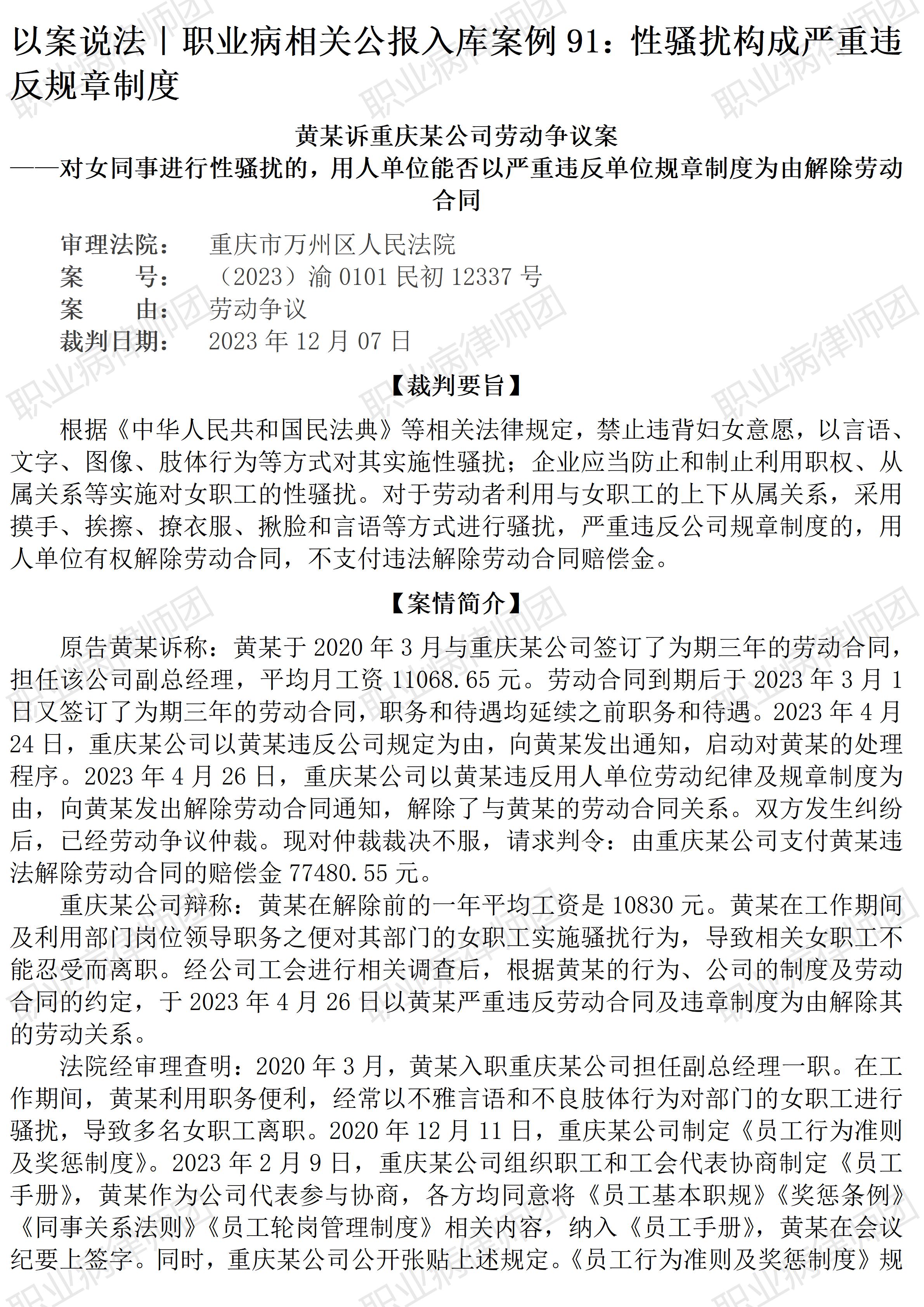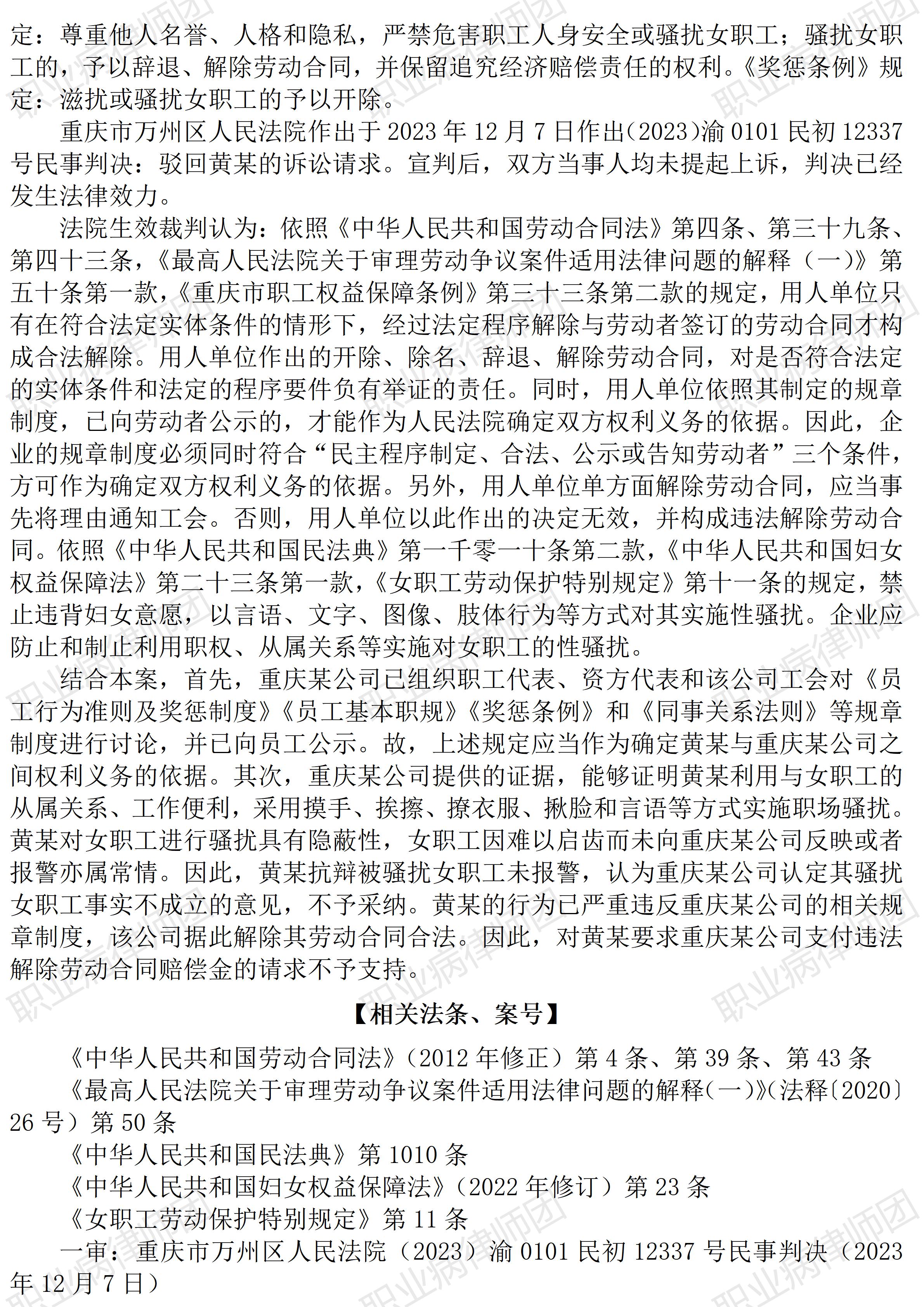 以案说法358|职业病相关公报入库案例91:性骚扰构成严重违反规章制度 本案案号:(2023)渝0101民初12337号 入库编号:2024-07-2-490-010 案例编号:5.1.91 OCA91 【案情简介】 【律师说法】 本案是一宗涉及职场性骚扰的典型案例。 性骚扰行为违背受害者意愿、忽视人的主体性,将人作为满足自身性欲望的客体,因此是一种侵犯人格尊严的行为。 需要明确的是,性骚扰的受害对象并不限于女性,只不过现实中更多个案常见女性受害。 性骚扰作为一项涉及公民性自主人格权的违法行为,国内相关法律法规包括地方性规定早有相应规范,早在上世纪九十年代即已出现,如1994年《湖北省实施〈中华人民共和国妇女权益保障法〉办法》第三十二条第二款即明确规定:“禁止对妇女进行性骚扰。禁止非法搜查妇女的身体。”2020年《民法典》作了也对此进行了明确规范。目前在教育、劳动等领域防范、治理性骚扰问题的工作相对更为突出,如《人力资源社会保障部办公厅等六部门关于印发《工作场所女职工特殊劳动保护制度(参考文本)》和《消除工作场所性骚扰制度(参考文本)》的通知》(人社厅发〔2023〕8号)。现行法律法规中明确规范性骚扰问题的规定包括: 《民法典》第一千零一十条规定: “违背他人意愿,以言语、文字、图像、肢体行为等方式对他人实施性骚扰的,受害人有权依法请求行为人承担民事责任。 机关、企业、学校等单位应当采取合理的预防、受理投诉、调查处置等措施,防止和制止利用职权、从属关系等实施性骚扰。” 《妇女权益保障法》第二十三条第一款规定: “禁止违背妇女意愿,以言语、文字、图像、肢体行为等方式对其实施性骚扰。” 《女职工劳动保护特别规定》(国务院令第619号)第十一条规定: “在劳动场所,用人单位应当预防和制止对女职工的性骚扰。” 因此,从《民法典》到《妇女权益保障法》都对性骚扰明确说“不”,而在职场中,预防和制止性骚扰更是用人单位的一项法定义务。因此,用人单位有权对实施性骚扰的员工予以监督并作出相应处理。 同时,上述法律法规中《妇女权益保障法》与《女职工劳动保护特别规定》均明确“禁止”性骚扰,而《民法典》虽然使用“禁止”字样,也直接规定了受害人有权诉求行为人承担民事责任,同样也明确企业、学校等单位有义务防止性骚扰,因此,从上述规定不难看出,我国现行法律法规对性骚扰是持完全否定标准,劳动场所实施性骚扰的,很容易构成严重违章。 但仍有必要提示的是,从合规用工的角度,用人单位对实施性骚扰的员工作出监督处理,特别是涉及处罚、解除劳动关系的,建议用人单位将相关法律规定内化为本单位内部规章制度,并启动民主程序完成制定、公告等工作,将性骚扰行为纳入相应的违章违纪与对应的处罚情形中,以便有章可循、照章处理。(2026/1/12 16:29) 【收官】“职业病法律”公众号全部推文汇总(501-1000) 职业病问答65|用人单位注销后,职业病病人还能被认定工伤吗? 管仕武|关于《职业病诊断与鉴定管理办法》与《职业病防治法》冲突的审查建议 |
