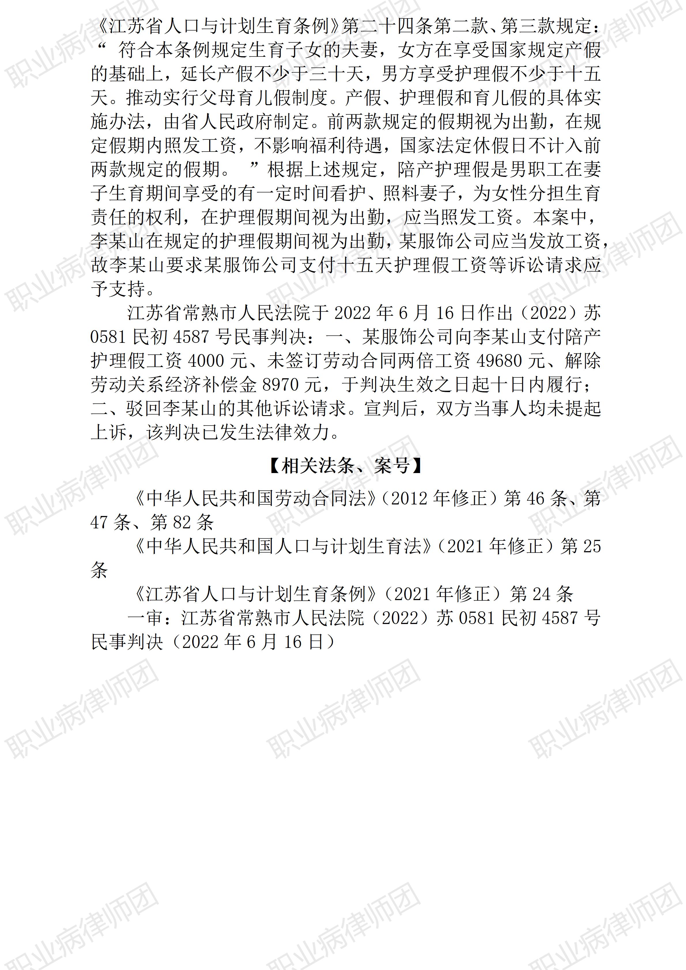 以案说法368|职业病相关公报入库案例101:男职工也能享受生育假 本案案号:(2022)苏0581民初4587号 入库编号:2024-07-2-490-007 案例编号:5.1.101 OCA101 【案件简介】 【律师说法】 本案是一宗涉及男职工诉求陪产护理假的典型案例。本案案情并不复杂,但涉及的男性护理假却具有普遍性,而被遴选为入库案例,本案对类似争议的处理将具有重要参考价值。事实上,能成为入库案例的,未必需要案情特别复杂,选择考量的因素更看重相关争议的普遍性及争议解决的代表性与可参考性。 为人夫为人父,男职工同样负有生育使命。我国法律层面对男性的此项需求也早有明确规定,如《人口与计划生育法》(2021修正): 第二十五条 符合法律、法规规定生育子女的夫妻,可以获得延长生育假的奖励或者其他福利待遇。国家支持有条件的地方设立父母育儿假。 此处的生育假及相关待遇同时指向夫妻、父母。当然,受各地社会经济发展水平制约,法律将具体的假期及待遇标准授权给地方。 《江苏省人口与计划生育条例》(2021修正)则规定: 第二十四条依法办理结婚登记的夫妻,在享受国家规定婚假的基础上,延长婚假十天。 符合本条例规定生育子女的夫妻,女方在享受国家规定产假的基础上,延长产假不少于三十天,男方享受护理假不少于十五天。推动实行父母育儿假制度。产假、护理假和育儿假的具体实施办法,由省人民政府制定。 前两款规定的假期视为出勤,在规定假期内照发工资,不影响福利待遇,国家法定休假日不计入前两款规定的假期。 用人单位根据具体情况,可以给予其他优惠待遇。 因此,法律法规明确规定赋予男职工的生育假,用人单位应当保障实现,履行其法定义务,包括安排相应的假期并及时足额支付工资待遇。(2026/1/15 14:59) 【收官】“职业病法律”公众号全部推文汇总(501-1000) 职业病问答65|用人单位注销后,职业病病人还能被认定工伤吗? 管仕武|关于《职业病诊断与鉴定管理办法》与《职业病防治法》冲突的审查建议 |