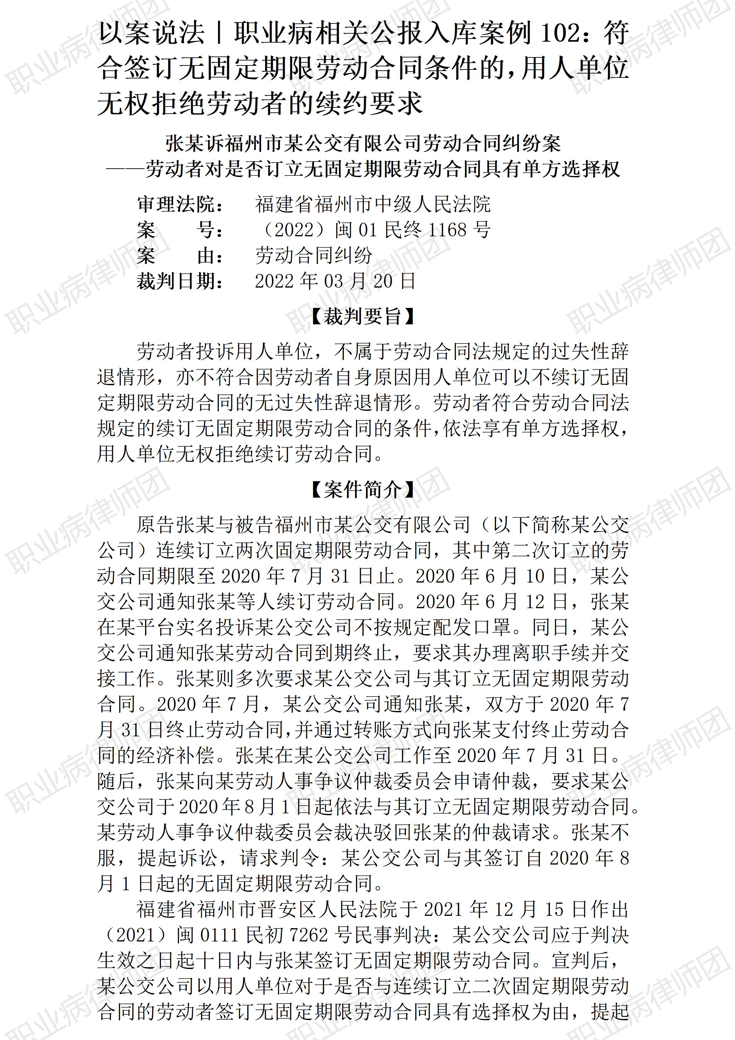 以案说法369|职业病相关公报入库案例102:符合签订无固定期限劳动合同条件的,用人单位无权拒绝劳动者的续约要求 本案案号:(2022)闽01民终1168号 入库编号:2024-07-2-186-003 案例编号:5.1.102 OCA102 【案件简介】 【律师说法】 本案是一宗涉及签订无固定期限劳动合同的典型纠纷。 本案也同样是一宗案情并不复杂但却非常有代表性的案件。作为入库案例,本案生效裁判明确给出结论:对符合签订无固定期限劳动合同条件的,只要劳动者提出或者同意签订无固定期限劳动合同,用人单位均应签订无固定期限劳动合同。换言之,对符合法定条件者,是否签订无固定期限劳动合同,劳动者具有单方选择权。 需要强调的是,这一裁判标准对职业病受害劳动者维护自身合法权益意义重大!实务中,常见劳动者遭受职业病损害,而现行不合理地统一的工伤保险制度下,用人单位往往利用法律赋予的用工自主权,对七级以下伤残等级的职业病患者,在劳动合同到期后不再续约,即使劳动者明确要求续签劳动合同也无济于事。而当劳动者遭受职业病损害又因故未能确诊为职业病之时,这种续签无固定期限劳动合同的权益对劳动者来说就尤为重要。因为,劳动者已经出现健康受损,但在现单位又无法确诊为职业病,再就业又将面临职业禁忌的禁锢,此时,能够维系现有劳动关系,对于这些劳动者自然格外珍贵。然而,现实中用人单位反倒尤其缺乏与此类劳动者续约的意愿。比如听力受损,手臂振动病受害者,特定毒害物质接触反应者,等等。 有关无固定期限劳动合同的签订问题,与未签订书面劳动合同的双倍工资差额问题,是当年《劳动合同法》出台之后争议非常突出的两大争议问题。从《劳动合同法》相关条款的文义解释来看,可以说这两个问题都规定的再清楚不过,但实务中却反复无常,莫衷一是。 《劳动合同法》(2012修正)第十四条规定: 第十四条无固定期限劳动合同,是指用人单位与劳动者约定无确定终止时间的劳动合同。 用人单位与劳动者协商一致,可以订立无固定期限劳动合同。有下列情形之一,劳动者提出或者同意续订、订立劳动合同的,除劳动者提出订立固定期限劳动合同外,应当订立无固定期限劳动合同: (一)劳动者在该用人单位连续工作满十年的; (二)用人单位初次实行劳动合同制度或者国有企业改制重新订立劳动合同时,劳动者在该用人单位连续工作满十年且距法定退休年龄不足十年的; (三)连续订立二次固定期限劳动合同,且劳动者没有本法第三十九条和第四十条第一项、第二项规定的情形,续订劳动合同的。 用人单位自用工之日起满一年不与劳动者订立书面劳动合同的,视为用人单位与劳动者已订立无固定期限劳动合同。 而《劳动合同法实施条例》(国务院2008年第535号令)第十一条规定更为明确: 第十一条除劳动者与用人单位协商一致的情形外,劳动者依照劳动合同法第十四条第二款的规定,提出订立无固定期限劳动合同的,用人单位应当与其订立无固定期限劳动合同。对劳动合同的内容,双方应当按照合法、公平、平等自愿、协商一致、诚实信用的原则协商确定;对协商不一致的内容,依照劳动合同法第十八条的规定执行。 实务中,对于劳资双方均有意续签劳动合同的,劳动者提出签订无固定期限劳动合同而用人单位不同意的,应当签订无固定期限劳动合同,这种情形的处理,实务中相对较少分歧。 但如果用人单位根本就不同意续签劳动合同,要求如期终止劳动合同时,劳动者要求续签、且要求签订无固定期限劳动合同的,用人单位是否应当满足劳动者要求呢?实务中对此问题纷争不断。但其实,从上述《劳动合同法》第十四条及《劳动合同法实施条例》第十一条规定,不难看出法律法规早就将是否签订无固定期限劳动合同的选择权(决定权)赋予了劳动者,用人单位无权拒绝,只能满足劳动者的要求。 之所以如此规定,概因《劳动合同法》立法本意就在于倡导劳动合同关系的稳定和长期化,同时,对于劳动者的合法(合理)要求也优先满足。对于劳动者在同一用人单位连续工作满十年、连续订立二次固定期限劳动合同等情形,此时劳动者对于延续劳动关系的意愿已非常明显,而随着年龄增长其再就业难度也势必增加,此时,照顾劳动者将已有相应经验积累的劳动合同关系长期延续下去,不仅能够保障劳动者的合理需求,也并不会不合理地增加用工成本,而从稳定社会关系的宏观层面来看,如此处理显然更利于实现多赢。(2026/1/15 15:58) 【收官】“职业病法律”公众号全部推文汇总(501-1000) 职业病问答65|用人单位注销后,职业病病人还能被认定工伤吗? 管仕武|关于《职业病诊断与鉴定管理办法》与《职业病防治法》冲突的审查建议 |