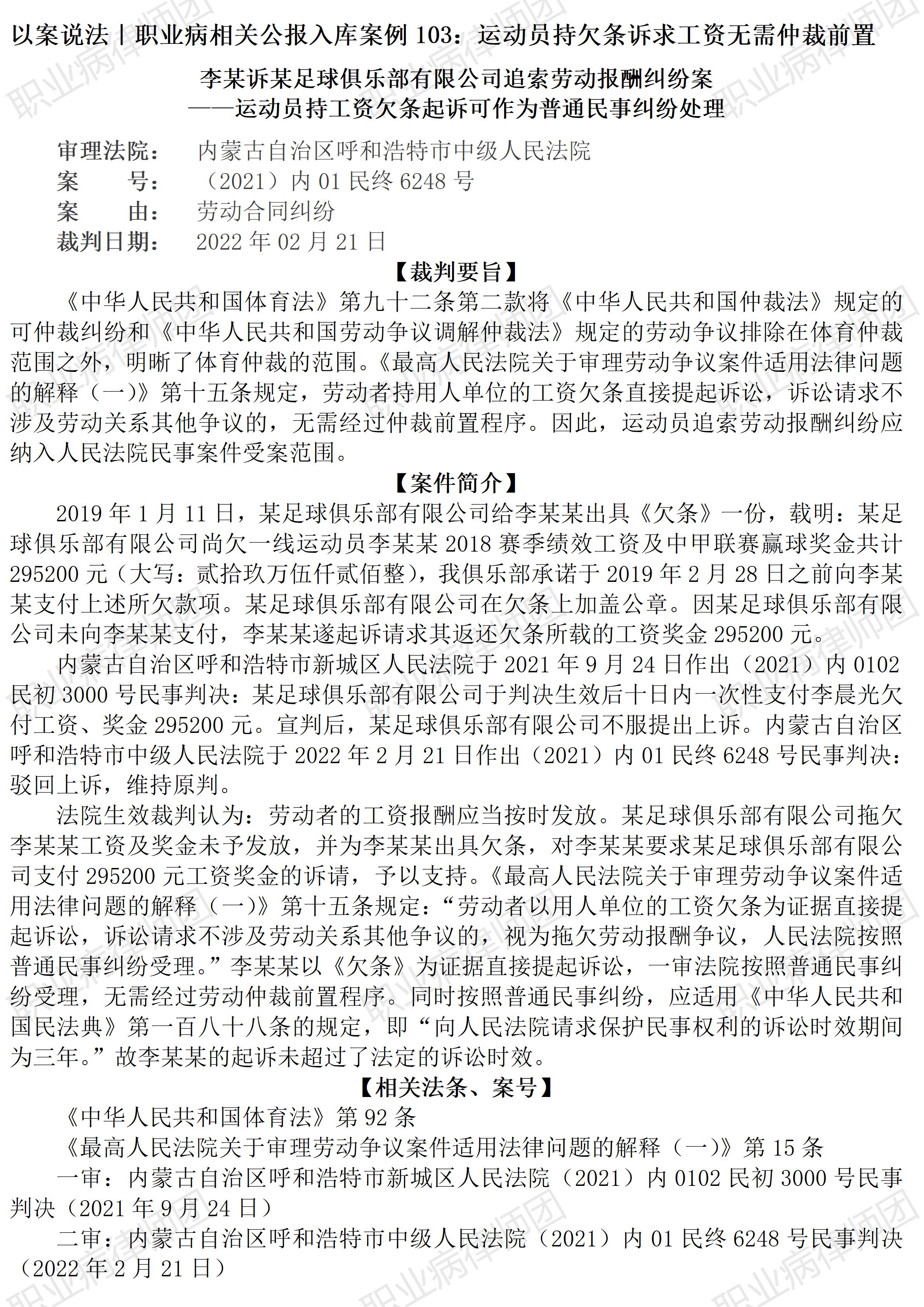 (这盆植太漂亮了,跟假的一样 以案说法370|职业病相关公报入库案例103:运动员持欠条诉求工资无需仲裁前置 本案案号:(2021)内01民终6248号 入库编号:2023-07-2-186-010 案例编号:5.1.103 OCA103 【案件简介】 【律师说法】 本案是一宗涉及足球运动员诉求工资的典型案例。 市场经济条件下,文化、娱乐、体育等也都需要面向市场,运动员与所属俱乐部之间也同样面临相应的管理及可能的纠纷,如果俱乐部克扣、拖欠运动员工资,则面临仲裁、诉讼等法律途径的选择。 本案中,运动员直接持俱乐部出具的欠条向法院起诉,要求俱乐部付清拖欠的工资。案涉俱乐部则提出异议,包括本案需先经仲裁前置,并且本案应当适用《体育法》。 本案生效裁判认定,依据《体育法》(2022修订)第九十二条规定: 第九十二条当事人可以根据仲裁协议、体育组织章程、体育赛事规则等,对下列纠纷申请体育仲裁: (一)对体育社会组织、运动员管理单位、体育赛事活动组织者按照兴奋剂管理或者其他管理规定作出的取消参赛资格、取消比赛成绩、禁赛等处理决定不服发生的纠纷; (二)因运动员注册、交流发生的纠纷; (三)在竞技体育活动中发生的其他纠纷。 《中华人民共和国仲裁法》规定的可仲裁纠纷和《中华人民共和国劳动争议调解仲裁法》规定的劳动争议,不属于体育仲裁范围。 因此,本案可排除体育仲裁而应当采行劳动争议仲裁。 同时,依据《最高人民法院关于审理劳动争议案件适用法律问题的解释(一)》第十五条规定: 第十五条劳动者以用人单位的工资欠条为证据直接提起诉讼,诉讼请求不涉及劳动关系其他争议的,视为拖欠劳动报酬争议,人民法院按照普通民事纠纷受理。 因此,本案可无需经过劳动仲裁前置程序。本案生效裁判最终支持了运动员诉求的全部工资。 顺便提示下,案涉运动员后续又向案涉俱乐部诉求案涉工资欠条在付清之前的利息,同样是直接向法院起诉,一审法院以重复诉讼不予受理,二审法院裁定撤销一审裁定并指令一审法院受理,该案后续裁判文书未见公开;之后,案涉运动员再次诉求俱乐部支付后续拖欠的工资,同时还诉求拖欠的奖金数百万元,一审法院则仅支持了工资数千元,二审法院改判增加支持了部分奖金逾百万元。(2026/1/16 10:49) 【收官】“职业病法律”公众号全部推文汇总(501-1000) 管仕武|关于《职业病诊断与鉴定管理办法》与《职业病防治法》冲突的审查建议 |