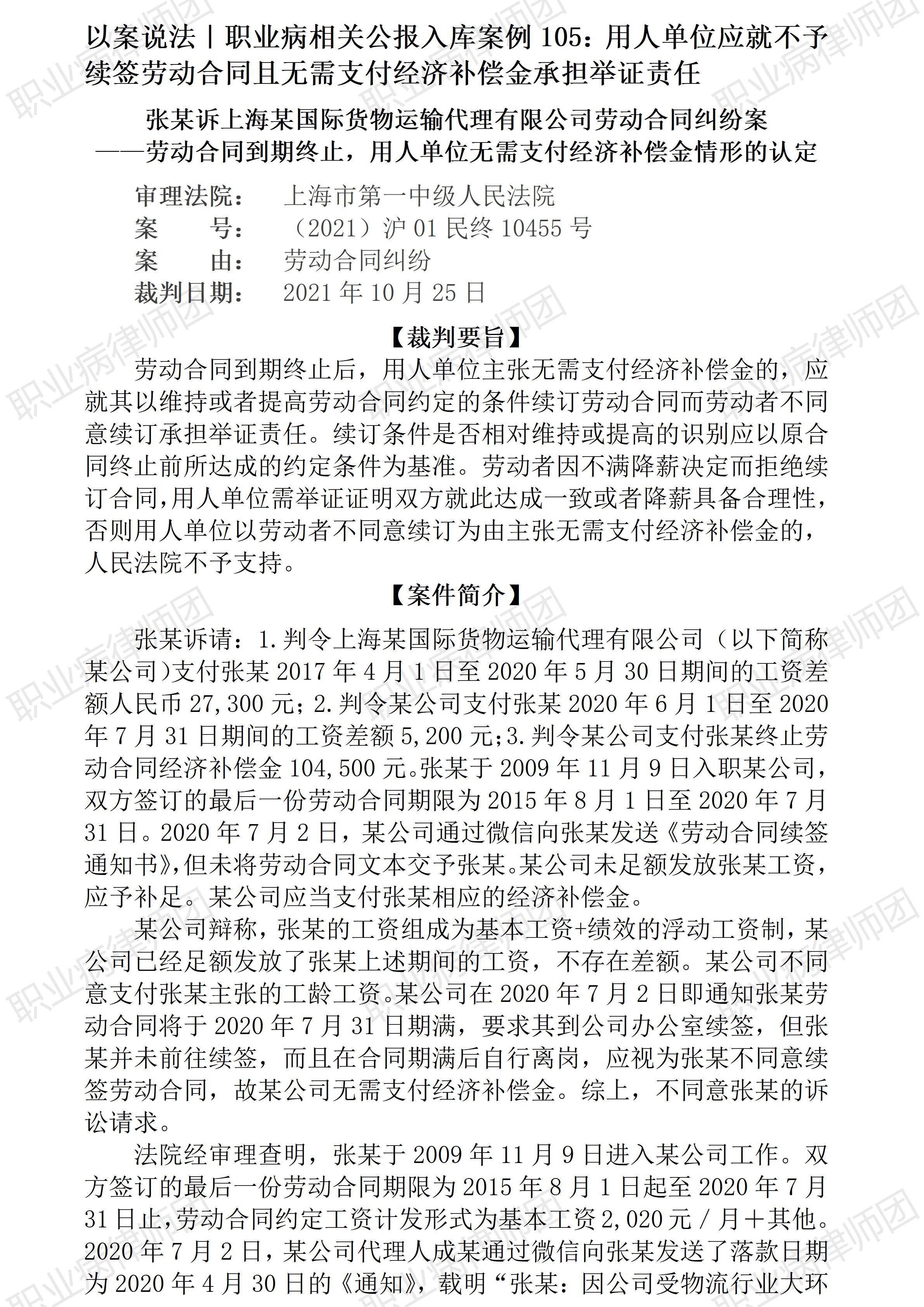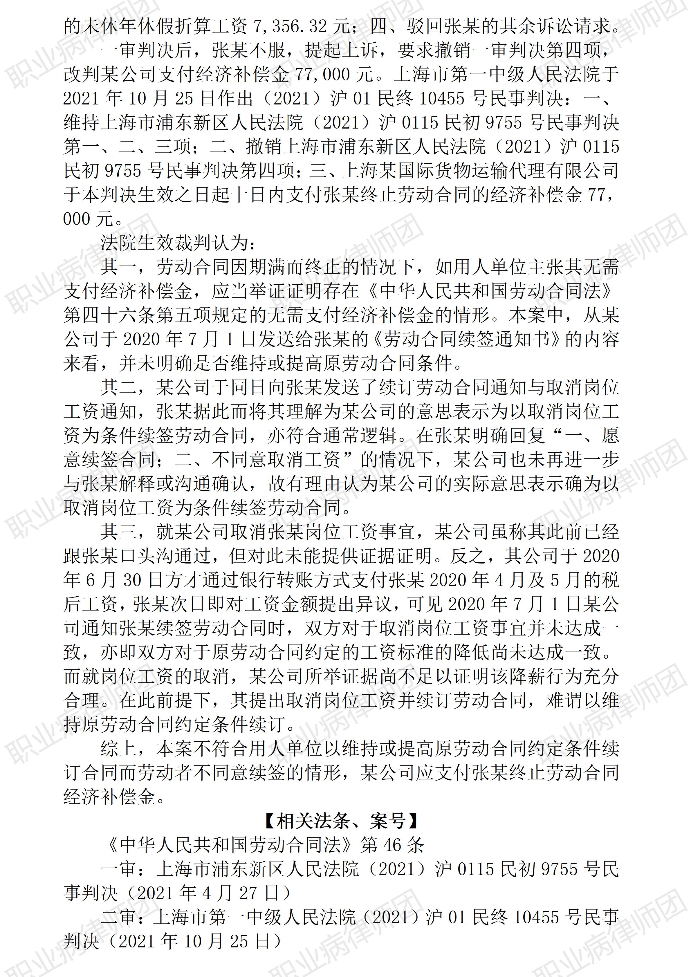 以案说法372|职业病相关公报入库案例105:用人单位应就不予续签劳动合同且无需支付经济补偿金承担举证责任 本案案号:(2021)沪01民终10455号 入库编号: 2023-07-2-186-005 案例编号:5.1.105 OCA105 【案件简介】 【律师说法】 本案是一宗涉及劳动合同到期未能续签而应否支付经济补偿金的典型案例。 《劳动合同法》(2012修正)第四十六规定了应予支付经济补偿金的情形: 第四十六条 有下列情形之一的,用人单位应当向劳动者支付经济补偿: (一)劳动者依照本法第三十八条规定解除劳动合同的; (二)用人单位依照本法第三十六条规定向劳动者提出解除劳动合同并与劳动者协商一致解除劳动合同的; (三)用人单位依照本法第四十条规定解除劳动合同的; (四)用人单位依照本法第四十一条第一款规定解除劳动合同的; (五)除用人单位维持或者提高劳动合同约定条件续订劳动合同,劳动者不同意续订的情形外,依照本法第四十四条第一项规定终止固定期限劳动合同的; (六)依照本法第四十四条第四项、第五项规定终止劳动合同的; (七)法律、行政法规规定的其他情形。 依据上述《劳动合同法》第四十六条第五项规定,用人单位维持或者提高劳动合同约定条件续订劳动合同而劳动者不同意续订的情形,即属于用人单位无需支付经济补偿金的法定情形。但适用该情形的前提条件是,劳动合同到期而用人单位愿意续订,并且保证续订劳动合同的条件不低于(可以维持或者提高)原劳动合同约定条件。但在实务中,用人单位往往只强调劳动者不同意续订,却有意无意地不提自身降低续约条件。本案即是此类争议的典型。 本案当中,劳动者确实没有配合续订劳动合同,用人单位据此强调不予续订劳动合同的责任在劳动者,故不同意支付经济补偿金,本案仲裁、一审阶段劳动者诉求相应经济补偿金的诉求均未获支持,也侧面证明了用人单位的主张和陈述获得了仲裁机构与法院的认可。 然而事实上,劳动者不同意续订劳动合同并非没有正当理由,也并非单纯不愿续订劳动合同,而是由于用人单位降低了其工资待遇,虽然用人单位也强调取消劳动者岗位工资是由于疫情等,但此等理由并不能成为降低续订劳动合同的合法理由,劳动者对此予以拒绝则属于合法的正当理由。针对未能续订案涉劳动合同存在两种事实:用人单位强调是劳动者自行离职致未能续订,劳动者则强调是用人单位降低工资因而也是降低续订劳动合同的约定条件导致本人无法接受。此时,谁该承担证明不能续订案涉劳动合同的证明责任无疑是关键。生效裁判依据《劳动合同法》第四十六条之规定,将相应的证明责任分配给用人单位,换言之,用人单位主张系劳动者原因致未能续订劳动合同,在劳动者明确否定后,用人单位即应举证证明其续订劳动合同的约定条件不低于原劳动合同约定条件。如此处理,显然更符合法律规定,也更有合理平衡劳资双方权利义务。(2026/1/16 15:36) 【收官】“职业病法律”公众号全部推文汇总(501-1000) 管仕武|关于《职业病诊断与鉴定管理办法》与《职业病防治法》冲突的审查建议 |