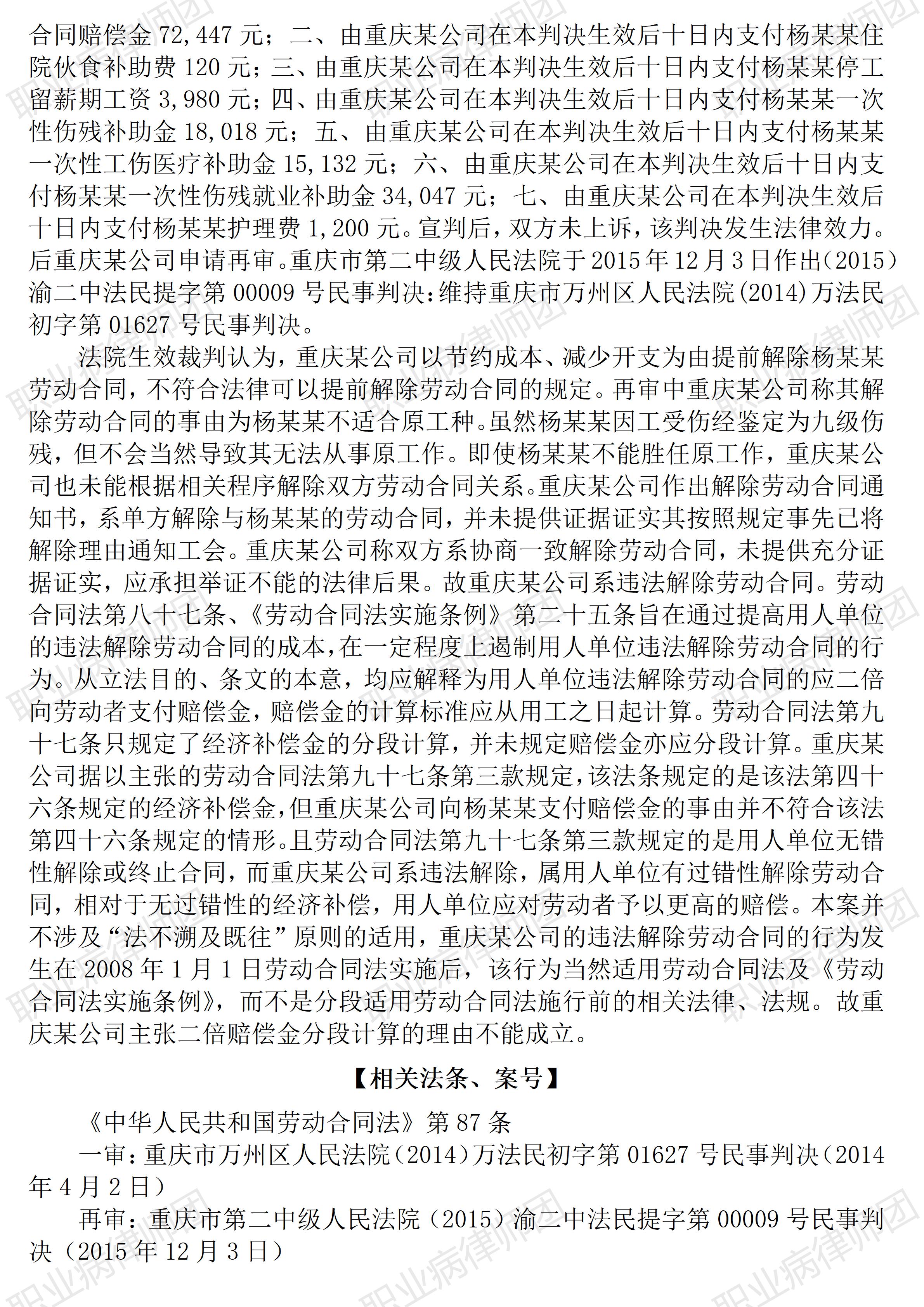 以案说法386|职业病相关公报入库案例119:支付二倍赔偿金应自劳动者入职之日起连续计算 本案案号:(2015)渝二中法民提字第00009号 入库编号:2023-16-2-186-003 案例编号:5.1.119 OCA119 【案件简介】 【律师说法】 本案是一宗涉及用人单位违法解除赔偿金的起算年限的典型案例。 案涉用人单位主张其并非违法解除,而是因为要节约成本、减少开支,由于本案经过了再审,再审期间用人单位将解除理由改为劳动者遭受工伤不再适合原工种。但其前后主张的两种解除理由,均不符合《劳动合同法》第三十九条所规定的可无偿解除劳动合同的情形,用人单位节约成本、减少开支不能以直接辞退劳动者为方向,而劳动者即使遭受工伤,也并不必然不适合原工作,何况,除非劳动合同到期依法终止,用人单位对工伤职工更应保障其劳动关系的稳定。因此,案涉用人单位解除当事劳动者实属违法。 而本案最大的争议焦点在于,劳动者在《劳动合同法》生效之前入职,用人单位强调即使要支付赔偿金,也只应从《劳动合同法》生效后起算支付年限。生效裁判最终否定了用人单位的这种主张,认定应当自劳动者实际入职之日起连续计算用人单位违法解除劳动合同所产生的二倍赔偿金。对此,分析相关法律法规规定,其实不难看出生效裁判的准确理解: 《劳动合同法》(2012修正)第八十七条规定: 第八十七条 用人单位违反本法规定解除或者终止劳动合同的,应当依照本法第四十七条规定的经济补偿标准的二倍向劳动者支付赔偿金。 《劳动合同法实施条例》(国务院令第535号)第二十五条进一步明确: 第二十五条 用人单位违反劳动合同法的规定解除或者终止劳动合同,依照劳动合同法第八十七条的规定支付了赔偿金的,不再支付经济补偿。赔偿金的计算年限自用工之日起计算。 至于案涉用人单位强调的《劳动合同法》第九十七条第三款的规定,原本是针对支付经济补偿金的情形,即用人单位合法终止劳动关系且不存在过错的情形,而本案系用人单位违法解除,过错显而易见,所应承担的赔偿金标准则应直接适用《劳动合同法》第八十七条。 因此,本案生效裁判抓住了用人单位违法解除的过错性这一关键性特征,既明确固定了应予适用的法条依据,也自然排除了“法不溯及既往”的法律适用原则:对违法行为而言,相关法律能否适用,关键是看违法行为发生的时间,而不是与违法行为相关的其他法律关系的发生时间。(2026/1/24 18:05) 【收官】“职业病法律”公众号全部推文汇总(501-1000) 管仕武|关于《职业病诊断与鉴定管理办法》与《职业病防治法》冲突的审查建议 |
