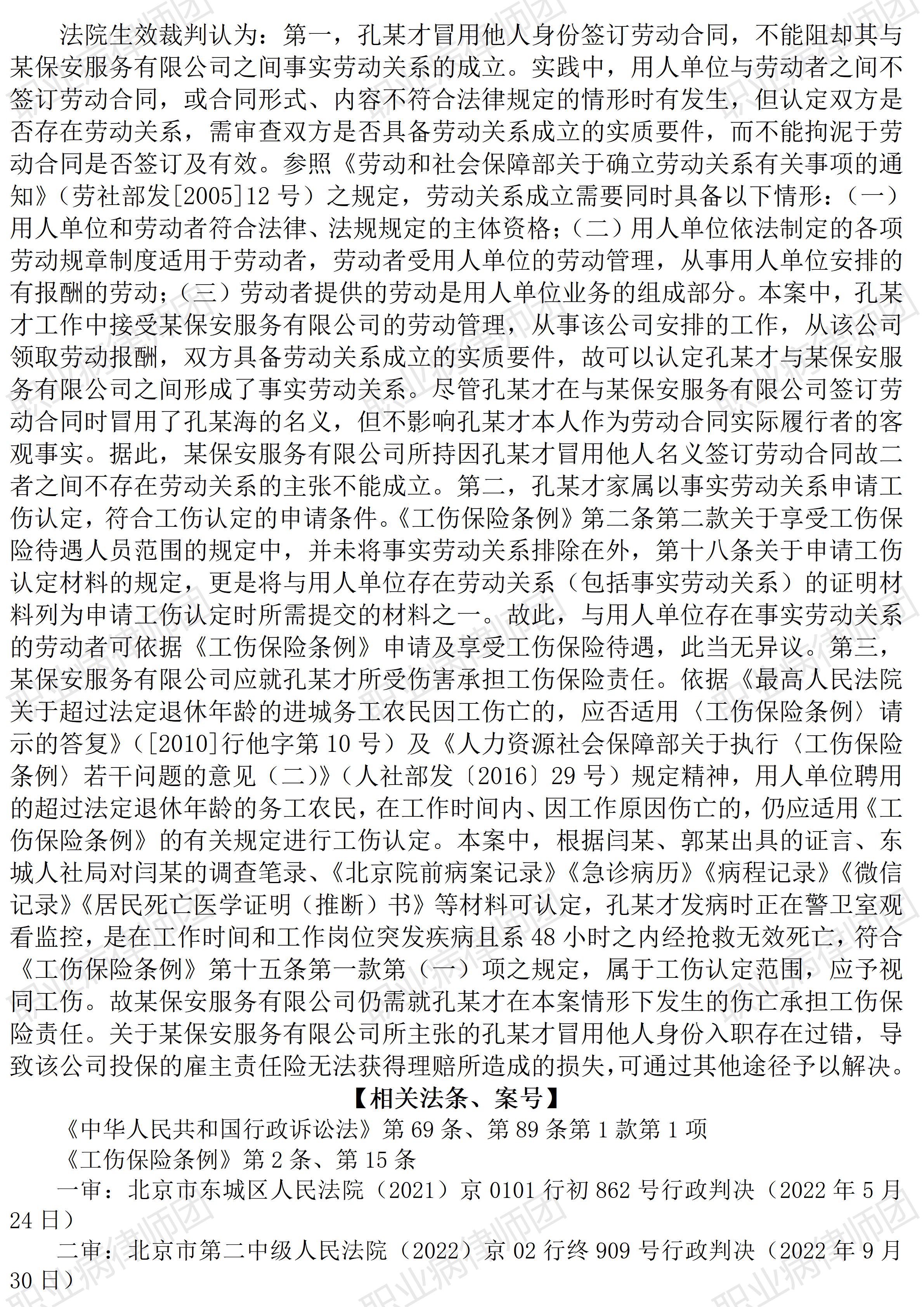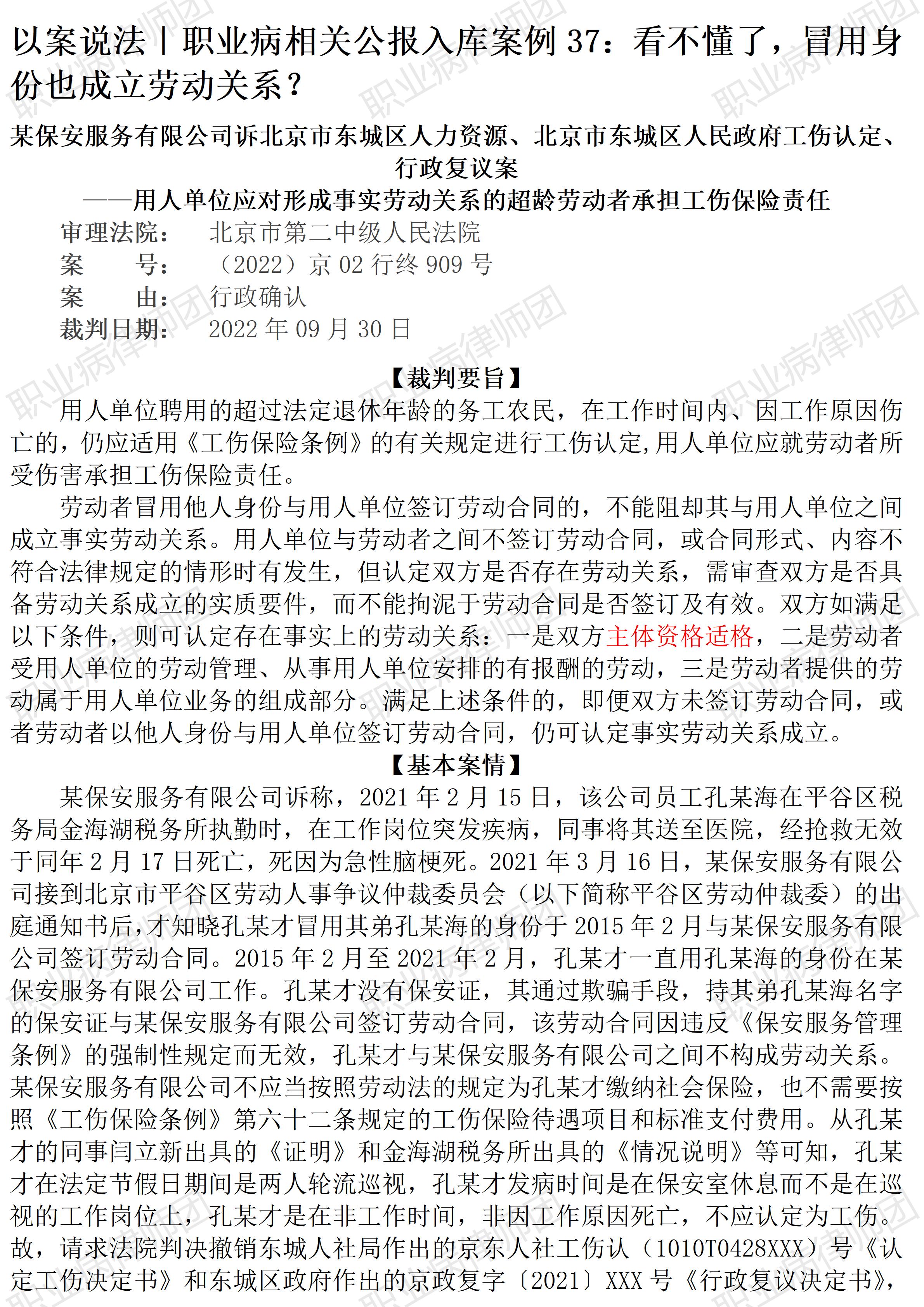 (青海西宁 日月山) 以案说法294|职业病相关公报入库案例37:看不懂了,冒用身份也成立劳动关系? 本案案号:(2022)京02行终909号 入库编号:2024-12-3-007-006 案例编号:5.1.37 OCA37 【基本案情】 【律师说法】 本案是一宗冒用他人身份信息入职后工作时间突发疾病死亡引发的工伤认定行政纠纷。 本案的典型意义在于:虽然冒用他人身份证入职,但在工伤语境下,需要穿透形式意义的身份信息,以实际提供劳动主体来评价相关劳动关系及相关事故伤亡能否认定工伤。 值得注意的是,本案相关劳动关系是经过生效仲裁文书予以确认的,但被仲裁裁决确认的劳动关系并未完全覆盖案涉劳动者的全部在职期间,换言之,当事劳动者发生工伤时已超过退休年龄。 也就是说,本案中当事劳动者最终能够被认定为工伤,接连闯了几道大关: 一是冒用他人身份信息入职,但最终还是被劳动仲裁委确认了本人与用人单位之间存在劳动关系; 二是超龄工作期间发生事故伤害,但仍然被认定为工伤; 三是突发疾病死亡,是否工作时间、工作原因存在争议,但最终以视同工伤情形被认定为工伤。 冒用他人身份信息入职,显然至少是有违诚信的行为,因而总是应当被否定、至少是不应肯定和提倡的。更重要的是,此等行为对用人单位招录用工会产生潜在的风险,比如类似本案的保安工作,对年龄的要求、进而对健康水平的要求显然要高于其他工作。但本案最终却仍然被劳动仲裁委裁决确认了劳动关系,是否有当事劳动者因工伤亡这方面因素的考虑不好说,但在非工伤情形下,此类冒用身份信息入职能否顺利确认劳动关系,恐怕并非易事。 另一方面,本案行政判决虽然维持了工伤认定结论,也顺便指出,因当事劳动者冒用他人身份信息务工导致用人单位无法顺利通过商业责任险分散用工风险,用人单位“可通过其他途径予以解决”。也就是说,借用他人身份信息入职发生工伤的,虽然不影响认定为工伤,但最终的补/赔偿责任可能还需要考量借用行为给用人单位造成的损失,特别是正常用工情形下可通过工伤保险或者商业保险分散用工风险的。 当然,作为一宗入库案例,本案确立的裁判标准并非经不起推敲。在工伤保险倾斜保护立法宗旨下,类似冒用他人身份信息入职的行为,虽然有违民事诚信原则,但当事人之间毕竟有用工事实存在,也毕竟发生了工伤,在指引了另循途径解决之后,一视同仁地认定为工伤,既符合倾斜保护宗旨,也照顾了用人单位的合理需求。 因此,本案昭示的典型意义在于:既警示用人单位严把招聘关,也暗示劳动者不要采取冒用他人身份信息等类似方法就业,发生工伤自然是谁都不想,但如果是其他纠纷呢,比如工资待遇、绩效考核甚至劳动合同变更、终结? 特别是,如果涉及到职业病纠纷,并且相关岗位对劳动者身份信息有一定特殊要求时,会不会给职业病受害劳动者依法维权带来更大麻烦?慎重!(2025/9/17 15:11) 更多原创文章 团队案例|确诊职业病前倒下的叁期尘肺患者,二审终判赔偿家属50余万 《GBZ188-2025 职业健康监护技术规范》新旧对照简析 以案说法293|最高法入库案例36:中暑,是“疾病”还是“意外伤害”? 以案说法271|职业病相关公报入库案例15:最高法裁定:劳动者未配合离岗体检,视为弃权 职业病问答65|用人单位注销后,职业病病人还能被认定工伤吗? 【收官】“职业病法律”公众号全部推文汇总(501-1000) |