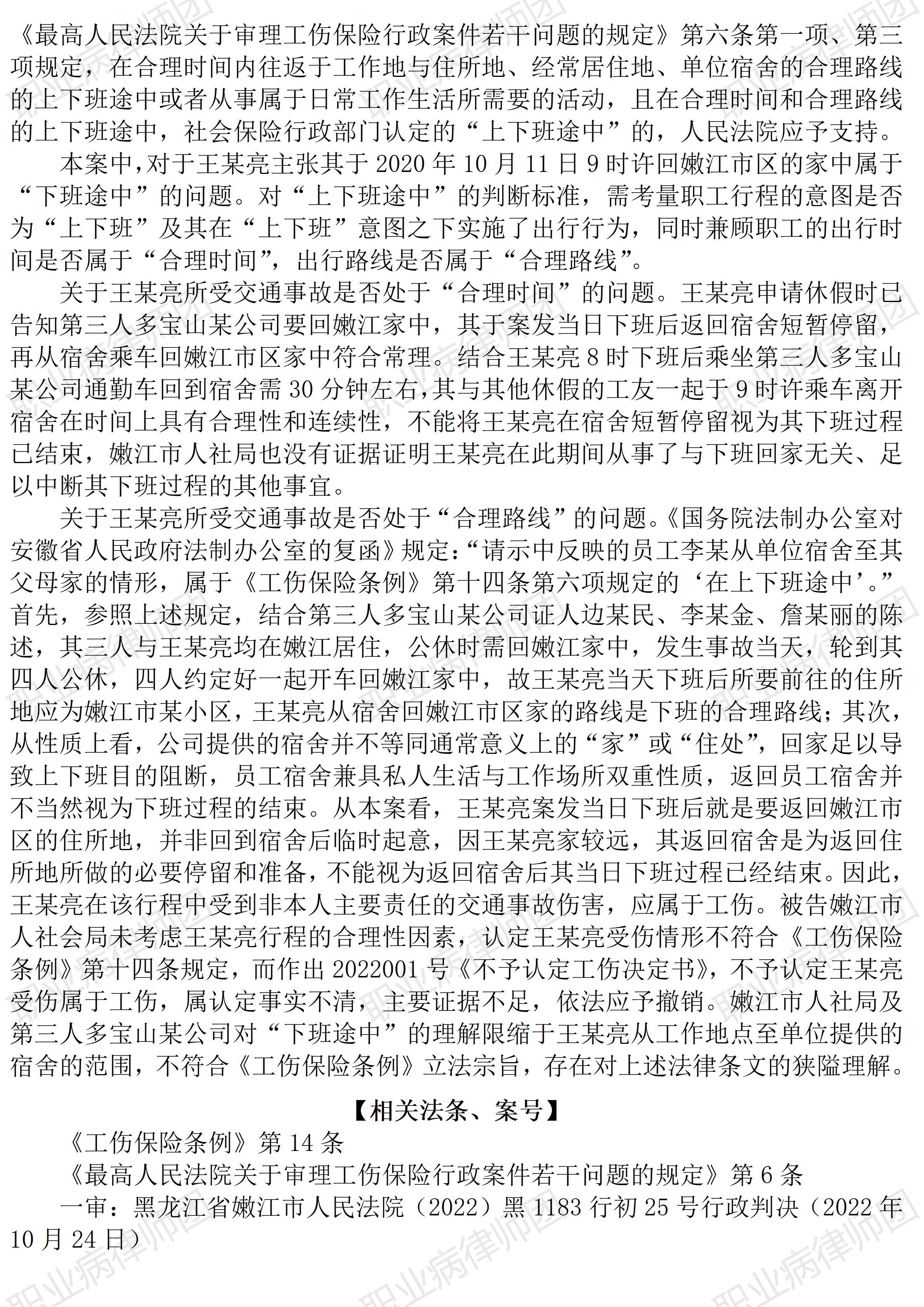 以案说法297|职业病相关公报入库案例40:员工宿舍并非“家”,先经宿舍再回家系合理路线 本案案号:(2022)黑1183行初25号 入库编号:2024-12-3-007-002 案例编号:5.1.40 OCA40 【基本案情】 【律师说法】 本案是一宗涉及下班途中发生交通事故引发的工伤认定行政诉讼。 本案的特殊之处在于,案涉员工下班后先回了员工宿舍再回自己家,在从宿舍到家里的途中发生交通事故,此时,员工是否还属于认定工伤的“下班途中”? 用人单位和人社部门都不认为本案所涉交通事故属工伤。但法院最终支持了员工诉求,并且从员工意图、合理时间、合理路线等多个方面深入论证了应予认定工伤的理由。 值得注意的是,本案法院认为,员工宿舍并非通常意义上的“家”和“住处”,且认为员工宿舍兼具私人生活和工作场所双重性质,这一认定对规范用工管理具有重要意义。 当然,本案中员工宿舍与员工家庭住址相隔并不太远,员工回家途经宿舍相对比较容易和常见,并且,本案中员工事发时下班后经停宿舍的时间比较短,最终让法院认定下班-回家具有连贯性,而在宿舍的短暂停留不具有最终目的性。 个案的特殊性需要注意,但工伤保险的倾斜保护宗旨不会改变。如何既保护劳动者合法权益,又在规范用工的前提下避免类似风险的转化,需要用人单位做好管理,更多些人性化设计。(2025/9/22 11:34) 更多原创文章 团队案例|确诊职业病前倒下的叁期尘肺患者,二审终判赔偿家属50余万 《GBZ188-2025 职业健康监护技术规范》新旧对照简析 以案说法296|最高法入库案例:因履行工作职责事后受到暴力伤害,应予认定工伤 以案说法271|职业病相关公报入库案例15:最高法裁定:劳动者未配合离岗体检,视为弃权 职业病问答65|用人单位注销后,职业病病人还能被认定工伤吗? 【收官】“职业病法律”公众号全部推文汇总(501-1000) |