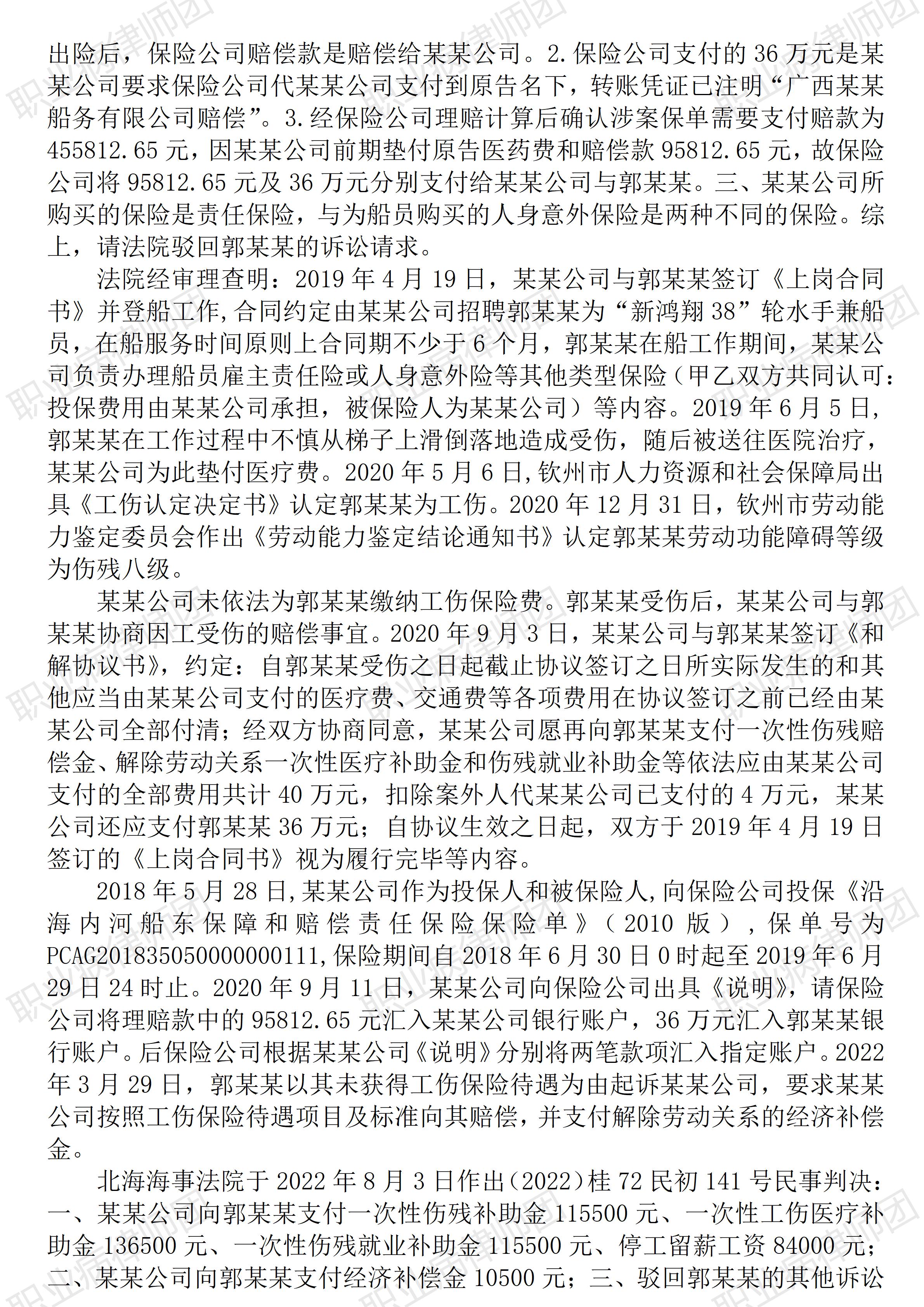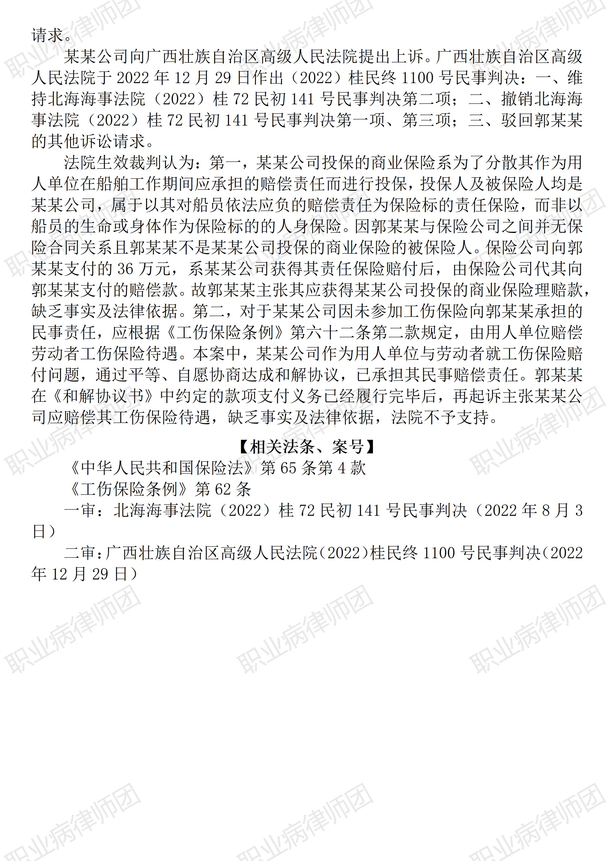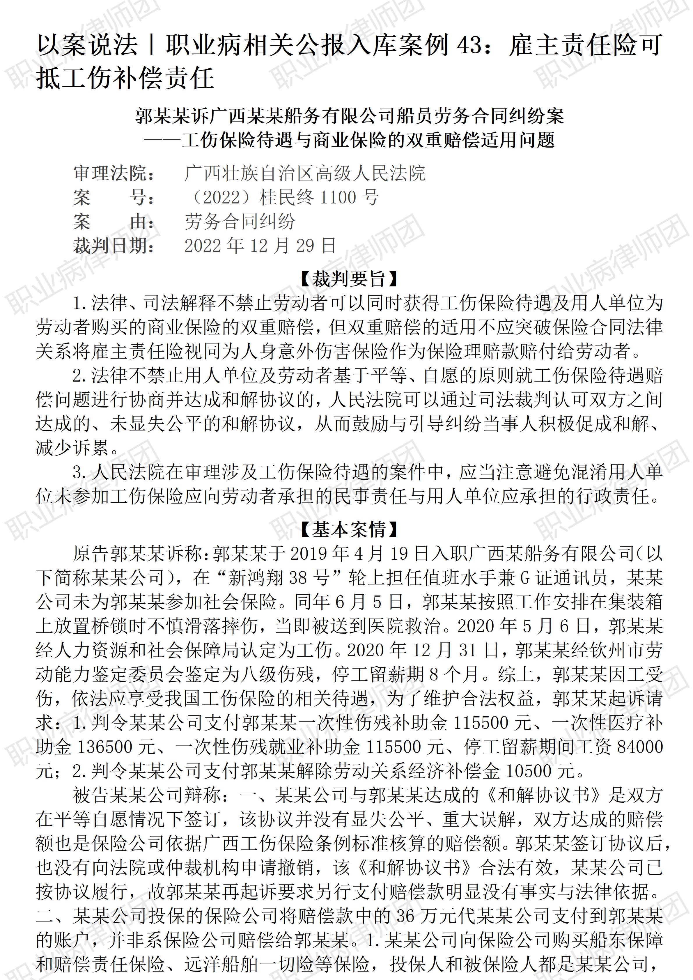 以案说法300|职业病相关公报入库案例43:雇主责任险可抵工伤补偿责任 本案案号:(2022)桂民终1100号 入库编号:2023-10-2-139-001 案例编号:5.1.43 OCA43 【基本案情】 【律师说法】 本案是一宗涉及海员工伤补/赔偿问题的典型案例。 本案有两大典型意义值得关注: 一是用人单位购买的商业保险与工伤保险之间的关系识别、处理。用人单位针对用工风险购买商业保险分为雇主责任险与团体意外险,虽然两者均有分散用工风险、为员工提供一定保障的保险作用,但以本案最终裁判结果特别是成为最高人民法院入库案例来看,用人单位购买针对用工风险的商业保险还需细分:雇主责任险的投保人与被保险人均为用人单位,并非员工,其承保责任可以是员工发生工伤所致相应损害赔偿,系属财产性质的责任保险,因此,雇主责任险是可以冲抵用人单位应当承担的工伤保险补偿责任的;但团体意外险或者类似直接以员工生命健康为保障对象的商业保险,被保险人是员工而并非用人单位,系属人身保险,此时由于人身保险与工伤保险二者并无替代功能,员工获得商业保险赔偿后,仍可依据工伤保险相关法律法规主张工伤待遇,除了医疗费等实际发生费用一般不可重复获取外,有关伤残赔偿项目并不影响兼得。 二是劳资双方针对工伤赔偿达成的和解协议并非绝对无效,当然,得看协议形成的背景、权利义务的公平性等。以本案为例,员工已被依法认定为工伤、评定为八级伤残后,其依法可以享受的工伤保险待遇相对就比较明确,员工对此亦应有相应认知,而双方和解协议所约定的赔偿款项与八级伤残所应享受的工伤保险待遇亦相差不大,此时,劳资双方就员工工伤所应享受的工伤待遇进行的协商、约定,自然就不存在显失公平以及欺诈、胁迫等除外情形。而此时当事员工再主张其已获得的商业保险赔偿不能冲抵工伤保险补偿责任,也无法获得法院支持,除了前述雇主责任险的性质、功能分析,两种保险所能给付的补/赔偿数量相差无几,也是法院考量案涉协议公平性、合法性的重要因素。(2025/9/23 15:53) 更多原创文章 团队案例|确诊职业病前倒下的叁期尘肺患者,二审终判赔偿家属50余万 《GBZ188-2025 职业健康监护技术规范》新旧对照简析 以案说法299|最高法入库案例42:工伤认定重保障,违法转包须担责 以案说法271|职业病相关公报入库案例15:最高法裁定:劳动者未配合离岗体检,视为弃权 职业病问答65|用人单位注销后,职业病病人还能被认定工伤吗? 【收官】“职业病法律”公众号全部推文汇总(501-1000) |