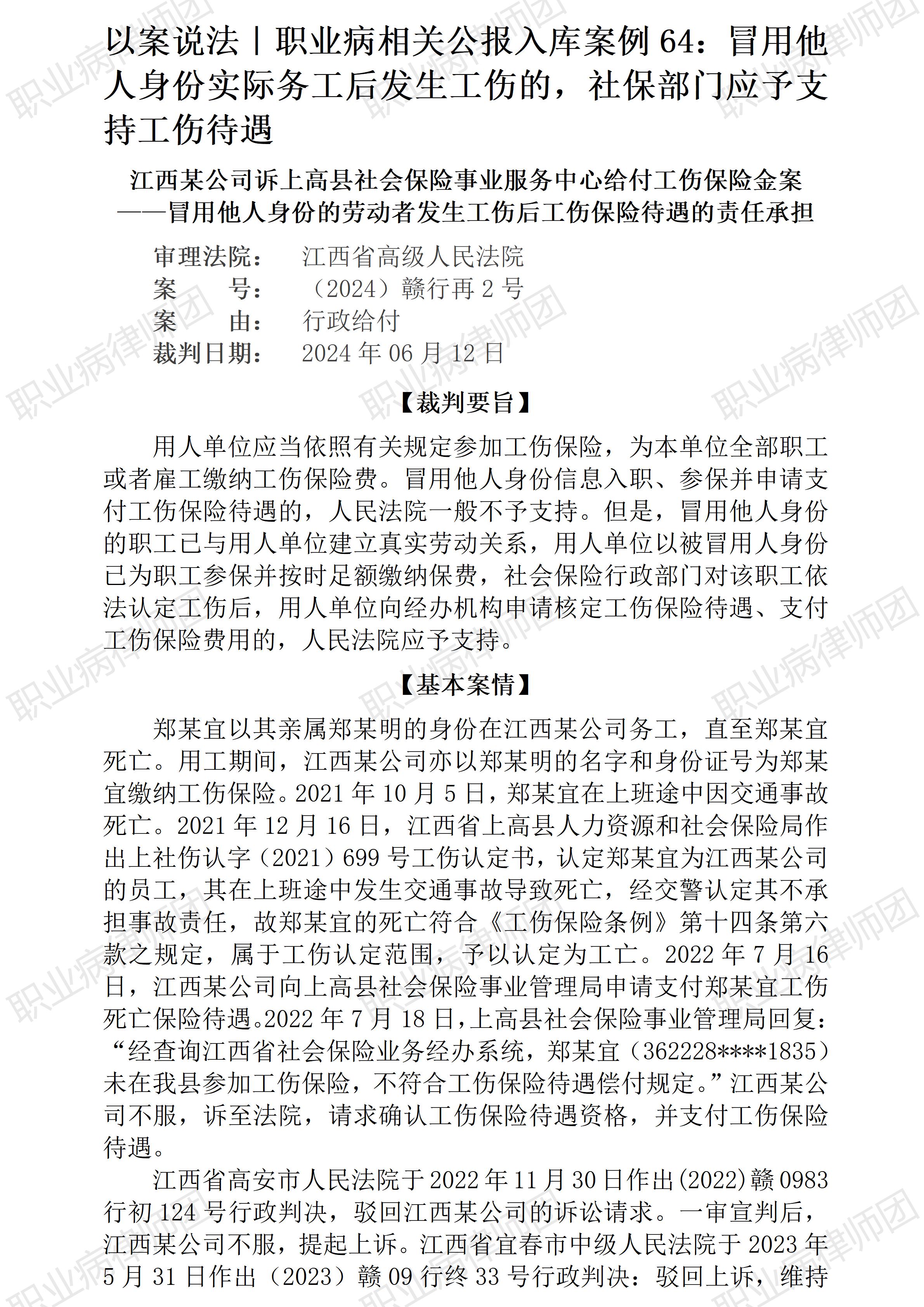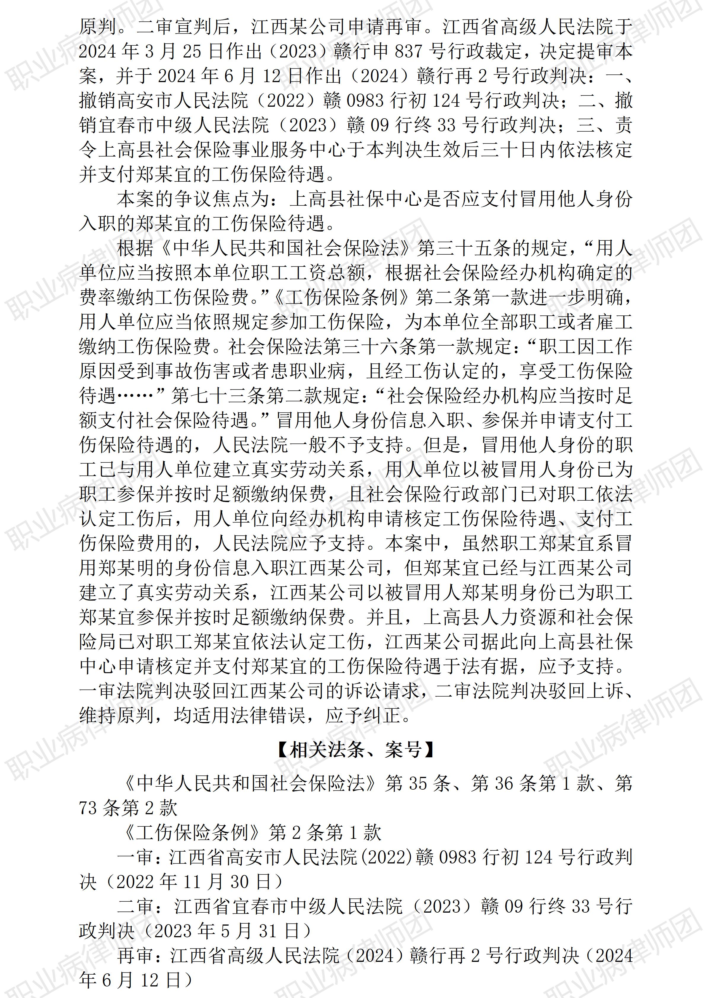 (青海西宁 日月山景区) 以案说法321|职业病相关公报入库案例64:冒用他人身份实际务工后发生工伤的,社保部门应予核发工伤待遇 本案案号:(2024)赣行再2号 入库编号:2025-12-3-008-001 案例编号:5.1.64 OCA64 【基本案情】 【律师说法】 本案又是一宗因冒用他人身份入职后发生事故受损引发的工伤待遇核发纠纷。此前,笔者亦曾推介过类似的入库案例,即5.1.16 OCA16《以案说法273|冒用身份并非拒绝工伤核保当然成立的理由,但还是建议实名务工》。 两宗类似案例均成为最高人民法院的入库案例,已经非常强烈地表明了最高人民法院对此类纠纷的裁判倾向,即冒用他人身份入职并实际务工用工,且确已缴费参保的,社保部门应当依法核发工伤待遇。 不同的是,案例5.1.16 OCA16中,系工亡家属申请核发工伤待遇,虽然案涉人社部门同样不予核发工亡待遇,但一审法院即判决撤销不予核发决定,而本案中,则是用人单位申请核发工伤待遇,但官司一路打到省高院再审才获得改判。 并且,两案生效裁判虽然均支持社保部门应予核发工伤待遇,但对冒用身份务工引发工伤纠纷的评判还是有所区别的。案例5.1.16 OCA16中,生效裁判认为虽然相关法律法规规定应当实名制缴费参保,但并未规定未实名缴费参保的法律后果,因此,“故而不能以未按实名制参保为由否定吴某全应当享有的权利”,并且,用人单位毕竟不是国家机关,对员工身份信息的核实能力有限,“不能苛求”。 而在本案中,一二审法院均完全认同案涉人社部门的意见,即使是作出改判的再审法院,也明确表达了对冒用他人身份务工行为的否定,认为:“冒用他人身份信息入职、参保并申请支付工伤保险待遇的,人民法院一般不予支持。”本案改判支持的考量情形包括:1、冒用他人身份的实际用工人员已与用人单位建立真实劳动关系;2、用人单位以被冒用人身份已为实际用工人员参保并按时足额缴纳保费;3、且社会保险行政部门已对实际用工人员依法认定工伤。生效裁判文书还特意提到,在具备前述事实条件后,“用人单位”向经办机构申请核定工伤保险待遇、支付工伤保险费用的,人民法院应予支持。 因此,虽然最高人民法院已选定两宗类案为入库案例,但笔者仍要提示劳动者:慎勿冒用他人身份务工,否则,能不能认定工伤尚存一定不确定性,而即使能够认定工伤,后续申请核发工伤待遇之时也会面临不确定性。(2025/9/30 11:18) 更多原创文章 管仕武|关于《职业病诊断与鉴定管理办法》与《职业病防治法》冲突的审查建议 以案说法320|最高法入库案例63:午休时返回宿舍途中发生交通事故, 符合“三工”因素应予认定工伤 以案说法271|职业病相关公报入库案例15:最高法裁定:劳动者未配合离岗体检,视为弃权 职业病问答65|用人单位注销后,职业病病人还能被认定工伤吗? 【收官】“职业病法律”公众号全部推文汇总(501-1000) |