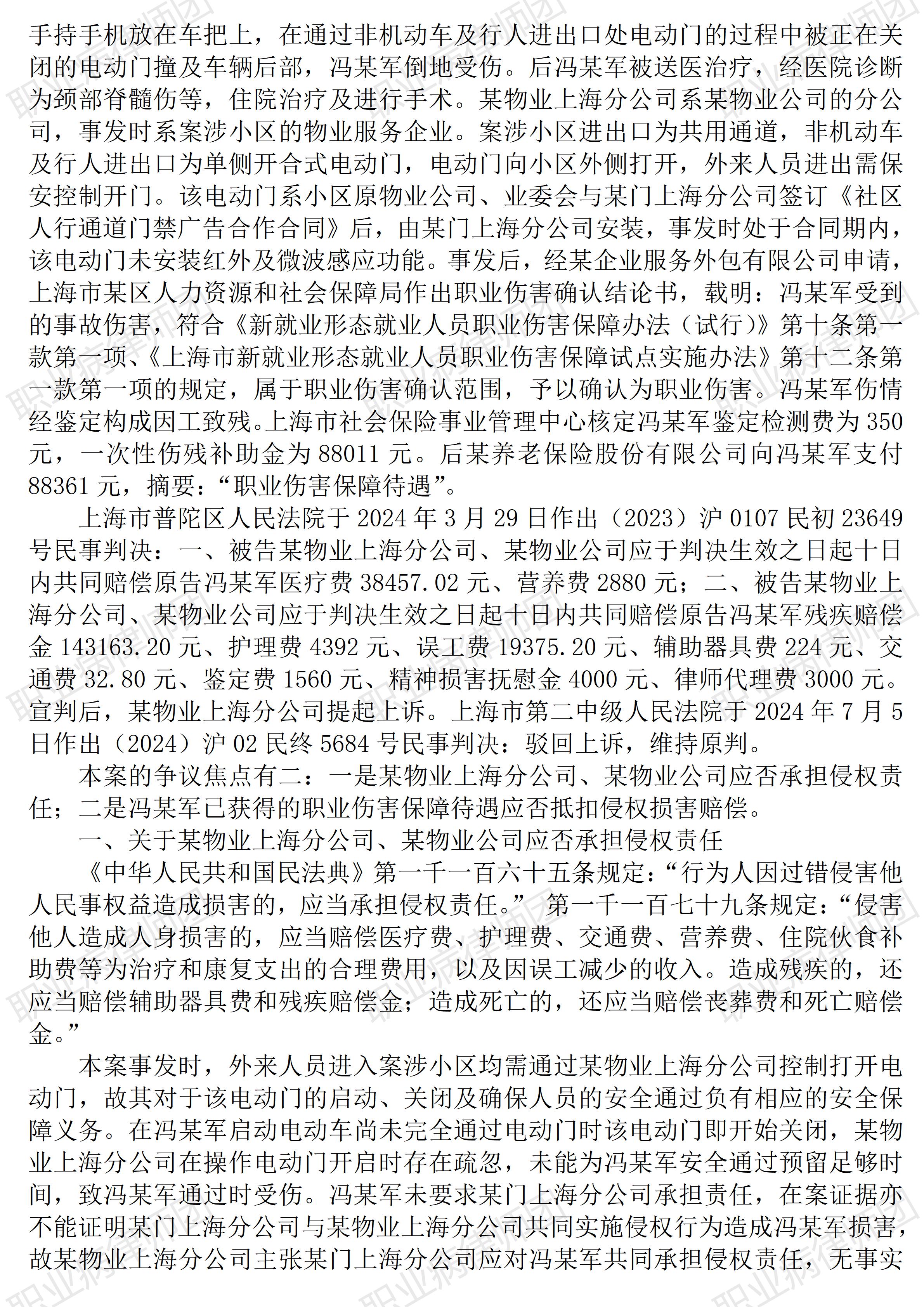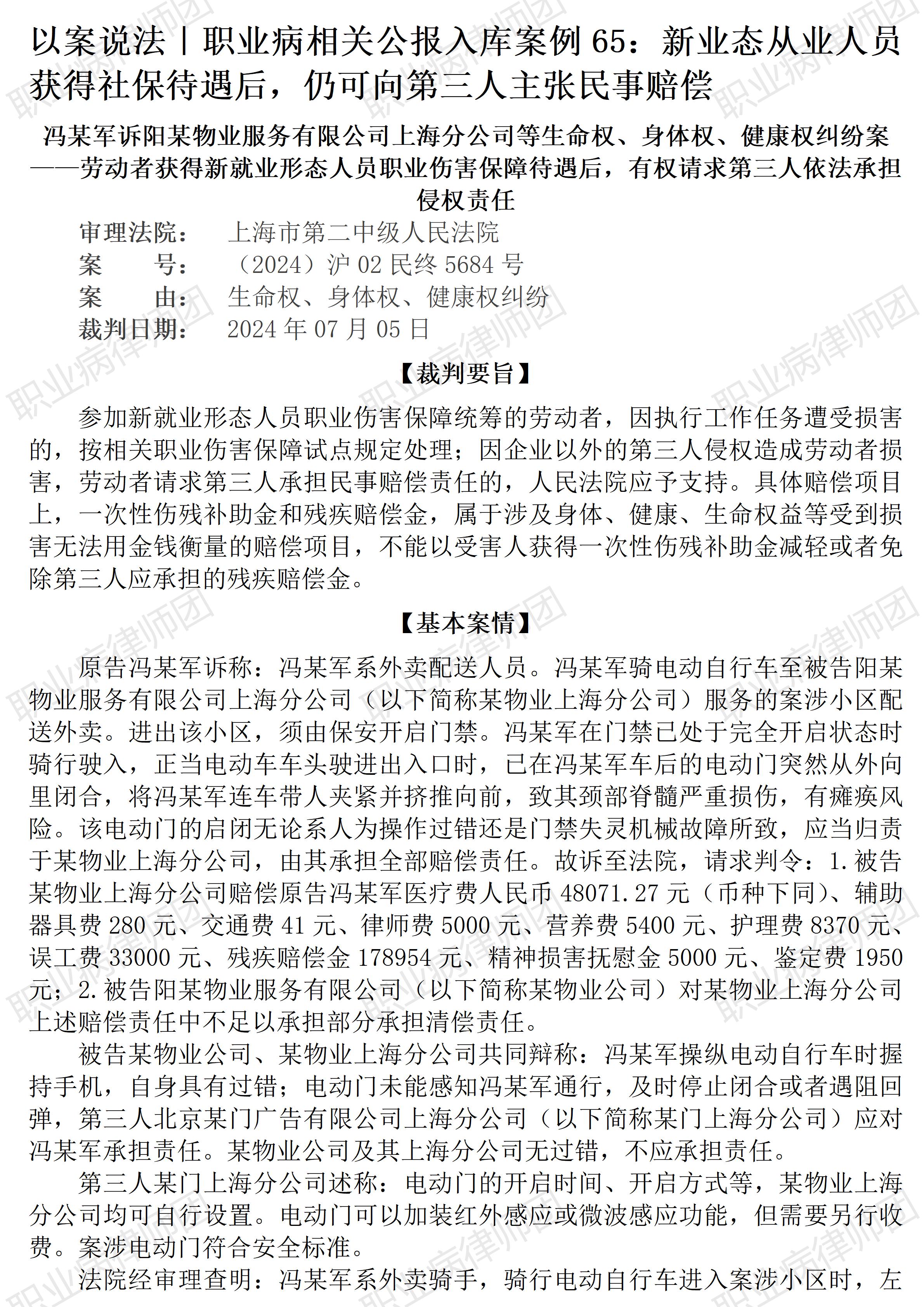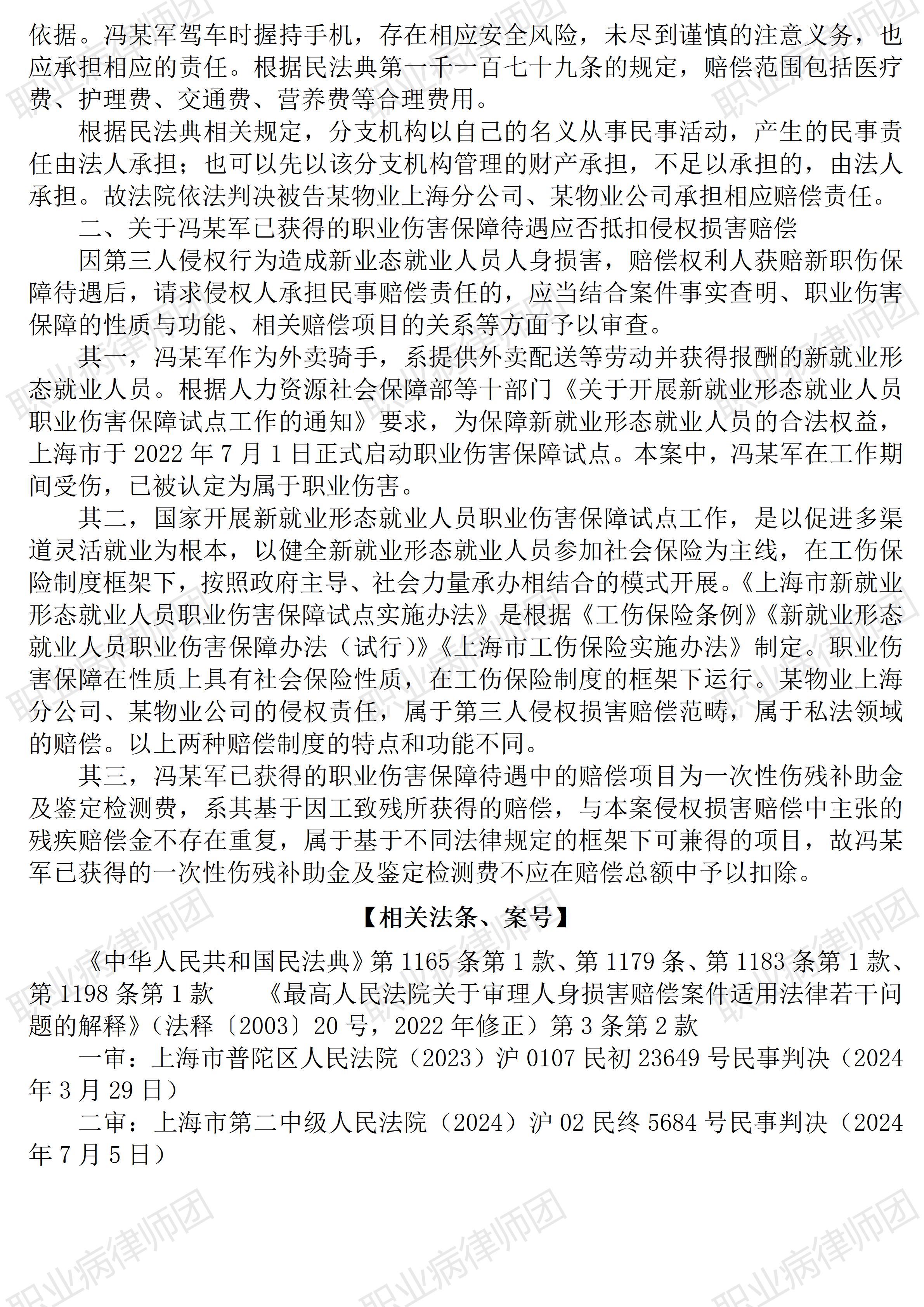 (青海湖景区) 以案说法322|职业病相关公报入库案例65:新业态从业人员获得社保待遇后,仍可向第三人主张民事赔偿 本案案号:(2024)沪02民终5684号 入库编号:2025-07-2-001-002 案例编号:5.1.65 OCA65 【基本案情】 【律师说法】 本案是一宗涉及新业态从业人员在享受相关社会保障待遇后向第三人主张侵权赔偿的典型案例。本案先后被评选为上海市第二中级人民法院2024年度十大典型案例、最高人民法院新就业形态劳动者权益保障典型案例,并成为最高人民法院同类案例中首宗入库案例,足见本案的典型意义。 事实上,本案所涉新业态职业社会保障,也是社会工伤保险制度适应新业态需要的变革形态,目的是为新业态从业人员提供相宜的社会保障,也因此,本案所形成的新业态从业人员民事赔偿请求权,其实也只是传统就业形态中工伤患者向第三主张民事赔偿的相应演变,其底层逻辑完全一致,即社会保险待遇与基于侵权责任的民事赔偿并不冲突,除部分实际发生费用如医疗费等项目外,当事患者可同时享有社会保障待遇与民事赔偿。 而工伤劳动者在享受社会保险待遇后向第三人主张民事赔偿,相关法律依据除《民法典》《社会保险法》《工伤保险条例》之外,更有《最高人民法院关于审理人身损害赔偿案件适用法律若干问题的解释》之规定。 当然,本案及类似案件涉及的均为一般事故所致普通工伤,并且主张民事赔偿的对象系用工主体之外的第三人,这与职业病民事赔偿个案情况并不一致。但能否因此当然排除职业病病人主张民事赔偿,至少本案及类案并不能得出这样的结论。毕竟,《职业病防治法》《安全生产法》有关劳动者从业人员享有民事赔偿请求是作了明确规定的。(2025/9/30 12:00) 更多原创文章 管仕武|关于《职业病诊断与鉴定管理办法》与《职业病防治法》冲突的审查建议 以案说法321|最高法入库案例64:冒用他人身份实际务工后发生工伤的,社保部门应予核发工伤待遇 以案说法271|职业病相关公报入库案例15:最高法裁定:劳动者未配合离岗体检,视为弃权 职业病问答65|用人单位注销后,职业病病人还能被认定工伤吗? 【收官】“职业病法律”公众号全部推文汇总(501-1000) |