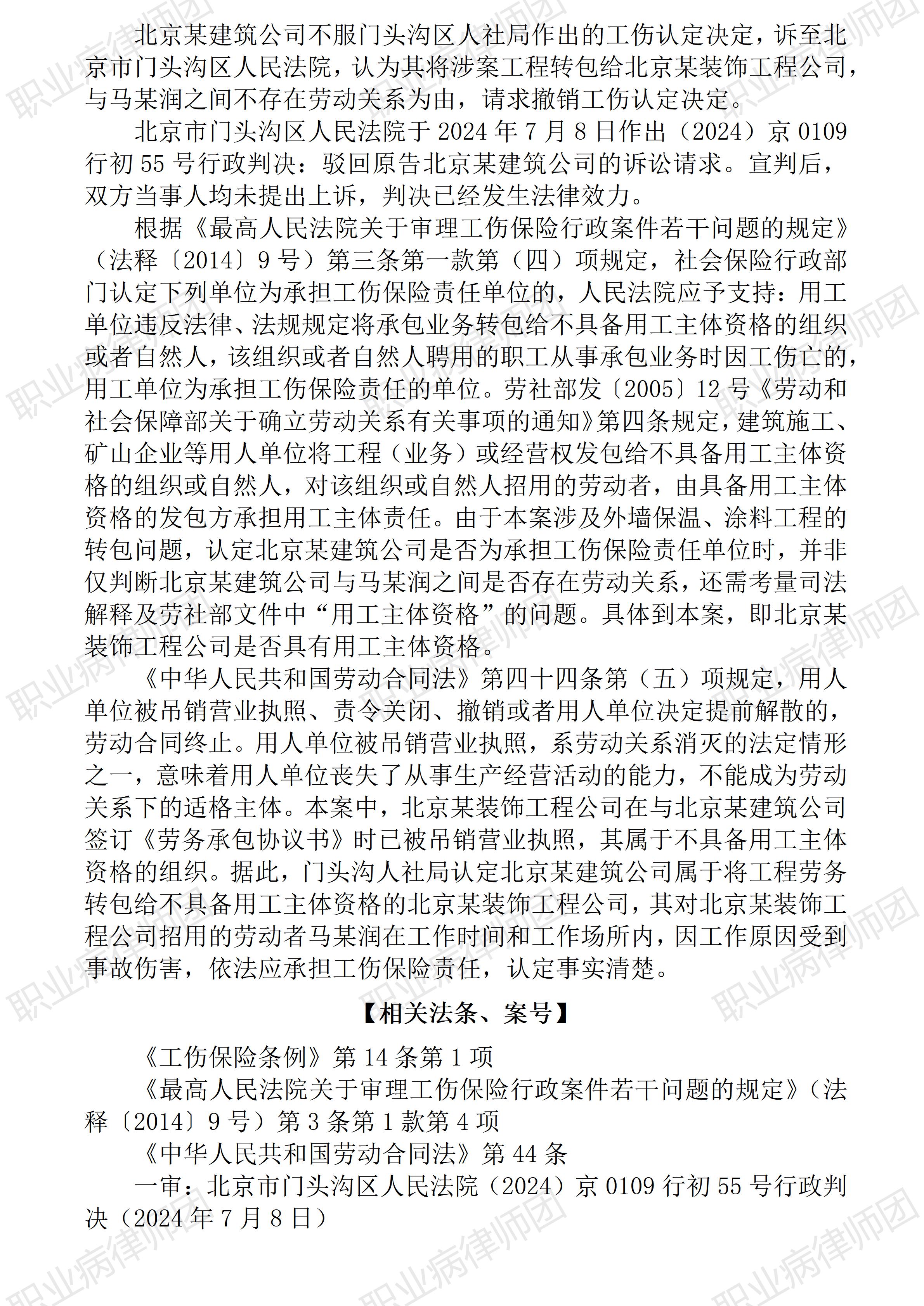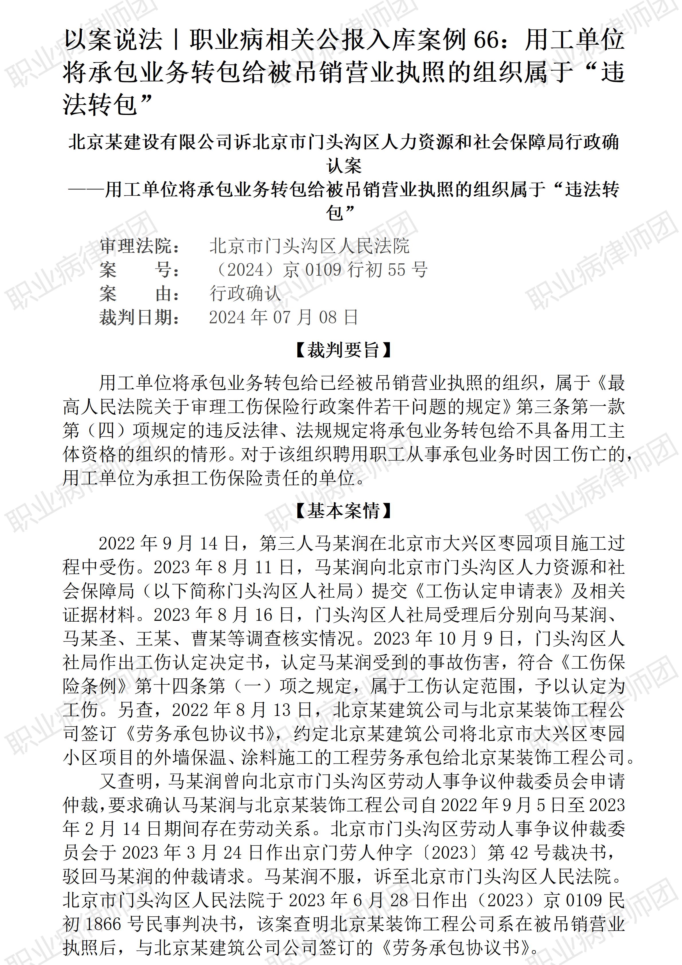 (青海湖) 以案说法323|职业病相关公报入库案例66:用工单位将承包业务转包给被吊销营业执照的组织属于“违法转包” 本案案号:(2024)京0109行初55号 入库编号:2024-12-3-007-011 案例编号:5.1.66 OCA66 【基本案情】 【律师说法】 本案是一宗涉及违法转包引发工伤认定行政纠纷的典型案例。 本案的特殊之处在于:用工单位将承包业务转包给第三方,形式上虽然也有签约,但承包单位事实上已被吊销营业执照,属于主体不适格的“单位”,而既然连主体资格都没有,相应的承接工程业务等也就失去了基础,当属违法。对发包方来说,其对承包方主体资格适格负有审查义务,至少形式上应当核实其注册登记信息,如果过程中有存在超出其审查能力的情形导致被误导,则有可能构成表见代理、或者构成合同诈骗等,此时用工单位或许能提出相应抗辩理由,但在发生工伤之后,发包方的此类主体资格抗辩理由其实也难以成立,最终都免不了被认定为违法转包,而自行承担用工主体责任。(2025/9/30 15:56) 更多原创文章 管仕武|关于《职业病诊断与鉴定管理办法》与《职业病防治法》冲突的审查建议 以案说法322|最高法入库案例65:新业态从业人员获得社保待遇后,仍可向第三人主张民事赔偿 以案说法271|职业病相关公报入库案例15:最高法裁定:劳动者未配合离岗体检,视为弃权 职业病问答65|用人单位注销后,职业病病人还能被认定工伤吗? 【收官】“职业病法律”公众号全部推文汇总(501-1000) |