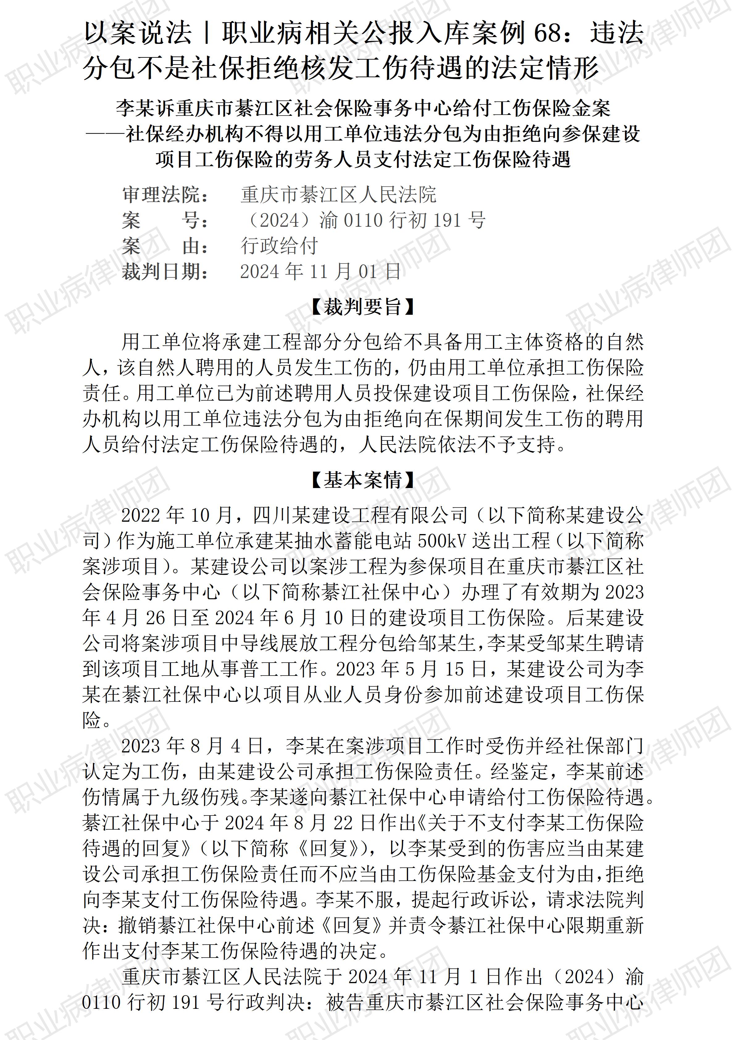 (青海西宁 倒淌河景区) 以案说法325|职业病相关公报入库案例68:违法分包不是社保拒绝核发工伤待遇的法定情形 本案案号:(2024)渝0110行初191号 入库编号:2024-12-3-008-006 案例编号:5.1.68 OCA68 【基本案情】 【律师说法】 本案是一宗涉及违法分包建筑工程引发工伤待遇核发纠纷的典型案例。 有关社保部门核发工伤待遇不得自行设置法外限定条件,本号此前已多有推介此类入库案例,如5.1.41 OCA41《以案说法298|最高法入库案例41:社保部门核发待遇不应法外增设限制性条件》、5.1.52 OCA52《以案说法309|最高法入库案例52:登记备案并非社保部门核发建筑项目参保工人工伤保险待遇的法定条件》、5.1.55 OCA55《以案说法312|最高法入库案例55:报备从来不是核发工伤待遇的法定条件》、5.1.64 OCA64《以案说法321|最高法入库案例64:冒用他人身份实际务工后发生工伤的,社保部门应予核发工伤待遇》等。 比较起来,本案相关人社部门拒绝核发工伤待遇的理由,是用工单位存在违法分包行为,因而认为相关工伤待遇理应由用工单位承担。从维护社保基金安全角度分析,案涉人社部门的抗辩并非完全无理,但相比工伤患者的待遇诉求,倾斜保护宗旨下的基金安全要求尚需让位于工作患者的合法诉求,至于违法分包当事方的责任追究,尚可由人社部门另行处理。 更多原创文章 管仕武|关于《职业病诊断与鉴定管理办法》与《职业病防治法》冲突的审查建议 以案说法324|最高法入库案例67:劳动者超龄但未退休且持续参保,发生工伤事故的应享工伤待遇 以案说法271|职业病相关公报入库案例15:最高法裁定:劳动者未配合离岗体检,视为弃权 职业病问答65|用人单位注销后,职业病病人还能被认定工伤吗? 【收官】“职业病法律”公众号全部推文汇总(501-1000) |