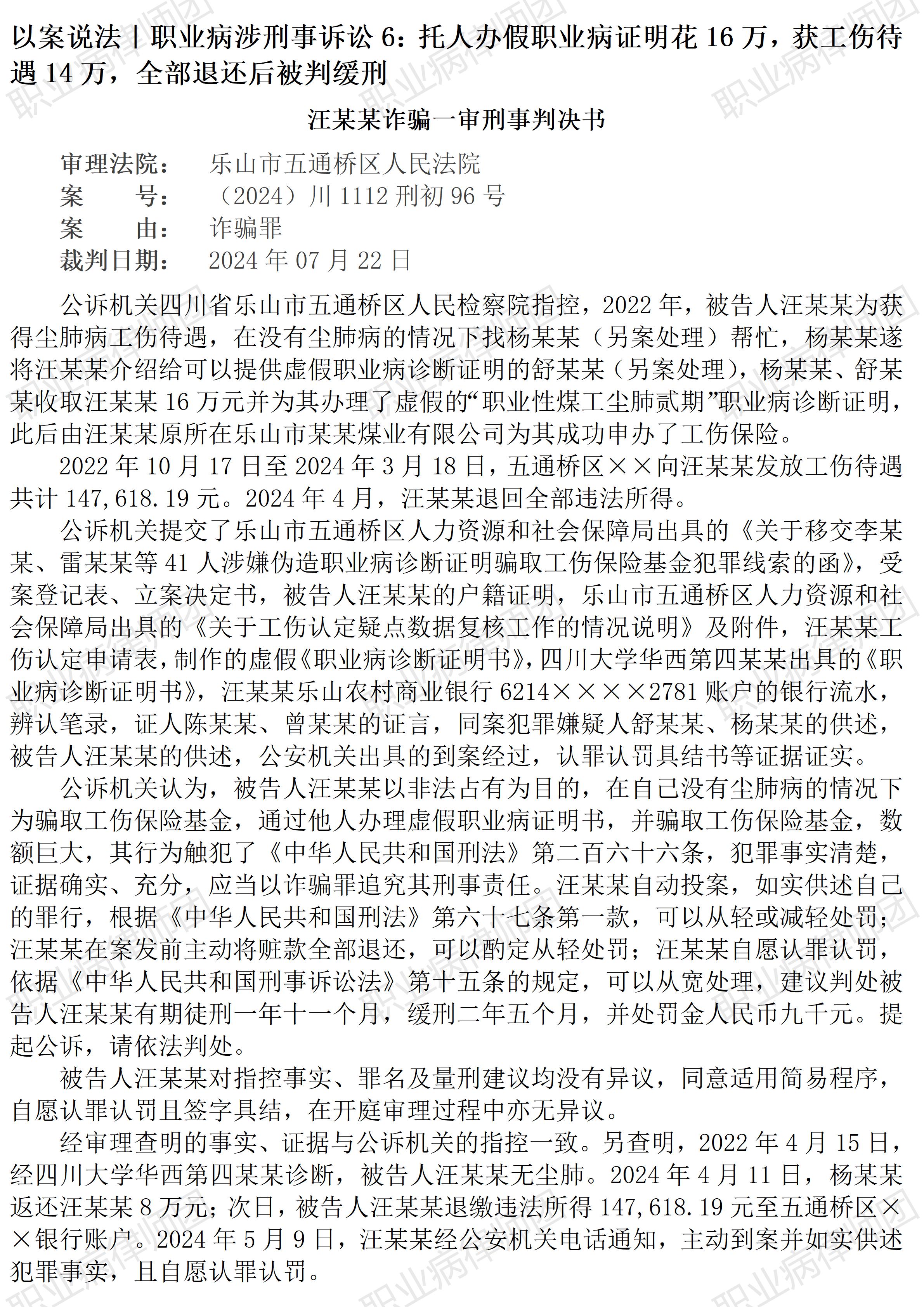 (江西明月山) 以案说法331|职业病涉刑事诉讼6:托人办假职业病证明花16万,获工伤待遇14万,全部退还后被判缓刑 【基本案情】 【律师说法】 本案是一宗涉及诈骗社会工伤保险基金的典型案例。案涉劳动者为了获得工伤保险待遇,不惜重金委托他人办理假职业病证明,结果最终不但工伤待遇分文未获,还因此被定罪判刑。其遭遇实在令人唏嘘。 受公开的裁判文书信息所限,无法确知案涉劳动者具体的健康状况。但从判决所提供的煤矿工作史来看,很可能案涉劳动者曾经有过相当时间的煤尘职业接触史,也不排除肺部出现了一定症状,但依据现有职业病诊断标准尚无法确诊为职业病,为了获得相应工伤待遇,案涉劳动者于是花钱请人办理了虚假的职业病诊断证明书。 本案无法不让人关注的案情细节包括:一是当事劳动者居然能花费16万元请人作假,如此重金对普通劳动者来说可谓巨资;二是相关人员居然能办到“职业性煤工尘肺二期”的假证明;三是当事劳动者实际获得工伤待遇14万余元,甚至不够支付给办假证明的“委托”费用;四是在全部退还所获工伤补偿款后当事劳动者最终被判缓刑。 本案一审判决后,被告人并未上诉,既表明当事人服判息讼,同时也能反映一审判决的结果经得起推敲。法院最终判处缓刑,应该是考虑到本案的诸多具体情形,包括全部退赔等,而案涉职业病工伤应该也是本案值得考量的特殊情形。并且,本案还获评四川省乐观市中级人民法院2024年度十大典型案例,足见本案的代表性与典型意义值得关注。 但本案背后也可能关联到职业病保障的另一方面社会现实:很多劳动者确实遭受了职业病损害,但由于诸多原因无法确诊职业病,这其中,既有职业史、职业接触史的确证存在障碍,也有职业病诊断标准的设计、适用方面的障碍。很多时候,劳动者只能选择放弃,少数患者会坚持依法维权。因此,如果相关职业病保障制度相对更完善,让遭受职业病损害的劳动者便捷获得相应保障,自然也就不存在现实中不时闪现的极端维权。但无论如何,类似本案当事劳动者采取的这种方式显然不合适,就算偶尔、暂时侥幸获益,终究因为根本违法,而难以安稳,正所谓“法网恢恢,疏而不漏”,遭受职业损害争取相应保障,本来是在理也合法的事,但因为违法而丧失保障,甚至被定罪判刑,实在得不偿失。(2025/10/13 15:50) 更多原创文章 以案说法|职业病涉刑事诉讼5:服刑劳改期间患职业病,诉求国家赔偿未获支持 以案说法|职业病相关行政诉讼9:劳鉴委以患者已离职拒绝受理复查鉴定申请,不合法! 以案说法|职业病相关纠纷14:岗位调整有边界,用工自主须合法 【收官】“职业病法律”公众号全部推文汇总(501-1000) 职业病问答65|用人单位注销后,职业病病人还能被认定工伤吗? 管仕武|关于《职业病诊断与鉴定管理办法》与《职业病防治法》冲突的审查建议 |