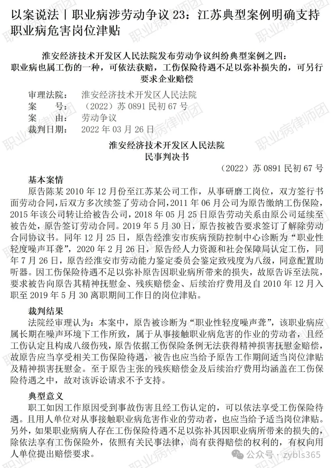以案说法333|职业病涉劳动争议23:江苏典型案例明确支持职业病危害岗位津贴 【基本案情】 【律师说法】 本案是一宗职业病病人诉求职业病危害岗位津贴及民事赔偿的典型案例。 本案的典型意义,不止是在生效判决支持了当事患者有关职业病危害岗位津贴的诉求,而是当事患者本案所提出的诉求涵盖了职业病工伤待遇与民事赔偿,虽然最终仅部分支持了岗位津贴及精神损害抚慰金,但在江苏当地,本案依然值得关心职业病问题的人士关注。 通过公开的网络信息,笔者检索到本案原告完整的诉讼请求为:1、被告支付自2019年5月30至2020年7月26日期间的工资48008.66元(按照每月工资3429.19元计算);2、被告支付2010年12月入职至2019年5月30离职期间工作日的岗位津贴7438.5元(3.2元/天);3、被告支付已产生的医疗费4461.03元和后续应发生的医疗费8万元;4、被告赔偿残疾赔偿金239472.31元和精神抚慰金1.5万元。 首先,本案法院明确支持职业病危害岗位津贴,标准为1.2元/天。有关职业病危害岗位津贴,职业病律师团早在2011年即已成功为职业病病人争取到,且标准为500元/天,对此,笔者所著《以案说法:职业病法律维权实务》(法律出版社2018年10月出版)典型案例12已有完整介绍。受公开的信息所限,尚不清楚本案原告何以按3.2元/天的标准主张职业病危害岗位津贴。但法院最终仅按1.2元/天标准支持,理由是“原告未提供相关计算标准依据,故本院根据原告工作环境及所受伤害程度,酌定岗位津贴按照1.2元/天标准计算”。看来,补贴标准有高低,如何支持,取决于原告方的举证能力。但本案毕竟是法院明确支持了职业病危害岗位津贴,值得肯定。 其次,本案所支持的职业病危害岗位津贴,是与残疾赔偿金等职业病民事赔偿诉求一并主张、一并审理的。而本案的案由则是劳动争议。这大概也是职业病法律维权当下司法现实的特殊怪象所在。你要说按基础法律关系确定案由,又经案由审查具体诉求,那本案诉求显然不是同一法律关系,劳动争议的案由也显然无法涵盖原告全部诉求,但法院又一并审理了,甚至还成为了当地法院推崇的十大典型案例,且同时支持了职业病危害岗位津贴与精神损害抚慰金,前者属于典型的劳动争议诉求,后者则是典型的侵权责任。实在让人不好理解。当然,从职业病病人角度,法院能够一个案件全面审查、处理工伤待遇与民事赔偿诉求,自然最好,也其实更符合节约司法资源、减轻工伤患者诉讼负担的法治要求。 但既然支持了精神损害抚慰金,为何又不支持残疾赔偿金等民事赔偿诉求呢?法院的理由是当事劳资双方签订了一次性解除劳动关系的协议,原告患者领取了一次性伤残补助金、一次性伤残就业补助金与一次性工伤医疗补助金,残疾赔偿金等损失已经获得了工伤补偿,故再诉求残疾赔偿金即无依据。也是让人费解:精神损害抚慰金与残疾赔偿金,相对于工伤一次性补偿,何以厚此薄彼? 但本案要令职业病病人最大的意难平,则是患者诉求的后续实际已发生的及预期合理发生的医疗费完全不予支持,理由也是患者领取了一次性工伤医疗补助金,从而完全终结了工伤保险关系。似乎由此可以推论,如果患者不领取一次性工伤医疗补助金,则后续医疗费用应可向社保基金申请核报。 但如果是这样,劳资双方如何达成一次性终结劳动关系的协议? 所以,有时候,法律规定是一回事,能否落实落地,那完全是另一回事。 因此,只能建议职业病病人,跟用人单位一次性“私了”之前,务必慎重考虑清楚:是否,你真准备从此与原单位、社保基金一刀两断、永别江湖?补偿款拿了,就不要再指望后续。(2025/10/20 17:24) 更多原创文章 管仕武|关于《职业病诊断与鉴定管理办法》与《职业病防治法》冲突的审查建议 以案说法|职业病相关纠纷14:岗位调整有边界,用工自主须合法 职业病问答65|用人单位注销后,职业病病人还能被认定工伤吗? 【收官】“职业病法律”公众号全部推文汇总(501-1000) |