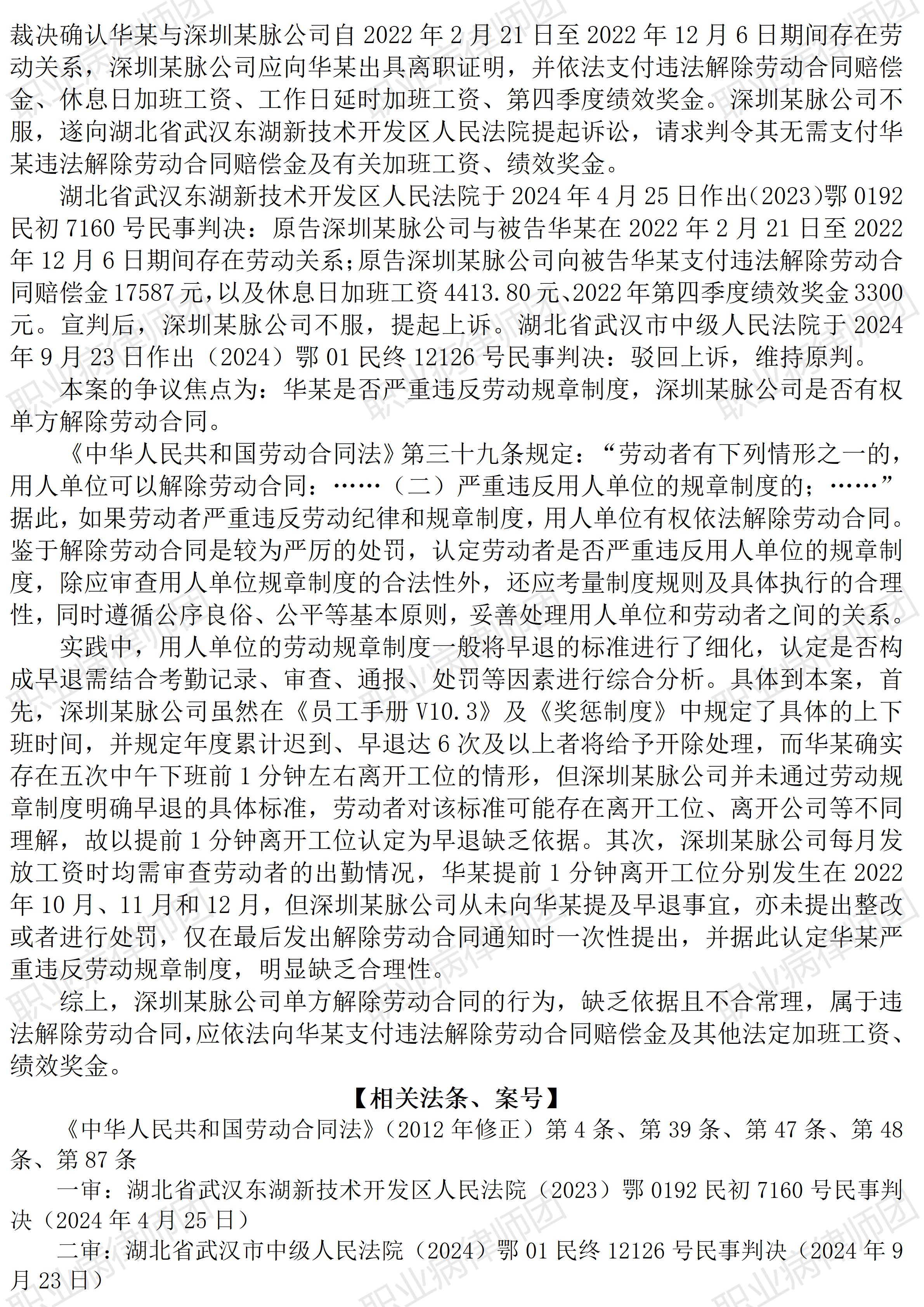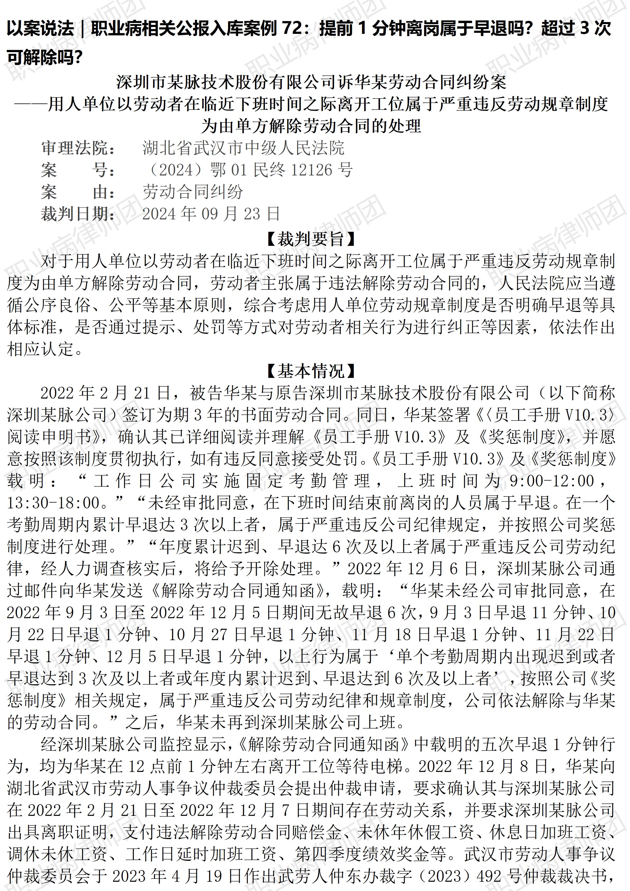 (高铁外的广西) 以案说法339|职业病相关公报入库案例72:提前1分钟离岗属于早退吗?超过6次可解除吗? 【基本案情】 【律师说法】 本案是一宗涉及用人单位相关解除问题规章制度合理性评价的典型案例。 有关用人单位规章制度的法律法规规定包括: 《中华人民共和国劳动合同法》第四条规定:“用人单位应当依法建立和完善劳动规章制度,保障劳动者享有劳动权利、履行劳动义务。用人单位在制定、修改或者决定有关劳动报酬、工作时间、休息休假、劳动安全卫生、保险福利、职工培训、劳动纪律以及劳动定额管理等直接涉及劳动者切身利益的规章制度或者重大事项时,应当经职工代表大会或者全体职工讨论,提出方案和意见,与工会或者职工代表平等协商确定。在规章制度和重大事项决定实施过程中,工会或者职工认为不适当的,有权向用人单位提出,通过协商予以修改完善。用人单位应当将直接涉及劳动者切身利益的规章制度和重大事项决定公示,或者告知劳动者。” 同时依据《劳动合同法》第三十八条第(四)项规定,用人单位的规章制度违反法律、法规的规定,损害劳动者权益的,劳动者可以解除劳动合同。对此解除情形,用人单位需要向劳动者支付相应经济补偿金。 依据《劳动合同法》第三十九条第(二)项规定,劳动者严重违反用人单位的规章制度的,用人单位可以解除劳动合同。 对比上述规定,不难发现,在用人单位规章制度对劳资各方的损益评价中并不完全对等,相关规章制度只要损害劳动者权益,劳动者即可行使有偿解除权,而劳动者需要严重违反相关规章制度,用人单位才可行使无薪解除权。 之所以如此设计,无非是规章制度的制定、执行与解释主动权均在用人单位,因而对用人单位适用规章制度之后的解释与举证责任,天然要重于劳动者。同时,解除权直接关系到劳动关系的存废,而个案中劳动关系对劳资双方的价值也并不等同,对劳资双方行使解除权的限制也因此而自然产生倾斜。 但即便如此,本案有关解除权相关规章制度的评价与认定也值得关注。 提前1分钟离开工作岗位构成早退吗?如果从最严格(机械)的意义上理解,提前一亿分之一秒也构成早退。但法律对用人单位行使解除权的前提是“严重违反”相关规章制度,那么,提前1分钟下班够“严重”吗?显然,对此等“严重”的理解既不能只是简单、机械地按量化的提前时长,但也毕竟不能完全脱离“提前”这一基础事实,否则,没有必要的时间限定,用工管理将无法正常开展。而在本案中,生效判决指出用人单位的解除违法主要表现为: 一是当事劳动者离岗不等于下班,还有可能上洗手间或者做其他活动,总之离开工位不是只有下班这一件事可以解释。虽然,这种理解有些勉强,毕竟用人单位提供了监控等证据,大体能够证明当事劳动者离开工位后去了电梯间,而彼时电梯间又只供下班而并不存在去其他楼层工作的解释空间。但即便如此,法院仍旧认定单纯以离开工位作为早退、尤其是据以解除劳动合同的早退情形并不在理。而其潜台词则是:就算离开了,也不够严重,尚不至于据此解除。 二是案涉用人单位指称当事劳动者多次早退,但所能提供的证据仅限6次,且集中在解除前3个月内,且5次离岗均未当场或者事后予以及时指出并作出相应处理,而是在第6次离岗事实发生后径直辞退。言外之意,就算每次离岗均构成早退,那你单位也总该及时提醒、纠错,而不能坐等6次违纪行为发生后坐实了“严重”违纪的名目。 三是案涉用人单位相关规章制度的规定本身欠缺明确、合理。有关迟到、早退的标准在案涉用人单位规章制度中缺乏进一步明确,在此基础上,以类似本案所涉早退情形为由行使解除权自然也就有欠合理。 自然,生效裁判如此认定显然有利于保护劳动者合法权益,而且相关认定毕竟是基于本案具体事实,包括劳动者离岗仅提前1分钟、相关规章制度中早退标准不明确、用人单位未及时提示处理等等,均直接关系到最终解除行为合理性乃至合法性的考量。所以,即便是入库案例,本案对严重违纪标准的界定标准,在后续类案的处理中也需要慎重,尤其是劳动者维权时,需要对相关法律风险有足够审慎的预期。(2025/11/21 9:33) 【收官】“职业病法律”公众号全部推文汇总(501-1000) 职业病问答65|用人单位注销后,职业病病人还能被认定工伤吗? 管仕武|关于《职业病诊断与鉴定管理办法》与《职业病防治法》冲突的审查建议 |