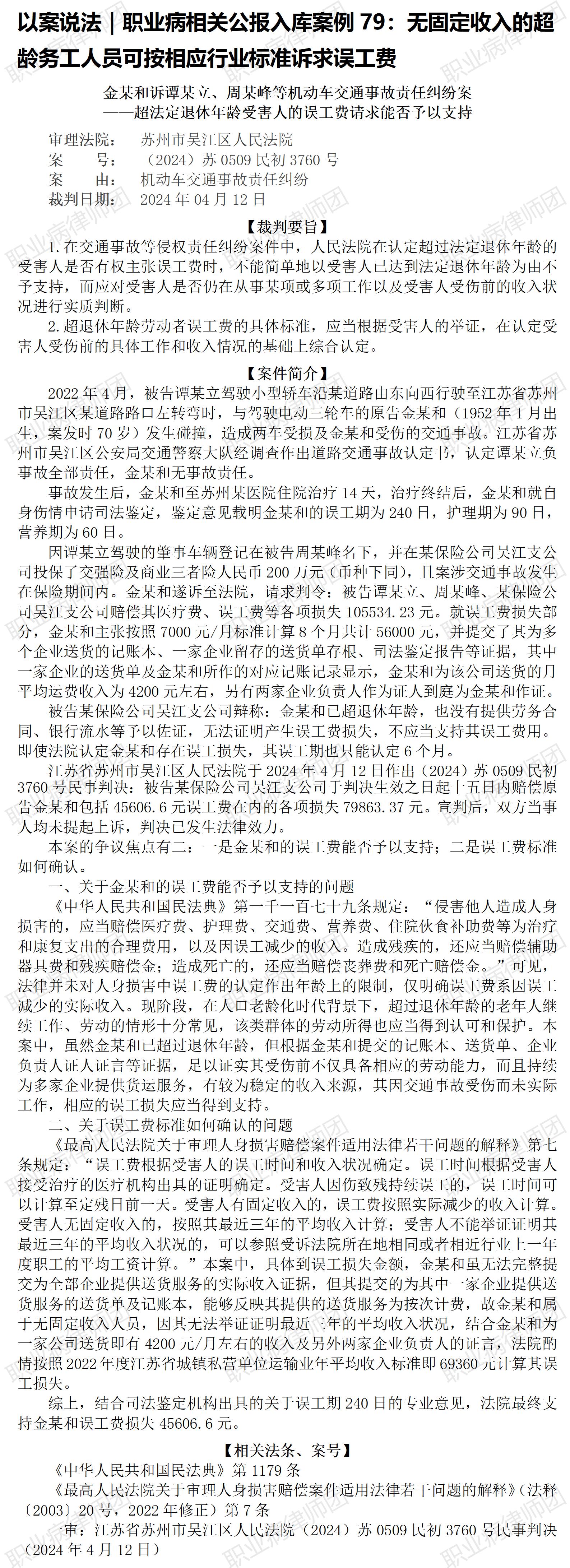 以案说法346|职业病相关公报入库案例79:无固定收入的超龄务工人员可按相应行业标准诉求误工费 本案案号: 入库编号:2025-07-2-374-001 案例编号:5.1.79 OCA79 【案件简介】 【律师说法】 本案又是一宗超龄务工人员诉求误工费引发的纠纷。上一篇以案说法5.1.78 OCA78中《以案说法345|职业病相关公报入库案例78:超龄务工人员可诉求误工费》,笔者已就超龄务工人员诉求误工费应否支持作了相应评析。本篇以案说法,笔者将侧重于超龄务工人员诉求误工费的具体计算标准进行提示。 本案中,患者年逾七旬,平时通过送货获得收入。除了送货单存根、送货记账本及司法鉴定报告等证据外,受公开的裁判文书信息所限,无法得知当事人及本案更多信息。 但本案最终采信了案涉患者的证据及主张,认定其受伤前有实际从事送货工作并获得相应收入,而具体的误工费计算标准则采按当地相关运输业年平均收入标准,从而支持了其大部分误工费诉求。 与上一入库案例5.1.78 OCA78相比,时隔两年,最高人民法院再次将同类案件入库,不仅再次明确超龄务工人员可诉求误工费,在当事患者无法提供固定收入相应证据时,综合现有证据采按相应行业平均改标准支持误工费,可谓更进一步,值得点赞。(2026/1/4 15:59) 【收官】“职业病法律”公众号全部推文汇总(501-1000) 职业病问答65|用人单位注销后,职业病病人还能被认定工伤吗? 管仕武|关于《职业病诊断与鉴定管理办法》与《职业病防治法》冲突的审查建议 |
