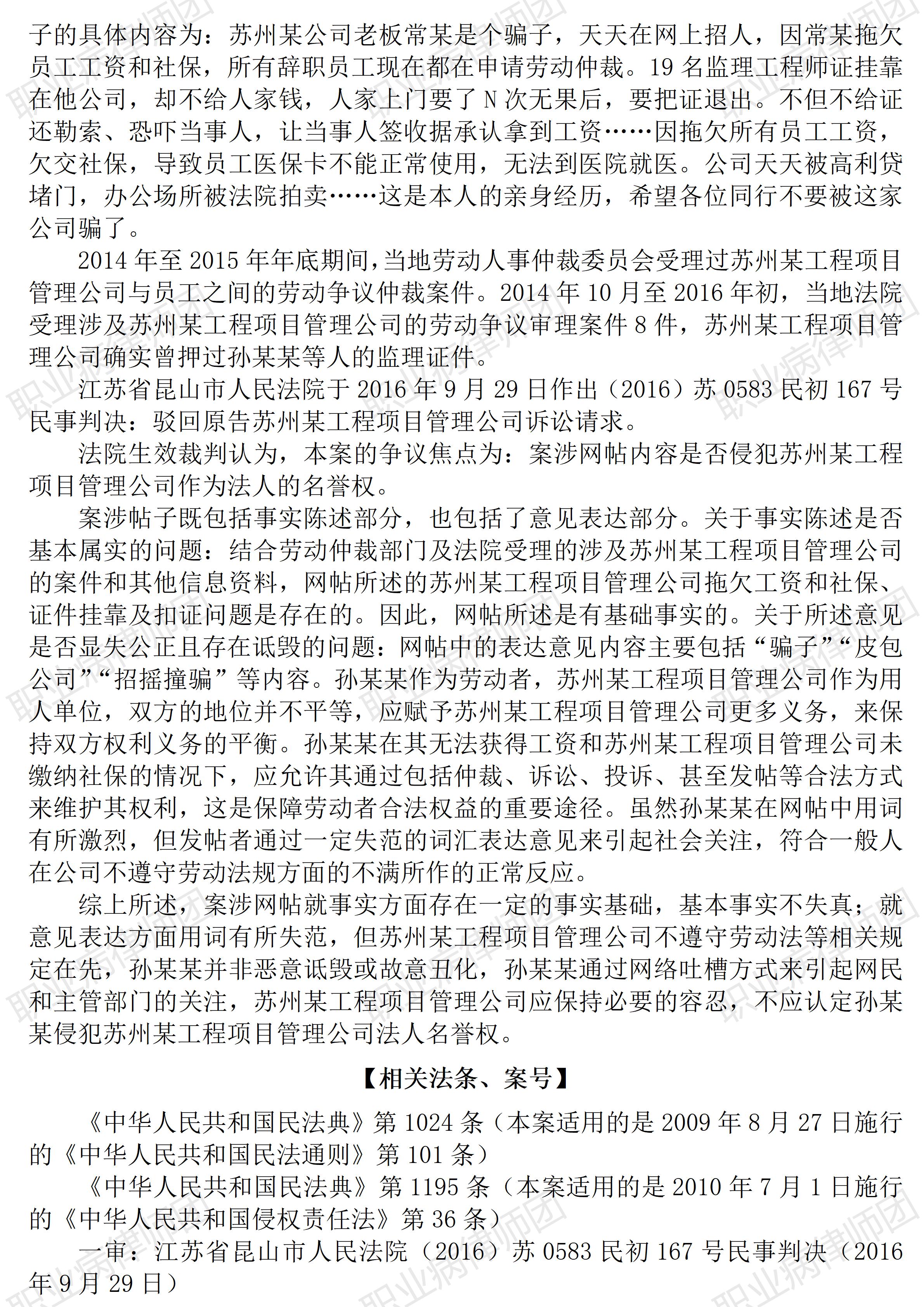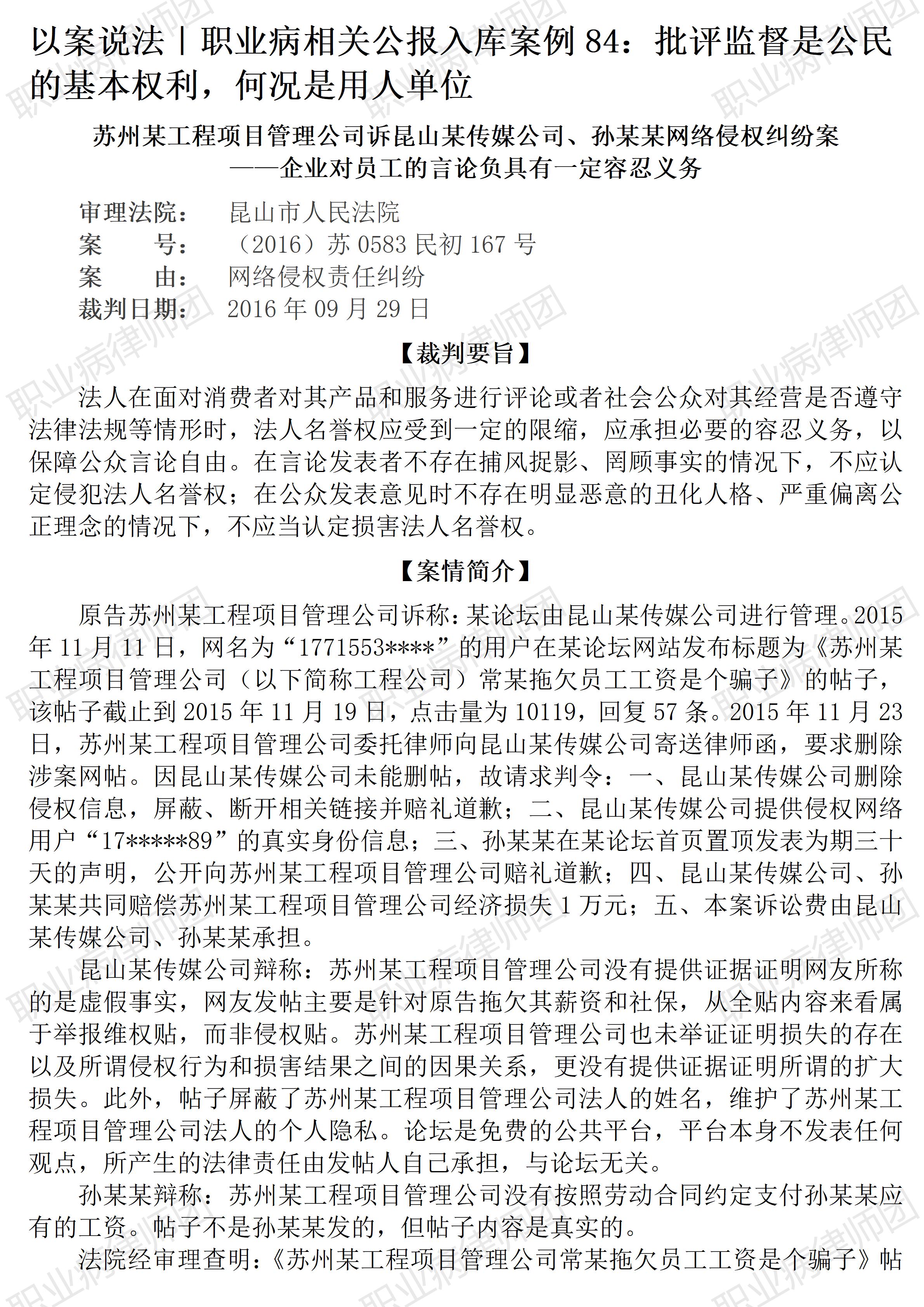 (独山县城) 以案说法351|职业病相关公报入库案例84:言论自由是公民的基本权利,何况是对用人单位 本案案号:(2016)苏0583民初167号 入库编号:2024-07-2-369-001 案例编号:5.1.84 OCA84 【案情简介】 【律师说法】 本案是一宗因劳动者通过互联网络批评用人单位引发的名誉侵权纠纷。 类似的纠纷在实务中比较常见,劳资纠纷发展到一定程度,双方都可能会出现人格评价性的攻击,用人单位可能会通过内部发布通知、公告,劳动者则更多寻求信访,互联网发达的当下,劳动者通过网络发贴对用人单位的某些行为进行批评,因此,本案的出现,自有其现实代表性。但用人单位针对劳动者的网络批评通过诉讼途径维权,并不多见,但相信类似的案件只会越来越多。也正因此,本案成为入库案例,就更具有了参考价值。 职业病相关纠纷中,劳动者因不满于用人单位的诸多行为,比如不配合职业病诊断鉴定、调岗降薪、不配合安排患者治疗直至终结劳动关系等等,过程中同样会出现劳动者求助于网络,尤其是借助抖音等视频渠道,而视频相比文字无论是信息量还是传播效果更其突出,因而也更易引发用人单位的反弹。职业病律师团接触的个案中,不乏患者将用人单位的特定信息上传网络,同时配上一些图片甚至文件,再配上大量的评价性语音,对用人单位的负面影响也不容忽视。也因此,常有患者咨询:用人单位因为患者发了抖音视频而开除,合法吗? 自然,个案具体情况千差万别,仅凭患者单方的陈述,再有经验的律师也没法直接给出定性的解答。 但本案生效裁判则给出了一个基本的标准:“法人在面对消费者对其产品和服务进行评论或者社会公众对其经营是否遵守法律法规等情形时,法人名誉权应受到一定的限缩,应承担必要的容忍义务,以保障公众言论自由。”对普通消费者尚且如此,对本企业劳动者的评论,只要相关评论符合基本事实,又无明显恶意,则用人单位无疑更应容忍。 我国《宪法》第三十五条规定:“中华人民共和国公民有言论、出版、集会、结社、游行、示威的自由。” 《劳动法》第三条规定:“劳动者享有平等就业和选择职业的权利、取得劳动报酬的权利、休息休假的权利、获得劳动安全卫生保护的权利、接受职业技能培训的权利、享受社会保险和福利的权利、提请劳动争议处理的权利以及法律规定的其他劳动权利。” 《职业病防治法》第三十九条规定:“劳动者享有下列职业卫生保护权利:……(五)对违反职业病防治法律、法规以及危及生命健康的行为提出批评、检举和控告;……(七)参与用人单位职业卫生工作的民主管理,对职业病防治工作提出意见和建议。用人单位应当保障劳动者行使前款所列权利。因劳动者依法行使正当权利而降低其工资、福利等待遇或者解除、终止与其订立的劳动合同的,其行为无效。” 所以,公民的言论自由作为一项宪法赋予的基本权利,在面对国家管理、社会生活时都能够依法行使,在面对所在用人单位的管理,尤其是涉及自身劳动报酬、休息休假、职业安全卫生等重要劳动权利时,自然更有依法行使的法律基础。只要所公开批露的事实基本属实,不恶意进行人身攻击,劳动者对用人单位的违法行为予以揭露,并不违法,更不可能构成用人单位合法解除的理由。 当然,仍有必要提示劳动者,对用人单位的网络批评是把双刃剑,需要谨慎使用,实事求是是基本要求,理性客观才能赢得尊重,防范侵权法律风险。(2026/1/8 18:04) 【收官】“职业病法律”公众号全部推文汇总(501-1000) 职业病问答65|用人单位注销后,职业病病人还能被认定工伤吗? 管仕武|关于《职业病诊断与鉴定管理办法》与《职业病防治法》冲突的审查建议 |