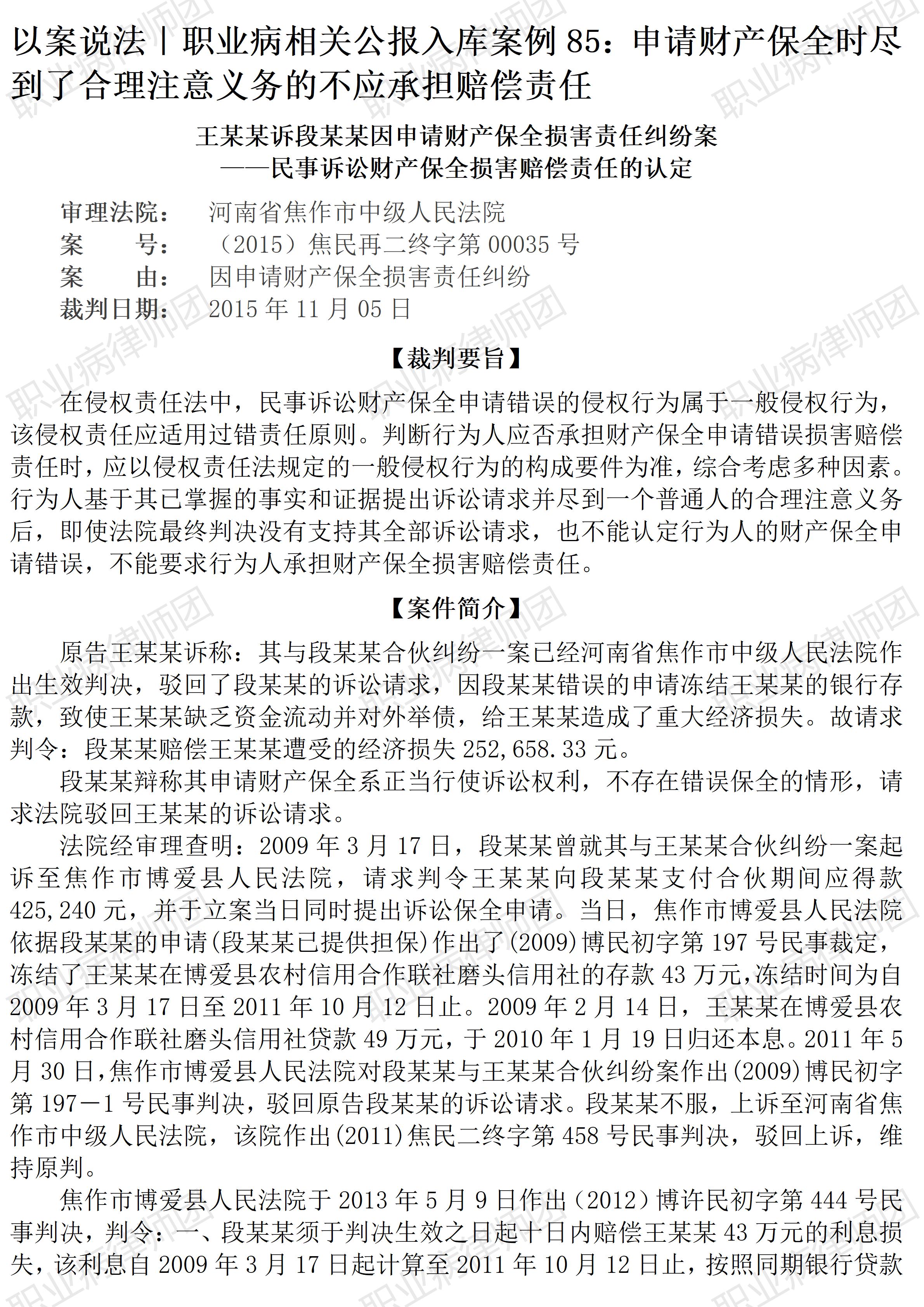 (深圳龙岗 大运中心) 以案说法352|职业病相关公报入库案例85:申请财产保全时尽到了合理注意义务的不应承担赔偿责任 本案案号:(2015)焦民再二终字第00035号 入库编号:2023-16-2-392-001 案例编号:5.1.85 OCA85 【基本案情】 【律师说法】 本案是一宗因财产保全措施引发的侵权责任纠纷。 申请财产保全是民事诉讼中常见的维权举措,劳动争议中劳动者为维护自身合法权益,也会视情形申请财产保全,并且,劳动者在劳动争议中申请财产保全更有特殊制度保障。 依据《民事诉讼法》第一百零四条第一款规定:“利害关系人因情况紧急,不立即申请保全将会使其合法权益受到难以弥补的损害的,可以在提起诉讼或者申请仲裁前向被保全财产所在地、被申请人住所地或者对案件有管辖权的人民法院申请采取保全措施。申请人应当提供担保,不提供担保的,裁定驳回申请。” 而依据《最高人民法院关于审理劳动争议案件适用法律问题的解释(一)》(法释〔2020〕26号)第四十九条规定:“在诉讼过程中,劳动者向人民法院申请采取财产保全措施,人民法院经审查认为申请人经济确有困难,或者有证据证明用人单位存在欠薪逃匿可能的,应当减轻或者免除劳动者提供担保的义务,及时采取保全措施。人民法院作出的财产保全裁定中,应当告知当事人在劳动争议仲裁机构的裁决书或者在人民法院的裁判文书生效后三个月内申请强制执行。逾期不申请的,人民法院应当裁定解除保全措施。” 因此,劳动者可以在启动劳动仲裁程序时申请诉前财产保全,还可根据自身经济状况申请减免担保义务。 但相关法律法规虽然规定如此,并非可以滥用财产保全制度。毕竟,《民事诉讼法》第一百零五条规定:“保全限于请求的范围,或者与本案有关的财物。”第一百零八条规定也明确:“申请有错误的,申请人应当赔偿被申请人因保全所遭受的损失。” 所以,任何人在申请财产保全时,首先要考虑自身诉求是否有相应的法律依据、事实基础,也要初步判断能够获得仲裁、法院支持的可能性,而不能漫无边际地随意申请财产保全,需要充分考量保全错误的风险。 当然,强调职业病病人申请财产保全需要谨慎,并非刻意限缩财产保全的范围与价值。作为一种重要的诉讼制度,同时也是权益受损害方重要的维权措施,职业病病人对财产保全措施还是需要根据案件需要来决定启用与否,以充分利用这一诉讼制度来维护自身合法权益。如果劳动者自身权益确实遭受损害,而用人单位又存在着生产经营不稳定迹象,后续胜诉后用人单位可能存在履行障碍的,还是应当及时申请财产保全。 毕竟,诚如本案生效裁判所示,认定财产保全错误的赔偿责任,需要综合考虑多种因素,尤其是申请人是否基于相应的事实和证据并尽到了合理注意义务,而并非单纯依据申请人的诉求最终是否获得法院生效裁判支持。(2026/1/9 11:05) 【收官】“职业病法律”公众号全部推文汇总(501-1000) 职业病问答65|用人单位注销后,职业病病人还能被认定工伤吗? 管仕武|关于《职业病诊断与鉴定管理办法》与《职业病防治法》冲突的审查建议 |