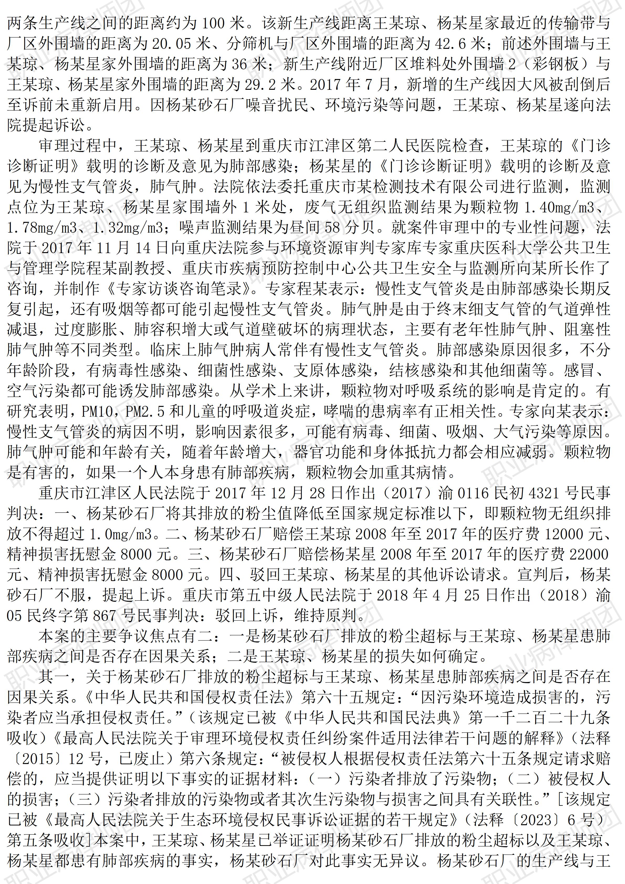 以案说法353|职业病相关公报入库案例86:从一宗环境污染致病案件观照职业病防治 本案案号:(2018)渝05民终867号 入库编号:2024-11-2-377-011 案例编号:5.1.86 OCA86 【案件简介】 【律师说法】 本案是一宗因环境污染引发的损害赔偿典型案件。 由于本案存在的特殊情形,污染者离受害者物理距离极近、污染时间很长、污染因子系生产性粉尘及噪声、受害者出现呼吸系统相应症状等,使得本案具有了与职业病特别是职业性尘肺极为相似的背景,分析本案生效裁判文书,会很自然地让人联想到职业病防治与保障问题。这也是笔者推介、评析本案的重要原因。 当然,本案患者并未被确诊为职业性尘肺病,甚至连非职业性的尘肺病也未见信息批露,因此,本文无法就病情相关直接评析。 但也正因此,本文对本案的评析有了更具价值的探讨。 尘肺病目前是我国职业病中占据绝对主要数量的职业病种类,由于尘肺病的特殊性,其需要长期接触相当数量的致病粉尘,因此,除了职业性环境,也就是在特定用人单位的生产经营环境,非职业性的生活环境、自然环境很难有导致尘肺病的条件:时间要足够长,含量要足够多,颗粒要足够小,这几样条件在非职业性环境中很难同时具备。但本案的出现,却令人无法忽视,极端特殊情形下,非职业性接触粉尘,也能致病。 因此,本案带来的思考,其中难以被非职业病相关人士所关注的问题是:类似本案所涉生活环境,能否导致尘肺病?如何确诊尘肺病? 由于公开的裁判文书信息所限,笔者无法得知本案患者是否患有尘肺病。笔者甚至斗胆猜测,本案缺失尘肺病相关信息的原因,不外有二: 一是患者确实没有尘肺病。但综合来看,此种情形大概率并不成立,毕竟近距离持续数年接触超标致病粉尘,又出现了肺部病变,而且并非孤例; 二是患者没有确诊尘肺病。但未能确诊的原因,又可分为三种: 患者没有去寻求尘肺病的确诊,或者 相关医疗机构并未进行尘肺病的检查与诊断,或者 相关医疗机构虽然发现了尘肺症状,但出于种种顾虑,未能给出尘肺结论,包括打问号的、考虑尘肺可能的待定判断。 进一步的问题是,如果本案患者与案涉砂石建立了劳动或者劳务关系,又当如何判定、处理?能确诊职业性尘肺病吗?——此问当然仅能假设。但假设并非毫无意义,毕竟,现实中居民就近务工的情形比较常见。 本案涉及的危害因子是粉尘,现实中还有众多的同样存在于职业性与非职业性环境中的危害因子,比如噪声、有毒有害物质(包括气体、烟尘、化学品等)、放射性危害等等。 更重要的是,污染者与受害者之间,因为特定的劳动或者劳务关系,进而导致同样一种疾病出现两种完全不同的界定和处理制度,我们可以理解各自制度背后的政策乃至政治考虑,但能否同样关注在制度人为的区分下,同样的污染致害,和同样的污染受害,对加害者的归责与对受害者的保护能否建立某种更为合理的制度勾连,避免出现不合理的权利失序?比如对因果关系的认定,可以考虑无论是职业性还是非职业性致害,均可明确适用过错推定、甚至无过错责任归责原则?比如相关举证责任,同样明确要求加害者承担主要举证责任,否则即承担举证不能的不利后果? 值得深思。(2026/1/9 12:22) 【收官】“职业病法律”公众号全部推文汇总(501-1000) 职业病问答65|用人单位注销后,职业病病人还能被认定工伤吗? 管仕武|关于《职业病诊断与鉴定管理办法》与《职业病防治法》冲突的审查建议 |