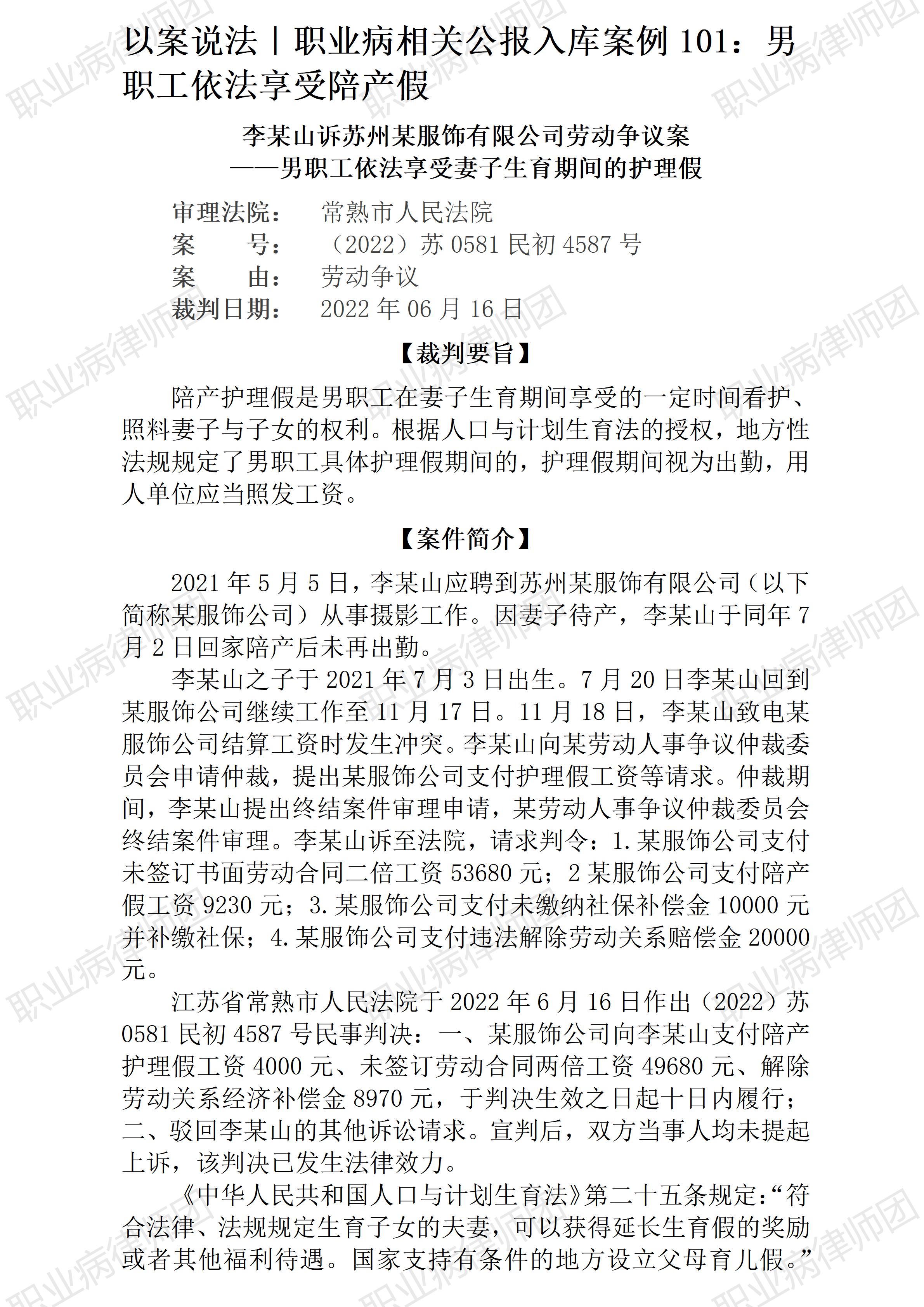 以案说法368|职业病相关公报入库案例101:男职工也能享受生育假 本案案号:(2022)苏0581民初4587号 入库编号:2024-07-2-490-007 案例编号:5.1.101 OCA101 【案件简介】 【律师说法】 本案是一宗涉及男职工诉求陪产护理假的典型案例。本案案情并不复杂,但涉及的男性护理假却具有普遍性,而被遴选为入库案例,本案对类似争议的处理将具有重要参考价值。事实上,能成为入库案例的,未必需要案情特别复杂,选择考量的因素更看重相关争议的普遍性及争议解决的代表性与可参考性。 为人夫为人父,男职工同样负有生育使命。我国法律层面对男性的此项需求也早有明确规定,如《人口与计划生育法》(2021修正): 第二十五条 符合法律、法规规定生育子女的夫妻,可以获得延长生育假的奖励或者其他福利待遇。国家支持有条件的地方设立父母育儿假。 此处的生育假及相关待遇同时指向夫妻、父母。当然,受各地社会经济发展水平制约,法律将具体的假期及待遇标准授权给地方。 《江苏省人口与计划生育条例》(2021修正)则规定: 第二十四条依法办理结婚登记的夫妻,在享受国家规定婚假的基础上,延长婚假十天。 符合本条例规定生育子女的夫妻,女方在享受国家规定产假的基础上,延长产假不少于三十天,男方享受护理假不少于十五天。推动实行父母育儿假制度。产假、护理假和育儿假的具体实施办法,由省人民政府制定。 前两款规定的假期视为出勤,在规定假期内照发工资,不影响福利待遇,国家法定休假日不计入前两款规定的假期。 用人单位根据具体情况,可以给予其他优惠待遇。 因此,法律法规明确规定赋予男职工的生育假,用人单位应当保障实现,履行其法定义务,包括安排相应的假期并及时足额支付工资待遇。(2026/1/15 14:59) 【收官】“职业病法律”公众号全部推文汇总(501-1000) 职业病问答65|用人单位注销后,职业病病人还能被认定工伤吗? 管仕武|关于《职业病诊断与鉴定管理办法》与《职业病防治法》冲突的审查建议 |