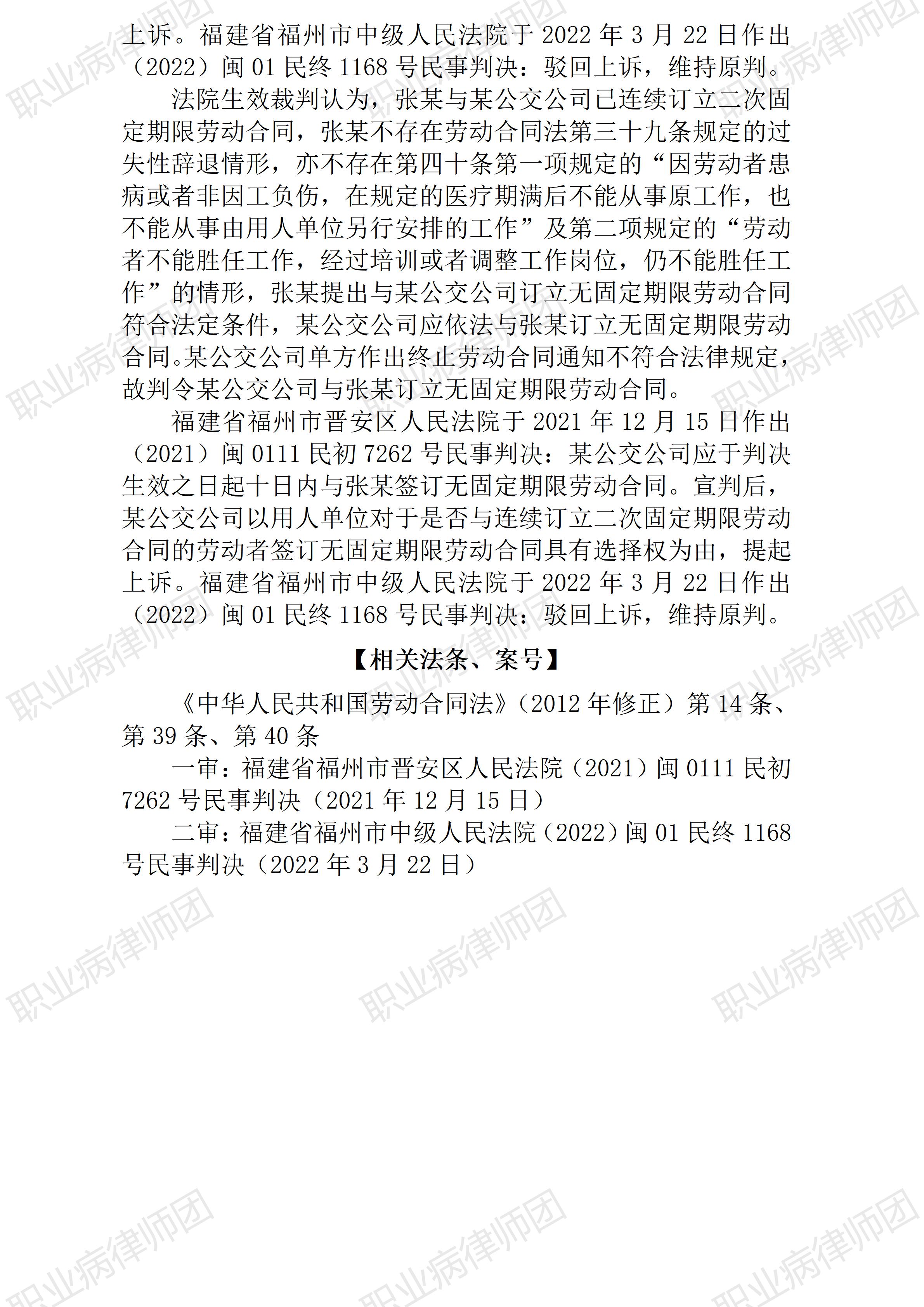 以案说法369|职业病相关公报入库案例102:符合签订无固定期限劳动合同条件的,用人单位无权拒绝劳动者的续约要求 本案案号:(2022)闽01民终1168号 入库编号:2024-07-2-186-003 案例编号:5.1.102 OCA102 【案件简介】 【律师说法】 本案是一宗涉及签订无固定期限劳动合同的典型纠纷。 本案也同样是一宗案情并不复杂但却非常有代表性的案件。作为入库案例,本案生效裁判明确给出结论:对符合签订无固定期限劳动合同条件的,只要劳动者提出或者同意签订无固定期限劳动合同,用人单位均应签订无固定期限劳动合同。换言之,对符合法定条件者,是否签订无固定期限劳动合同,劳动者具有单方选择权。 需要强调的是,这一裁判标准对职业病受害劳动者维护自身合法权益意义重大!实务中,常见劳动者遭受职业病损害,而现行不合理地统一的工伤保险制度下,用人单位往往利用法律赋予的用工自主权,对七级以下伤残等级的职业病患者,在劳动合同到期后不再续约,即使劳动者明确要求续签劳动合同也无济于事。而当劳动者遭受职业病损害又因故未能确诊为职业病之时,这种续签无固定期限劳动合同的权益对劳动者来说就尤为重要。因为,劳动者已经出现健康受损,但在现单位又无法确诊为职业病,再就业又将面临职业禁忌的禁锢,此时,能够维系现有劳动关系,对于这些劳动者自然格外珍贵。然而,现实中用人单位反倒尤其缺乏与此类劳动者续约的意愿。比如听力受损,手臂振动病受害者,特定毒害物质接触反应者,等等。 有关无固定期限劳动合同的签订问题,与未签订书面劳动合同的双倍工资差额问题,是当年《劳动合同法》出台之后争议非常突出的两大争议问题。从《劳动合同法》相关条款的文义解释来看,可以说这两个问题都规定的再清楚不过,但实务中却反复无常,莫衷一是。 《劳动合同法》(2012修正)第十四条规定: 第十四条无固定期限劳动合同,是指用人单位与劳动者约定无确定终止时间的劳动合同。 用人单位与劳动者协商一致,可以订立无固定期限劳动合同。有下列情形之一,劳动者提出或者同意续订、订立劳动合同的,除劳动者提出订立固定期限劳动合同外,应当订立无固定期限劳动合同: (一)劳动者在该用人单位连续工作满十年的; (二)用人单位初次实行劳动合同制度或者国有企业改制重新订立劳动合同时,劳动者在该用人单位连续工作满十年且距法定退休年龄不足十年的; (三)连续订立二次固定期限劳动合同,且劳动者没有本法第三十九条和第四十条第一项、第二项规定的情形,续订劳动合同的。 用人单位自用工之日起满一年不与劳动者订立书面劳动合同的,视为用人单位与劳动者已订立无固定期限劳动合同。 而《劳动合同法实施条例》(国务院2008年第535号令)第十一条规定更为明确: 第十一条除劳动者与用人单位协商一致的情形外,劳动者依照劳动合同法第十四条第二款的规定,提出订立无固定期限劳动合同的,用人单位应当与其订立无固定期限劳动合同。对劳动合同的内容,双方应当按照合法、公平、平等自愿、协商一致、诚实信用的原则协商确定;对协商不一致的内容,依照劳动合同法第十八条的规定执行。 实务中,对于劳资双方均有意续签劳动合同的,劳动者提出签订无固定期限劳动合同而用人单位不同意的,应当签订无固定期限劳动合同,这种情形的处理,实务中相对较少分歧。 但如果用人单位根本就不同意续签劳动合同,要求如期终止劳动合同时,劳动者要求续签、且要求签订无固定期限劳动合同的,用人单位是否应当满足劳动者要求呢?实务中对此问题纷争不断。但其实,从上述《劳动合同法》第十四条及《劳动合同法实施条例》第十一条规定,不难看出法律法规早就将是否签订无固定期限劳动合同的选择权(决定权)赋予了劳动者,用人单位无权拒绝,只能满足劳动者的要求。 之所以如此规定,概因《劳动合同法》立法本意就在于倡导劳动合同关系的稳定和长期化,同时,对于劳动者的合法(合理)要求也优先满足。对于劳动者在同一用人单位连续工作满十年、连续订立二次固定期限劳动合同等情形,此时劳动者对于延续劳动关系的意愿已非常明显,而随着年龄增长其再就业难度也势必增加,此时,照顾劳动者将已有相应经验积累的劳动合同关系长期延续下去,不仅能够保障劳动者的合理需求,也并不会不合理地增加用工成本,而从稳定社会关系的宏观层面来看,如此处理显然更利于实现多赢。(2026/1/15 15:58) 【收官】“职业病法律”公众号全部推文汇总(501-1000) 职业病问答65|用人单位注销后,职业病病人还能被认定工伤吗? 管仕武|关于《职业病诊断与鉴定管理办法》与《职业病防治法》冲突的审查建议 |