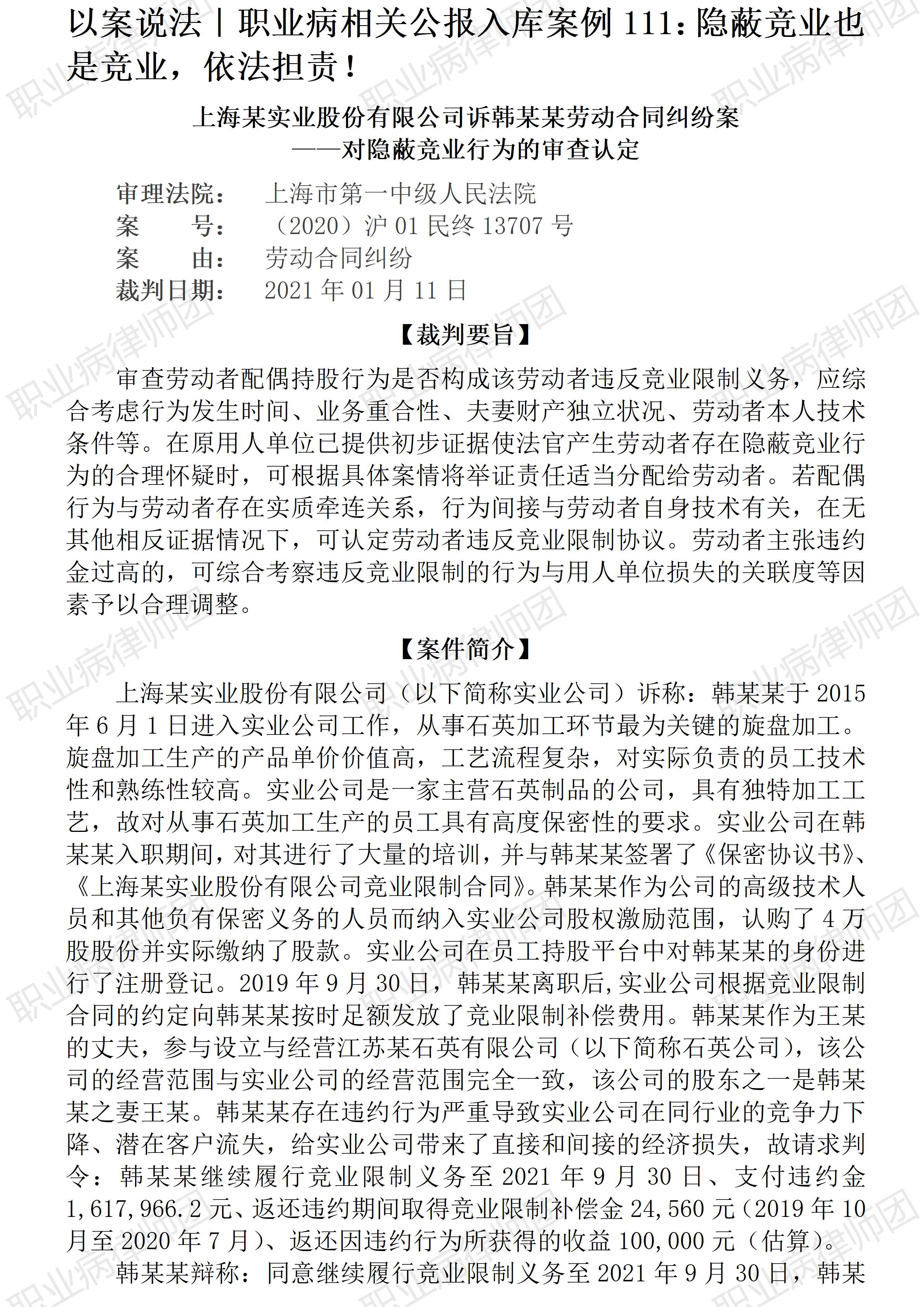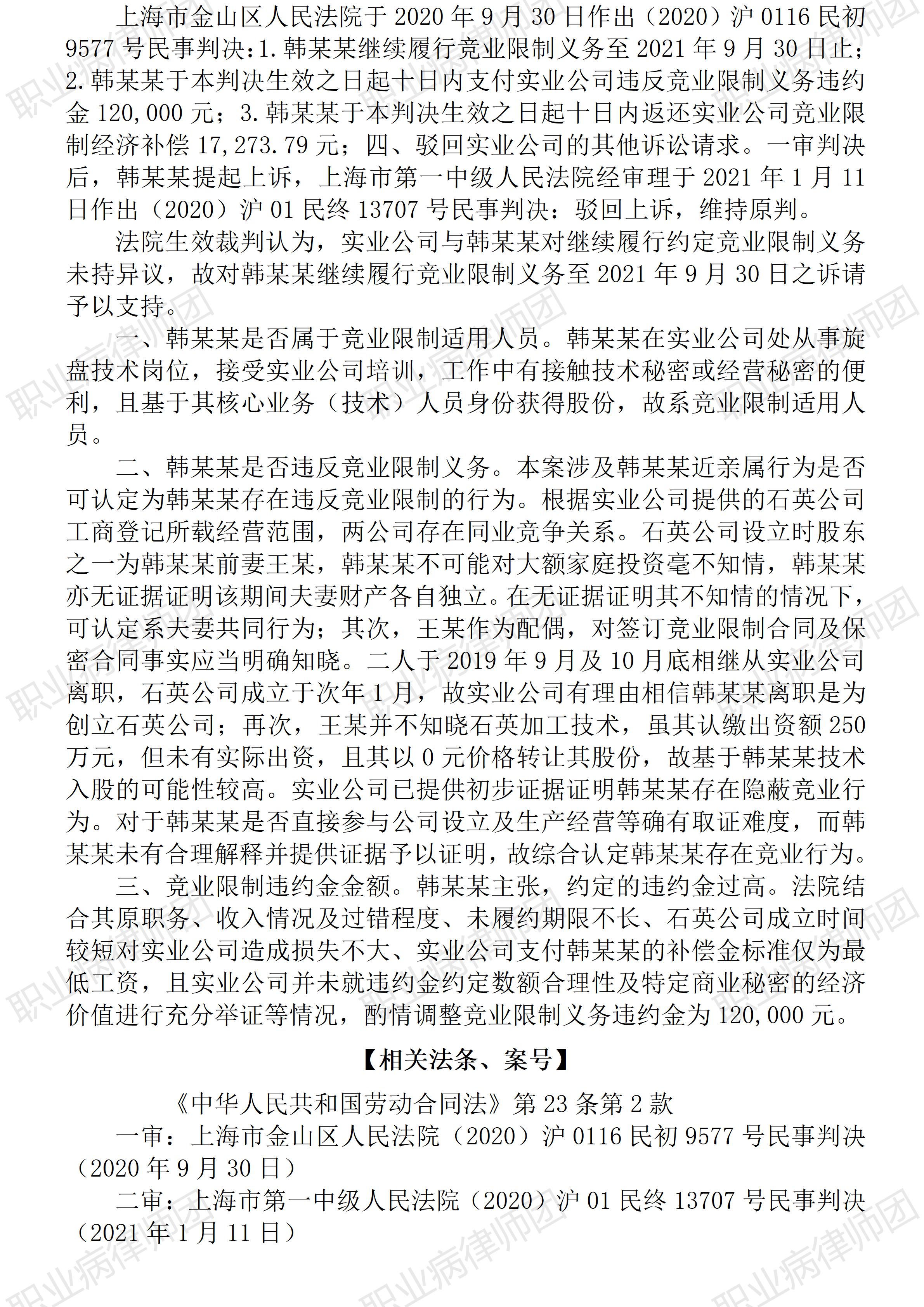 本案案号:(2020)沪01民终13707号 入库编号:2023-07-2-186-001 案例编号:5.1.111 OCA111 【案件简介】 【律师说法】 本案是一宗涉及劳动者通过具有紧密关系的人员规避竞业限制义务引发纠纷的典型案例。 一般意义上的竞业限制,是劳动者离开原用人单位后,本人通过再就业入职新的用人单位或者设立企业等形式从事与原用人单位存在竞争性生产经营业务的情形,由于劳动者本人再就业机会受限,原可依赖的劳动技能、经验受限,必然导致其后续生活、工作带来困难,原用人单位应当支付相应的经济补偿金,由此形成竞业限制关系和相应的权利义务。 但本案则呈现了与上述普通情形大为不同的隐蔽竞业形式,即劳动者本人并不直接入职或者设立企业从事与原用人单位存在竞争性业务,而是绕过这一显而易见的形式约束,转而通过与本人具有特殊紧密关系的人员,逐步实施事实上依然有违竞业限制约定的行为,这其实是一种相对更为隐蔽今后也更为常见的违反竞业限制义务的情形。毕竟,需要履行竞业限制义务的人,往往是拥有独特技能、专长因而对原用人单位核心竞争优势构成相当威胁的人,也正因此这一类劳动者通常在原用人单位就能获得相对较高的劳动报酬,从而也就具有了避免本人直接从事、转而通过配偶、父母子女等具有特殊紧密关系的人员实施突破竞业限制的行为。——到这一步,原有一般意义上的劳动者,其实也悄然转变为与原用人单位所有者相同意义上的非劳动者了。因此,与本人直接从事违反竞业限制的行为相比,这种隐蔽竞业的实施人员相对更应理解和遵守竞业限制的本义,因而也更应承担违约责任;虽然,竞业限制对所有相关劳动者的约束、不便乃至利益减损都是相同的,但毕竟二者在资源、条件等方面所存在的量的差异已经显见。 本案提示劳动者,竞业限制对劳资双方都有约束,任何一方违约均须承担相应违约责任,无论是本人,还是通过家人等其他具有紧密关系的人员实施违反竞业限制的行为,都同样可能触发竞业限制违约责任。 本案同时也提示用人单位,竞业限制违约责任的约定以及因违反竞业限制而诉求违约责任乃至损害赔偿时,应当充分考量相关违约责任约定的合理性,包括劳动者原有工资待遇实际水平、给本单位实际造成的损失程度等,而对于违反竞业限制行为给本单位造成的具体损失,是需要有足够的证据支撑的,不能简单随意提个数字就行了。(2026/1/22 16:17) 【收官】“职业病法律”公众号全部推文汇总(501-1000) 管仕武|关于《职业病诊断与鉴定管理办法》与《职业病防治法》冲突的审查建议 |