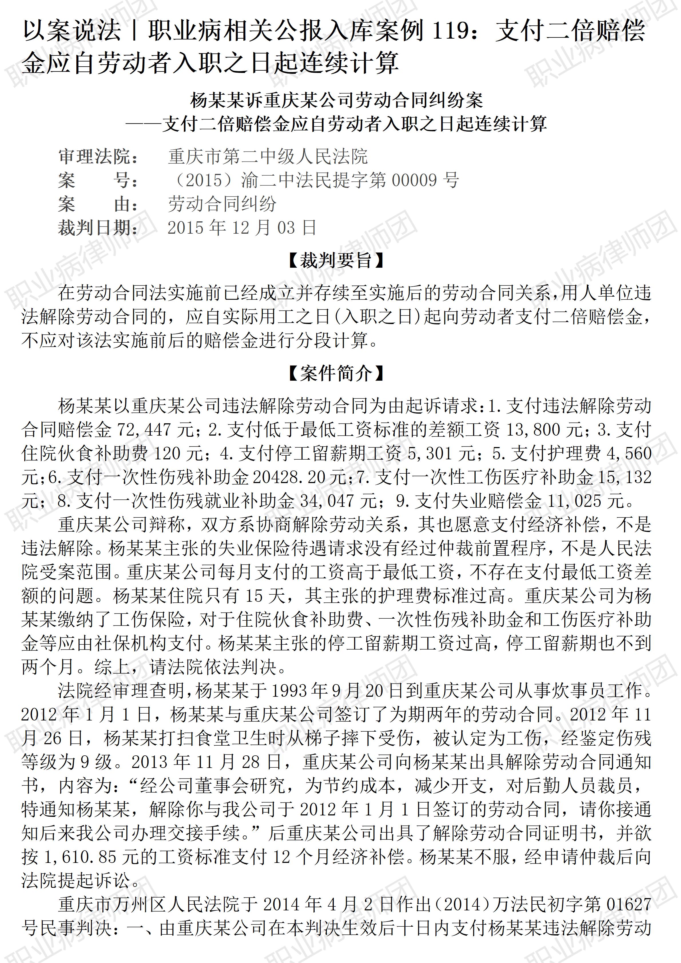 以案说法386|职业病相关公报入库案例119:支付二倍赔偿金应自劳动者入职之日起连续计算 本案案号:(2015)渝二中法民提字第00009号 入库编号:2023-16-2-186-003 案例编号:5.1.119 OCA119 【案件简介】 【律师说法】 本案是一宗涉及用人单位违法解除赔偿金的起算年限的典型案例。 案涉用人单位主张其并非违法解除,而是因为要节约成本、减少开支,由于本案经过了再审,再审期间用人单位将解除理由改为劳动者遭受工伤不再适合原工种。但其前后主张的两种解除理由,均不符合《劳动合同法》第三十九条所规定的可无偿解除劳动合同的情形,用人单位节约成本、减少开支不能以直接辞退劳动者为方向,而劳动者即使遭受工伤,也并不必然不适合原工作,何况,除非劳动合同到期依法终止,用人单位对工伤职工更应保障其劳动关系的稳定。因此,案涉用人单位解除当事劳动者实属违法。 而本案最大的争议焦点在于,劳动者在《劳动合同法》生效之前入职,用人单位强调即使要支付赔偿金,也只应从《劳动合同法》生效后起算支付年限。生效裁判最终否定了用人单位的这种主张,认定应当自劳动者实际入职之日起连续计算用人单位违法解除劳动合同所产生的二倍赔偿金。对此,分析相关法律法规规定,其实不难看出生效裁判的准确理解: 《劳动合同法》(2012修正)第八十七条规定: 第八十七条 用人单位违反本法规定解除或者终止劳动合同的,应当依照本法第四十七条规定的经济补偿标准的二倍向劳动者支付赔偿金。 《劳动合同法实施条例》(国务院令第535号)第二十五条进一步明确: 第二十五条 用人单位违反劳动合同法的规定解除或者终止劳动合同,依照劳动合同法第八十七条的规定支付了赔偿金的,不再支付经济补偿。赔偿金的计算年限自用工之日起计算。 至于案涉用人单位强调的《劳动合同法》第九十七条第三款的规定,原本是针对支付经济补偿金的情形,即用人单位合法终止劳动关系且不存在过错的情形,而本案系用人单位违法解除,过错显而易见,所应承担的赔偿金标准则应直接适用《劳动合同法》第八十七条。 因此,本案生效裁判抓住了用人单位违法解除的过错性这一关键性特征,既明确固定了应予适用的法条依据,也自然排除了“法不溯及既往”的法律适用原则:对违法行为而言,相关法律能否适用,关键是看违法行为发生的时间,而不是与违法行为相关的其他法律关系的发生时间。(2026/1/24 18:05) 【收官】“职业病法律”公众号全部推文汇总(501-1000) 管仕武|关于《职业病诊断与鉴定管理办法》与《职业病防治法》冲突的审查建议 |