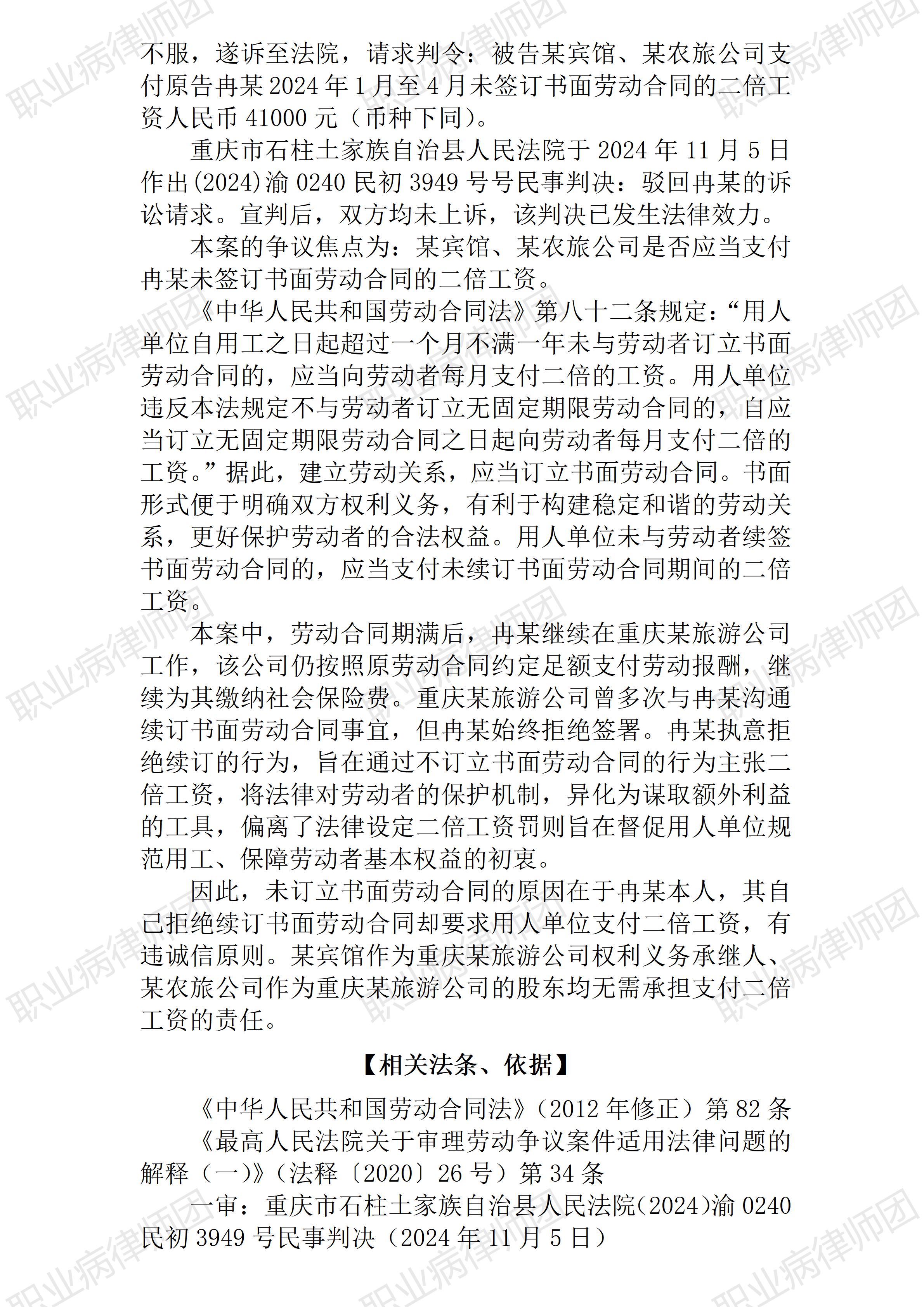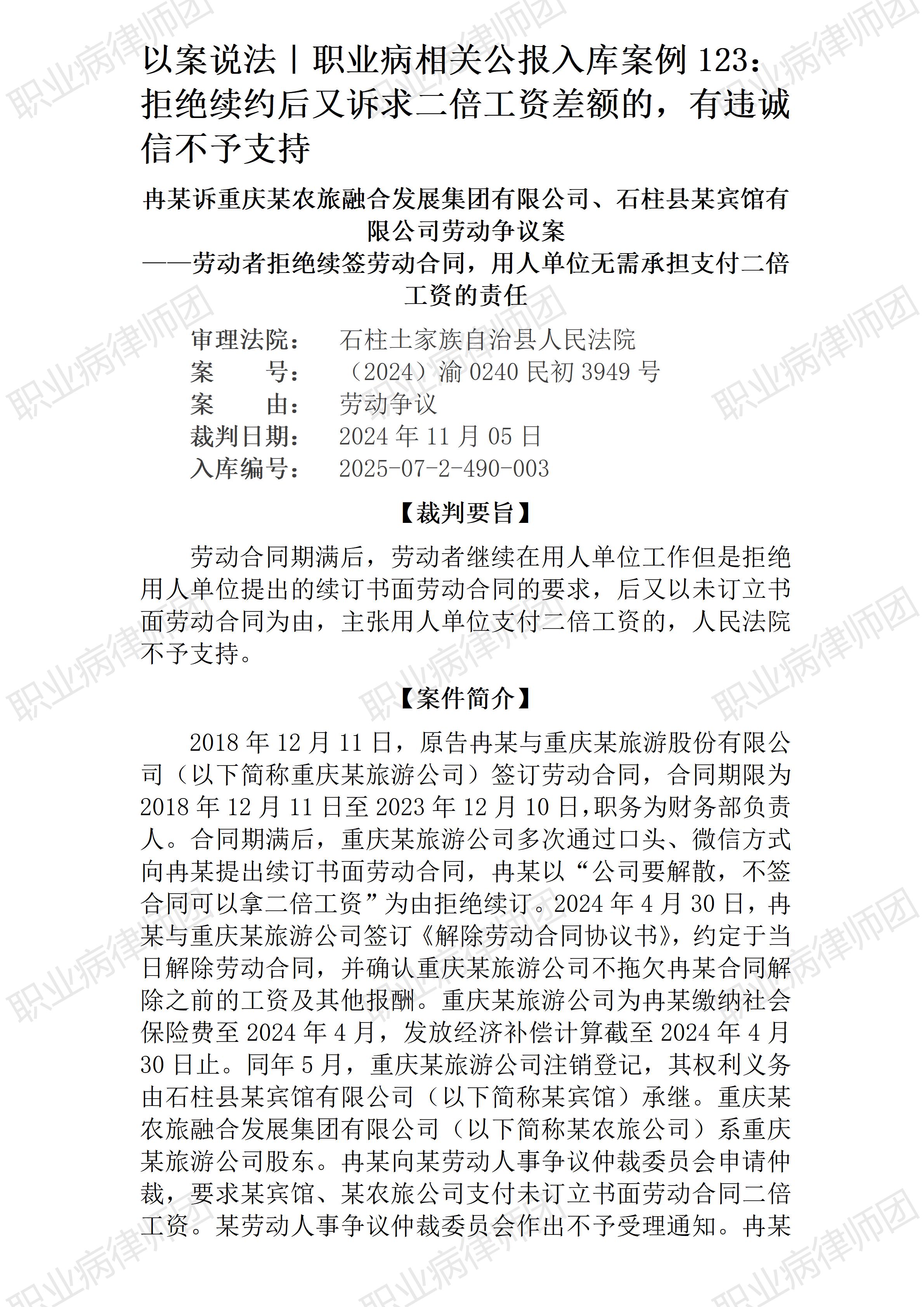 (天津滨海机场) 以案说法390|职业病相关公报入库案例123:拒绝续约后又诉求二倍工资差额的,有违诚信不予支持 本案案号:(2024)渝0240民初3949号 入库编号:2025-07-2-490-003 案例编号:5.1.123 OCA123 【案件简介】 【律师说法】 本案是一宗涉及劳动者诉求未续签书面劳动合同的二倍工资差额的典型案例。 案情并不复杂,案涉劳动者的诉求不少金额也不小,但最终诉求被法院一审全部驳回,从公开的裁判文书信息来看,双方均未上诉,似乎可以推测案涉劳动者也自知理亏,理性地放弃了继续缠讼。 根据法院查明的事实,案涉劳动者所供职的原用人单位因改制而发生主体变化,也通过微信方式提示员工续签劳动合同,但案涉劳动者表示不续签,因为其认为“公司决定解散”“签了也是终止”,但事后却仍然诉求未签书面劳动合同的二倍工资差额,显然前后矛盾。 关于未签订书面劳动合同所产生的二倍工资差额,《劳动合同法》(2012修正)是这样规定的: 第八十二条用人单位自用工之日起超过一个月不满一年未与劳动者订立书面劳动合同的,应当向劳动者每月支付二倍的工资。 用人单位违反本法规定不与劳动者订立无固定期限劳动合同的,自应当订立无固定期限劳动合同之日起向劳动者每月支付二倍的工资。 二倍工资差额的支付主体是用人单位,支付义务发生的条件是用人单位应当签订书面劳动合同而未与(也许是疏漏)、不与(可能是故意)劳动者签订或者续签书面劳动合同。所以,用人单位没有、或者拒绝签订是支付二倍工资差额此项义务发生的前提,而并不是只要双方未签订书面劳动合同即发生支付二倍工资差额的义务。《劳动合同法》第八十二条规定的支付义务,只是针对用人单位违法未予签订书面劳动合同,而并没有针对由于劳动者的原因导致未能签订书面劳动合同的情形。但劳动合同的签订是劳资双方共同相向行为才能完成,导致未能签订书面劳动合同的原因,既有可能是用人单位,也有可能是劳动者。如果是劳动者的原因导致未能签订书面劳动合同,此时,用人单位则并不当然承担支付二倍工资差额的义务。否则,法律就变成强人所难,失去合理性了。 本案提示劳动者,虽然劳动和社会保障相关法律法规都具有优先保护劳动者合法权益的基本要求,用人单位也责无旁贷;但凡事需要讲究合理、公允,对于法律明确赋予用人单位的相关义务,客观上需要劳动者配合才能履行的,劳动者及时、充分配合是题中应有之义,而诚实守信是一切民事行为最基本的要求。不然,明明主动选择不去续签书面劳动合同,事后又反过来诉求二倍工资差额,如此行为,不仅于法不符,也于理不合。如果都这样行为,最终影响的劳动者整体的信誉利益。(2026/1/28 15:29) 【收官】“职业病法律”公众号全部推文汇总(501-1000) 成功案例|一裁终局!职业性尘肺病七级伤残患者获工伤待遇补差近20万元 管仕武|关于《职业病诊断与鉴定管理办法》与《职业病防治法》冲突的审查建议 |